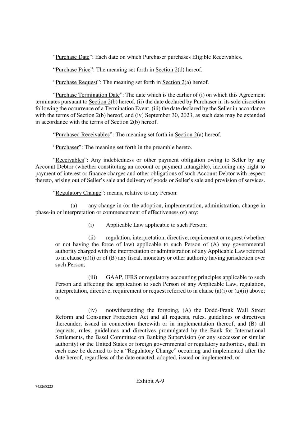 Exhibit A-9 745268223 “Purchase Date”: Each date on which Purchaser purchases Eligible Receivables. “Purchase Price”: The meaning set forth in Section 2(d) hereof. “Purchase Request”: The meaning set forth in Section 2(a) hereof. “Purchase Termination Date”: The date which is the earlier of (i) on which this Agreement terminates pursuant to Section 2(b) hereof, (ii) the date declared by Purchaser in its sole discretion following the occurrence of a Termination Event, (iii) the date declared by the Seller in accordance with the terms of Section 2(b) hereof, and (iv) September 30, 2023, as such date may be extended in accordance with the terms of Section 2(b) hereof. “Purchased Receivables”: The meaning set forth in Section 2(a) hereof. “Purchaser”: The meaning set forth in the preamble hereto. “Receivables”: Any indebtedness or other payment obligation owing to Seller by any Account Debtor (whether constituting an account or payment intangible), including any right to payment of interest or finance charges and other obligations of such Account Debtor with respect thereto, arising out of Seller’s sale and delivery of goods or Seller’s sale and provision of services. “Regulatory Change”: means, relative to any Person: (a) any change in (or the adoption, implementation, administration, change in phase-in or interpretation or commencement of effectiveness of) any: (i) Applicable Law applicable to such Person; (ii) regulation, interpretation, directive, requirement or request (whether or not having the force of law) applicable to such Person of (A) any governmental authority charged with the interpretation or administration of any Applicable Law referred to in clause (a)(i) or of (B) any fiscal, monetary or other authority having jurisdiction over such Person; (iii) GAAP, IFRS or regulatory accounting principles applicable to such Person and affecting the application to such Person of any Applicable Law, regulation, interpretation, directive, requirement or request referred to in clause (a)(i) or (a)(ii) above; or (iv) notwithstanding the forgoing, (A) the Dodd-Frank Wall Street Reform and Consumer Protection Act and all requests, rules, guidelines or directives thereunder, issued in connection therewith or in implementation thereof, and (B) all requests, rules, guidelines and directives promulgated by the Bank for International Settlements, the Basel Committee on Banking Supervision (or any successor or similar authority) or the United States or foreign governmental or regulatory authorities, shall in each case be deemed to be a “Regulatory Change” occurring and implemented after the date hereof, regardless of the date enacted, adopted, issued or implemented; or