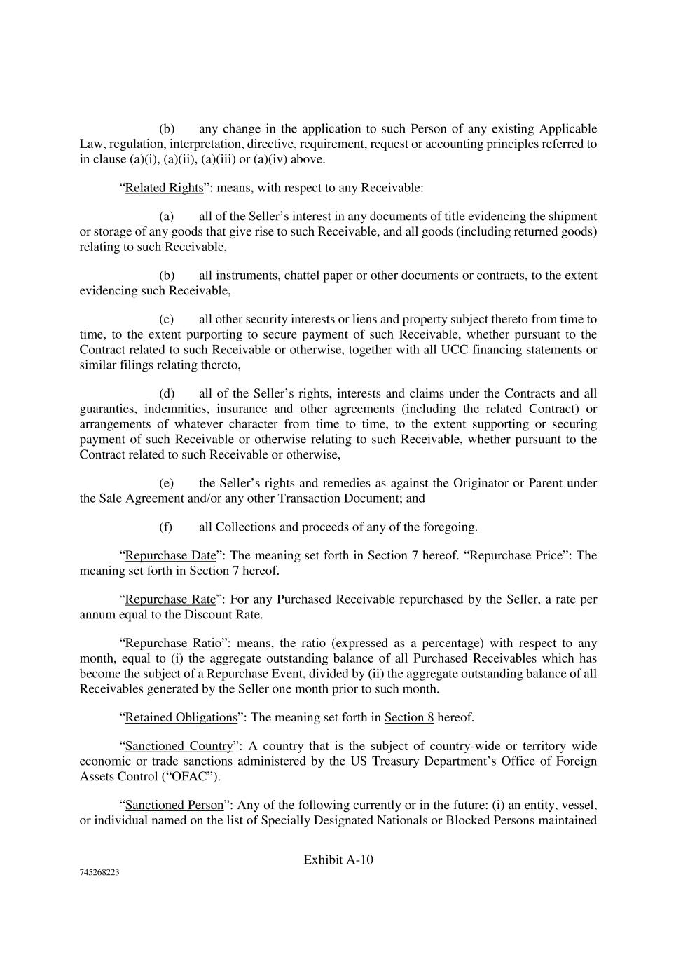 Exhibit A-10 745268223 (b) any change in the application to such Person of any existing Applicable Law, regulation, interpretation, directive, requirement, request or accounting principles referred to in clause (a)(i), (a)(ii), (a)(iii) or (a)(iv) above. “Related Rights”: means, with respect to any Receivable: (a) all of the Seller’s interest in any documents of title evidencing the shipment or storage of any goods that give rise to such Receivable, and all goods (including returned goods) relating to such Receivable, (b) all instruments, chattel paper or other documents or contracts, to the extent evidencing such Receivable, (c) all other security interests or liens and property subject thereto from time to time, to the extent purporting to secure payment of such Receivable, whether pursuant to the Contract related to such Receivable or otherwise, together with all UCC financing statements or similar filings relating thereto, (d) all of the Seller’s rights, interests and claims under the Contracts and all guaranties, indemnities, insurance and other agreements (including the related Contract) or arrangements of whatever character from time to time, to the extent supporting or securing payment of such Receivable or otherwise relating to such Receivable, whether pursuant to the Contract related to such Receivable or otherwise, (e) the Seller’s rights and remedies as against the Originator or Parent under the Sale Agreement and/or any other Transaction Document; and (f) all Collections and proceeds of any of the foregoing. “Repurchase Date”: The meaning set forth in Section 7 hereof. “Repurchase Price”: The meaning set forth in Section 7 hereof. “Repurchase Rate”: For any Purchased Receivable repurchased by the Seller, a rate per annum equal to the Discount Rate. “Repurchase Ratio”: means, the ratio (expressed as a percentage) with respect to any month, equal to (i) the aggregate outstanding balance of all Purchased Receivables which has become the subject of a Repurchase Event, divided by (ii) the aggregate outstanding balance of all Receivables generated by the Seller one month prior to such month. “Retained Obligations”: The meaning set forth in Section 8 hereof. “Sanctioned Country”: A country that is the subject of country-wide or territory wide economic or trade sanctions administered by the US Treasury Department’s Office of Foreign Assets Control (“OFAC”). “Sanctioned Person”: Any of the following currently or in the future: (i) an entity, vessel, or individual named on the list of Specially Designated Nationals or Blocked Persons maintained