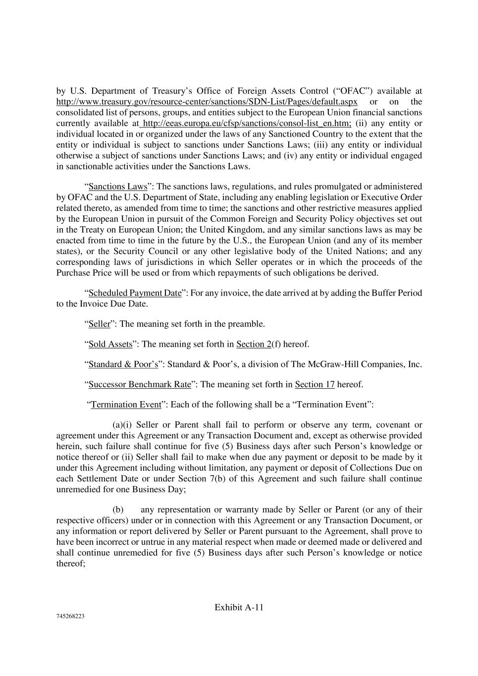 Exhibit A-11 745268223 by U.S. Department of Treasury’s Office of Foreign Assets Control (“OFAC”) available at http://www.treasury.gov/resource-center/sanctions/SDN-List/Pages/default.aspx or on the consolidated list of persons, groups, and entities subject to the European Union financial sanctions currently available at http://eeas.europa.eu/cfsp/sanctions/consol-list_en.htm; (ii) any entity or individual located in or organized under the laws of any Sanctioned Country to the extent that the entity or individual is subject to sanctions under Sanctions Laws; (iii) any entity or individual otherwise a subject of sanctions under Sanctions Laws; and (iv) any entity or individual engaged in sanctionable activities under the Sanctions Laws. “Sanctions Laws”: The sanctions laws, regulations, and rules promulgated or administered by OFAC and the U.S. Department of State, including any enabling legislation or Executive Order related thereto, as amended from time to time; the sanctions and other restrictive measures applied by the European Union in pursuit of the Common Foreign and Security Policy objectives set out in the Treaty on European Union; the United Kingdom, and any similar sanctions laws as may be enacted from time to time in the future by the U.S., the European Union (and any of its member states), or the Security Council or any other legislative body of the United Nations; and any corresponding laws of jurisdictions in which Seller operates or in which the proceeds of the Purchase Price will be used or from which repayments of such obligations be derived. “Scheduled Payment Date”: For any invoice, the date arrived at by adding the Buffer Period to the Invoice Due Date. “Seller”: The meaning set forth in the preamble. “Sold Assets”: The meaning set forth in Section 2(f) hereof. “Standard & Poor’s”: Standard & Poor’s, a division of The McGraw-Hill Companies, Inc. “Successor Benchmark Rate”: The meaning set forth in Section 17 hereof. “Termination Event”: Each of the following shall be a “Termination Event”: (a)(i) Seller or Parent shall fail to perform or observe any term, covenant or agreement under this Agreement or any Transaction Document and, except as otherwise provided herein, such failure shall continue for five (5) Business days after such Person’s knowledge or notice thereof or (ii) Seller shall fail to make when due any payment or deposit to be made by it under this Agreement including without limitation, any payment or deposit of Collections Due on each Settlement Date or under Section 7(b) of this Agreement and such failure shall continue unremedied for one Business Day; (b) any representation or warranty made by Seller or Parent (or any of their respective officers) under or in connection with this Agreement or any Transaction Document, or any information or report delivered by Seller or Parent pursuant to the Agreement, shall prove to have been incorrect or untrue in any material respect when made or deemed made or delivered and shall continue unremedied for five (5) Business days after such Person’s knowledge or notice thereof;
