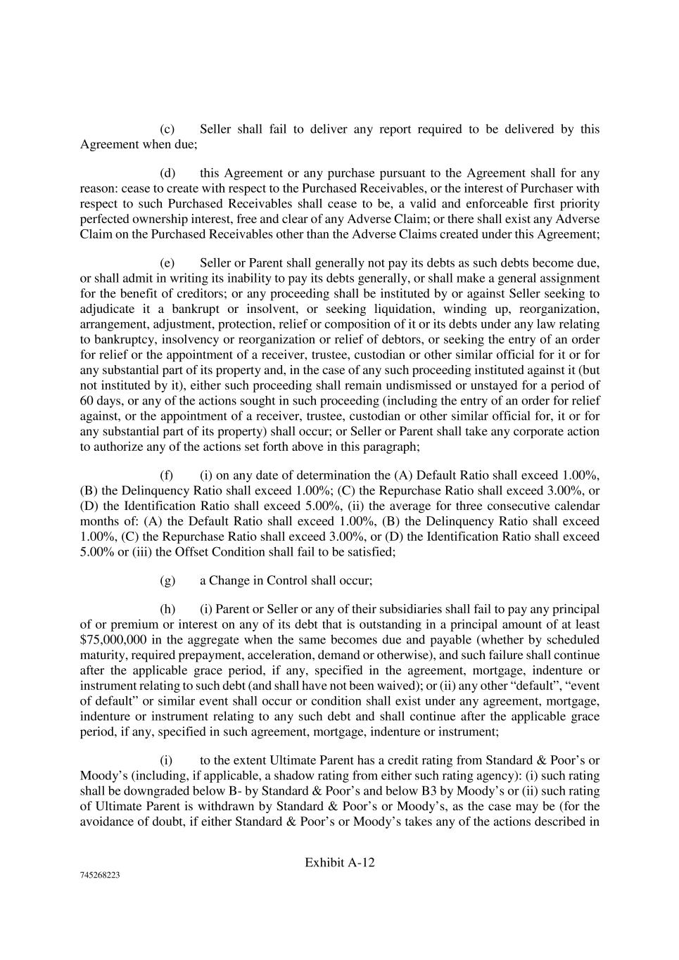 Exhibit A-12 745268223 (c) Seller shall fail to deliver any report required to be delivered by this Agreement when due; (d) this Agreement or any purchase pursuant to the Agreement shall for any reason: cease to create with respect to the Purchased Receivables, or the interest of Purchaser with respect to such Purchased Receivables shall cease to be, a valid and enforceable first priority perfected ownership interest, free and clear of any Adverse Claim; or there shall exist any Adverse Claim on the Purchased Receivables other than the Adverse Claims created under this Agreement; (e) Seller or Parent shall generally not pay its debts as such debts become due, or shall admit in writing its inability to pay its debts generally, or shall make a general assignment for the benefit of creditors; or any proceeding shall be instituted by or against Seller seeking to adjudicate it a bankrupt or insolvent, or seeking liquidation, winding up, reorganization, arrangement, adjustment, protection, relief or composition of it or its debts under any law relating to bankruptcy, insolvency or reorganization or relief of debtors, or seeking the entry of an order for relief or the appointment of a receiver, trustee, custodian or other similar official for it or for any substantial part of its property and, in the case of any such proceeding instituted against it (but not instituted by it), either such proceeding shall remain undismissed or unstayed for a period of 60 days, or any of the actions sought in such proceeding (including the entry of an order for relief against, or the appointment of a receiver, trustee, custodian or other similar official for, it or for any substantial part of its property) shall occur; or Seller or Parent shall take any corporate action to authorize any of the actions set forth above in this paragraph; (f) (i) on any date of determination the (A) Default Ratio shall exceed 1.00%, (B) the Delinquency Ratio shall exceed 1.00%; (C) the Repurchase Ratio shall exceed 3.00%, or (D) the Identification Ratio shall exceed 5.00%, (ii) the average for three consecutive calendar months of: (A) the Default Ratio shall exceed 1.00%, (B) the Delinquency Ratio shall exceed 1.00%, (C) the Repurchase Ratio shall exceed 3.00%, or (D) the Identification Ratio shall exceed 5.00% or (iii) the Offset Condition shall fail to be satisfied; (g) a Change in Control shall occur; (h) (i) Parent or Seller or any of their subsidiaries shall fail to pay any principal of or premium or interest on any of its debt that is outstanding in a principal amount of at least $75,000,000 in the aggregate when the same becomes due and payable (whether by scheduled maturity, required prepayment, acceleration, demand or otherwise), and such failure shall continue after the applicable grace period, if any, specified in the agreement, mortgage, indenture or instrument relating to such debt (and shall have not been waived); or (ii) any other “default”, “event of default” or similar event shall occur or condition shall exist under any agreement, mortgage, indenture or instrument relating to any such debt and shall continue after the applicable grace period, if any, specified in such agreement, mortgage, indenture or instrument; (i) to the extent Ultimate Parent has a credit rating from Standard & Poor’s or Moody’s (including, if applicable, a shadow rating from either such rating agency): (i) such rating shall be downgraded below B- by Standard & Poor’s and below B3 by Moody’s or (ii) such rating of Ultimate Parent is withdrawn by Standard & Poor’s or Moody’s, as the case may be (for the avoidance of doubt, if either Standard & Poor’s or Moody’s takes any of the actions described in