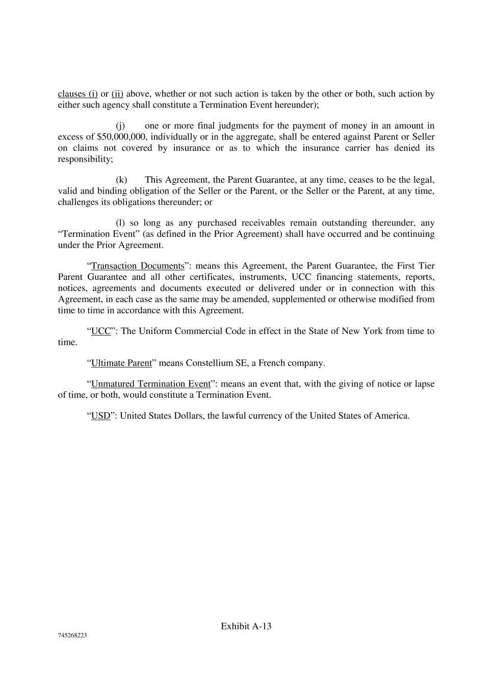 Exhibit A-13 745268223 clauses (i) or (ii) above, whether or not such action is taken by the other or both, such action by either such agency shall constitute a Termination Event hereunder); (j) one or more final judgments for the payment of money in an amount in excess of $50,000,000, individually or in the aggregate, shall be entered against Parent or Seller on claims not covered by insurance or as to which the insurance carrier has denied its responsibility; (k) This Agreement, the Parent Guarantee, at any time, ceases to be the legal, valid and binding obligation of the Seller or the Parent, or the Seller or the Parent, at any time, challenges its obligations thereunder; or (l) so long as any purchased receivables remain outstanding thereunder, any “Termination Event” (as defined in the Prior Agreement) shall have occurred and be continuing under the Prior Agreement. “Transaction Documents”: means this Agreement, the Parent Guarantee, the First Tier Parent Guarantee and all other certificates, instruments, UCC financing statements, reports, notices, agreements and documents executed or delivered under or in connection with this Agreement, in each case as the same may be amended, supplemented or otherwise modified from time to time in accordance with this Agreement. “UCC”: The Uniform Commercial Code in effect in the State of New York from time to time. “Ultimate Parent” means Constellium SE, a French company. “Unmatured Termination Event”: means an event that, with the giving of notice or lapse of time, or both, would constitute a Termination Event. “USD”: United States Dollars, the lawful currency of the United States of America.