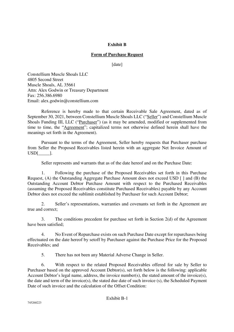 Exhibit B-1 745268223 Exhibit B Form of Purchase Request [date] Constellium Muscle Shoals LLC 4805 Second Street Muscle Shoals, AL 35661 Attn: Alex Godwin or Treasury Department Fax: 256.386.6980 Email: alex.godwin@constellium.com Reference is hereby made to that certain Receivable Sale Agreement, dated as of September 30, 2021, between Constellium Muscle Shoals LLC (“Seller”) and Constellium Muscle Shoals Funding III, LLC (“Purchaser”) (as it may be amended, modified or supplemented from time to time, the “Agreement”; capitalized terms not otherwise defined herein shall have the meanings set forth in the Agreement). Pursuant to the terms of the Agreement, Seller hereby requests that Purchaser purchase from Seller the Proposed Receivables listed herein with an aggregate Net Invoice Amount of USD[_____]. Seller represents and warrants that as of the date hereof and on the Purchase Date: 1. Following the purchase of the Proposed Receivables set forth in this Purchase Request, (A) the Outstanding Aggregate Purchase Amount does not exceed USD [ ] and (B) the Outstanding Account Debtor Purchase Amount with respect to the Purchased Receivables (assuming the Proposed Receivables constitute Purchased Receivables) payable by any Account Debtor does not exceed the sublimit established by Purchaser for such Account Debtor; 2. Seller’s representations, warranties and covenants set forth in the Agreement are true and correct; 3. The conditions precedent for purchase set forth in Section 2(d) of the Agreement have been satisfied; 4. No Event of Repurchase exists on such Purchase Date except for repurchases being effectuated on the date hereof by setoff by Purchaser against the Purchase Price for the Proposed Receivables; and 5. There has not been any Material Adverse Change in Seller. 6. With respect to the related Proposed Receivables offered for sale by Seller to Purchaser based on the approved Account Debtor(s), set forth below is the following: applicable Account Debtor’s legal name, address, the invoice number(s), the stated amount of the invoice(s), the date and term of the invoice(s), the stated due date of such invoice (s), the Scheduled Payment Date of such invoice and the calculation of the Offset Condition: