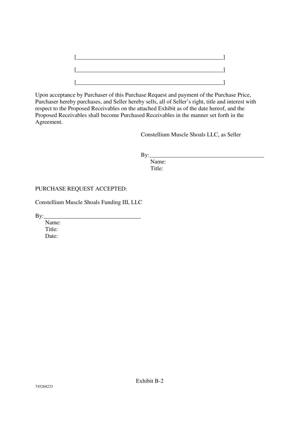 Exhibit B-2 745268223 [__________________________________________________] [__________________________________________________] [__________________________________________________] Upon acceptance by Purchaser of this Purchase Request and payment of the Purchase Price, Purchaser hereby purchases, and Seller hereby sells, all of Seller’s right, title and interest with respect to the Proposed Receivables on the attached Exhibit as of the date hereof, and the Proposed Receivables shall become Purchased Receivables in the manner set forth in the Agreement. Constellium Muscle Shoals LLC, as Seller By: _______________________________________ Name: Title: PURCHASE REQUEST ACCEPTED: Constellium Muscle Shoals Funding III, LLC By: Name: Title: Date:
