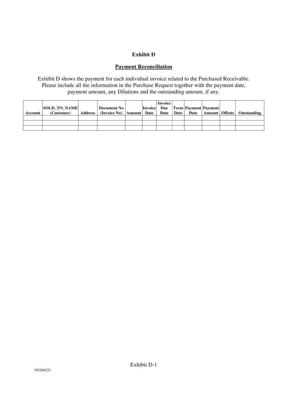 Exhibit D-1 745268223 Exhibit D Payment Reconciliation Exhibit D shows the payment for each individual invoice related to the Purchased Receivable. Please include all the information in the Purchase Request together with the payment date, payment amount, any Dilutions and the outstanding amount, if any. Account SOLD_TO_NAME (Customer) Address Document No (Invoice No) Amount Invoice Date Invoice Due Date Term Date Payment Date Payment Amount Offsets Outstanding