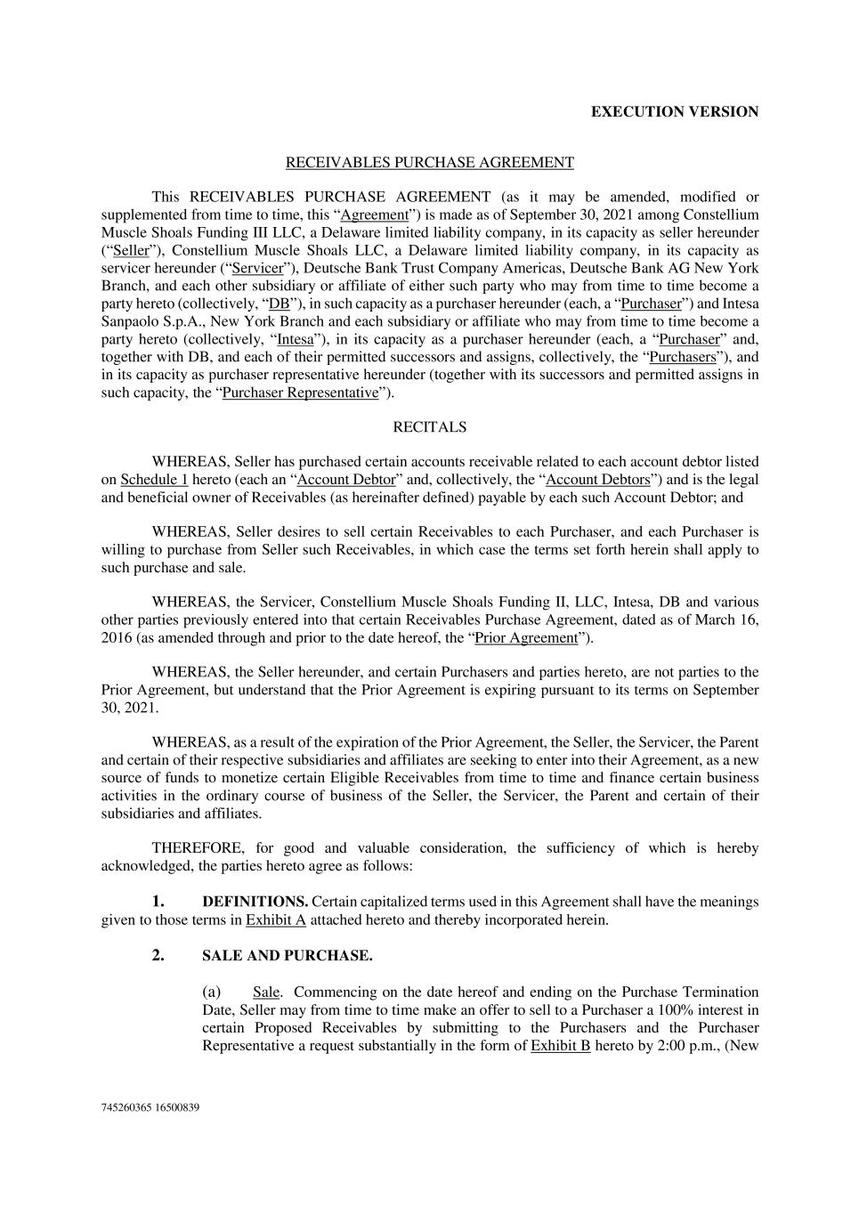 EXECUTION VERSION 745260365 16500839 RECEIVABLES PURCHASE AGREEMENT This RECEIVABLES PURCHASE AGREEMENT (as it may be amended, modified or supplemented from time to time, this “Agreement”) is made as of September 30, 2021 among Constellium Muscle Shoals Funding III LLC, a Delaware limited liability company, in its capacity as seller hereunder (“Seller”), Constellium Muscle Shoals LLC, a Delaware limited liability company, in its capacity as servicer hereunder (“Servicer”), Deutsche Bank Trust Company Americas, Deutsche Bank AG New York Branch, and each other subsidiary or affiliate of either such party who may from time to time become a party hereto (collectively, “DB”), in such capacity as a purchaser hereunder (each, a “Purchaser”) and Intesa Sanpaolo S.p.A., New York Branch and each subsidiary or affiliate who may from time to time become a party hereto (collectively, “Intesa”), in its capacity as a purchaser hereunder (each, a “Purchaser” and, together with DB, and each of their permitted successors and assigns, collectively, the “Purchasers”), and in its capacity as purchaser representative hereunder (together with its successors and permitted assigns in such capacity, the “Purchaser Representative”). RECITALS WHEREAS, Seller has purchased certain accounts receivable related to each account debtor listed on Schedule 1 hereto (each an “Account Debtor” and, collectively, the “Account Debtors”) and is the legal and beneficial owner of Receivables (as hereinafter defined) payable by each such Account Debtor; and WHEREAS, Seller desires to sell certain Receivables to each Purchaser, and each Purchaser is willing to purchase from Seller such Receivables, in which case the terms set forth herein shall apply to such purchase and sale. WHEREAS, the Servicer, Constellium Muscle Shoals Funding II, LLC, Intesa, DB and various other parties previously entered into that certain Receivables Purchase Agreement, dated as of March 16, 2016 (as amended through and prior to the date hereof, the “Prior Agreement”). WHEREAS, the Seller hereunder, and certain Purchasers and parties hereto, are not parties to the Prior Agreement, but understand that the Prior Agreement is expiring pursuant to its terms on September 30, 2021. WHEREAS, as a result of the expiration of the Prior Agreement, the Seller, the Servicer, the Parent and certain of their respective subsidiaries and affiliates are seeking to enter into their Agreement, as a new source of funds to monetize certain Eligible Receivables from time to time and finance certain business activities in the ordinary course of business of the Seller, the Servicer, the Parent and certain of their subsidiaries and affiliates. THEREFORE, for good and valuable consideration, the sufficiency of which is hereby acknowledged, the parties hereto agree as follows: 1. DEFINITIONS. Certain capitalized terms used in this Agreement shall have the meanings given to those terms in Exhibit A attached hereto and thereby incorporated herein. 2. SALE AND PURCHASE. (a) Sale. Commencing on the date hereof and ending on the Purchase Termination Date, Seller may from time to time make an offer to sell to a Purchaser a 100% interest in certain Proposed Receivables by submitting to the Purchasers and the Purchaser Representative a request substantially in the form of Exhibit B hereto by 2:00 p.m., (New