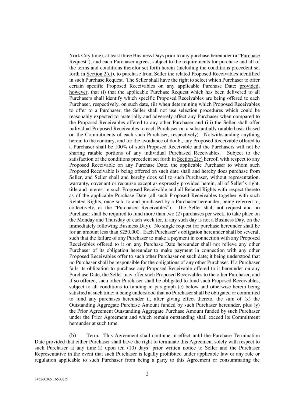 2 745260365 16500839 York City time), at least three Business Days prior to any purchase hereunder (a “Purchase Request”), and each Purchaser agrees, subject to the requirements for purchase and all of the terms and conditions therefor set forth herein (including the conditions precedent set forth in Section 2(c)), to purchase from Seller the related Proposed Receivables identified in such Purchase Request. The Seller shall have the right to select which Purchaser to offer certain specific Proposed Receivables on any applicable Purchase Date; provided, however, that (i) that the applicable Purchase Request which has been delivered to all Purchasers shall identify which specific Proposed Receivables are being offered to each Purchaser, respectively, on such date, (ii) when determining which Proposed Receivables to offer to a Purchaser, the Seller shall not use selection procedures which could be reasonably expected to materially and adversely affect any Purchaser when compared to the Proposed Receivables offered to any other Purchaser and (iii) the Seller shall offer individual Proposed Receivables to each Purchaser on a substantially ratable basis (based on the Commitments of each such Purchaser, respectively). Notwithstanding anything herein to the contrary, and for the avoidance of doubt, any Proposed Receivable offered to a Purchaser shall be 100% of such Proposed Receivable and the Purchasers will not be sharing ratable portions of any individual Purchased Receivables. Subject to the satisfaction of the conditions precedent set forth in Section 2(c) hereof, with respect to any Proposed Receivable on any Purchase Date, the applicable Purchaser to whom such Proposed Receivable is being offered on such date shall and hereby does purchase from Seller, and Seller shall and hereby does sell to such Purchaser, without representation, warranty, covenant or recourse except as expressly provided herein, all of Seller’s right, title and interest in such Proposed Receivable and all Related Rights with respect thereto as of the applicable Purchase Date (all such Proposed Receivables together with such Related Rights, once sold to and purchased by a Purchaser hereunder, being referred to, collectively, as the “Purchased Receivables”). The Seller shall not request and no Purchaser shall be required to fund more than two (2) purchases per week, to take place on the Monday and Thursday of each week (or, if any such day is not a Business Day, on the immediately following Business Day). No single request for purchase hereunder shall be for an amount less than $250,000. Each Purchaser’s obligation hereunder shall be several, such that the failure of any Purchaser to make a payment in connection with any Proposed Receivables offered to it on any Purchase Date hereunder shall not relieve any other Purchaser of its obligation hereunder to make payment in connection with any other Proposed Receivables offer to such other Purchaser on such date; it being understood that no Purchaser shall be responsible for the obligations of any other Purchaser. If a Purchaser fails its obligation to purchase any Proposed Receivable offered to it hereunder on any Purchase Date, the Seller may offer such Proposed Receivables to the other Purchaser, and if so offered, such other Purchaser shall be obligated to fund such Proposed Receivables, subject to all conditions to funding in paragraph (c) below and otherwise herein being satisfied at such time; it being understood that no Purchaser shall be obligated or committed to fund any purchases hereunder if, after giving effect thereto, the sum of (x) the Outstanding Aggregate Purchase Amount funded by such Purchaser hereunder, plus (y) the Prior Agreement Outstanding Aggregate Purchase Amount funded by such Purchaser under the Prior Agreement and which remain outstanding shall exceed its Commitment hereunder at such time. (b) Term. This Agreement shall continue in effect until the Purchase Termination Date provided that either Purchaser shall have the right to terminate this Agreement solely with respect to such Purchaser at any time (i) upon ten (10) days’ prior written notice to Seller and the Purchaser Representative in the event that such Purchaser is legally prohibited under applicable law or any rule or regulation applicable to such Purchaser from being a party to this Agreement or consummating the