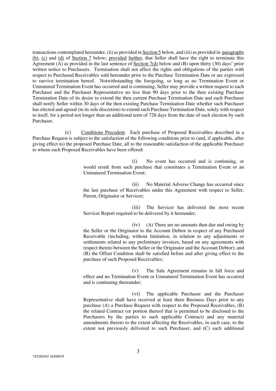 3 745260365 16500839 transactions contemplated hereunder, (ii) as provided in Section 5 below, and (iii) as provided in paragraphs (b), (c) and (d) of Section 7 below; provided further, that Seller shall have the right to terminate this Agreement (A) as provided in the last sentence of Section 7(d) below and (B) upon thirty (30) days’ prior written notice to Purchasers. Termination shall not affect the rights and obligations of the parties with respect to Purchased Receivables sold hereunder prior to the Purchase Termination Date or are expressed to survive termination hereof. Notwithstanding the foregoing, so long as no Termination Event or Unmatured Termination Event has occurred and is continuing, Seller may provide a written request to each Purchaser and the Purchaser Representative no less than 90 days prior to the then existing Purchase Termination Date of its desire to extend the then current Purchase Termination Date and each Purchaser shall notify Seller within 30 days of the then existing Purchase Termination Date whether such Purchaser has elected and agreed (in its sole discretion) to extend such Purchase Termination Date, solely with respect to itself, for a period not longer than an additional term of 728 days from the date of such election by such Purchaser. (c) Conditions Precedent. Each purchase of Proposed Receivables described in a Purchase Request is subject to the satisfaction of the following conditions prior to (and, if applicable, after giving effect to) the proposed Purchase Date, all to the reasonable satisfaction of the applicable Purchaser to whom such Proposed Receivables have been offered: (i) No event has occurred and is continuing, or would result from such purchase that constitutes a Termination Event or an Unmatured Termination Event; (ii) No Material Adverse Change has occurred since the last purchase of Receivables under this Agreement with respect to Seller, Parent, Originator or Servicer; (iii) The Servicer has delivered the most recent Servicer Report required to be delivered by it hereunder; (iv) (A) There are no amounts then due and owing by the Seller or the Originator to the Account Debtor in respect of any Purchased Receivable (including, without limitation, in relation to any adjustments or settlements related to any preliminary invoices, based on any agreements with respect thereto between the Seller or the Originator and the Account Debtor); and (B) the Offset Condition shall be satisfied before and after giving effect to the purchase of such Proposed Receivables; (v) The Sale Agreement remains in full force and effect and no Termination Event or Unmatured Termination Event has occurred and is continuing thereunder; (vi) The applicable Purchaser and the Purchaser Representative shall have received at least three Business Days prior to any purchase (A) a Purchase Request with respect to the Proposed Receivables, (B) the related Contract (or portion thereof that is permitted to be disclosed to the Purchasers by the parties to such applicable Contract) and any material amendments thereto to the extent affecting the Receivables, in each case, to the extent not previously delivered to such Purchaser, and (C) such additional
