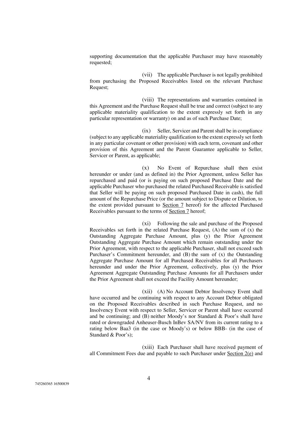 4 745260365 16500839 supporting documentation that the applicable Purchaser may have reasonably requested; (vii) The applicable Purchaser is not legally prohibited from purchasing the Proposed Receivables listed on the relevant Purchase Request; (viii) The representations and warranties contained in this Agreement and the Purchase Request shall be true and correct (subject to any applicable materiality qualification to the extent expressly set forth in any particular representation or warranty) on and as of such Purchase Date; (ix) Seller, Servicer and Parent shall be in compliance (subject to any applicable materiality qualification to the extent expressly set forth in any particular covenant or other provision) with each term, covenant and other provision of this Agreement and the Parent Guarantee applicable to Seller, Servicer or Parent, as applicable; (x) No Event of Repurchase shall then exist hereunder or under (and as defined in) the Prior Agreement, unless Seller has repurchased and paid (or is paying on such proposed Purchase Date and the applicable Purchaser who purchased the related Purchased Receivable is satisfied that Seller will be paying on such proposed Purchased Date in cash), the full amount of the Repurchase Price (or the amount subject to Dispute or Dilution, to the extent provided pursuant to Section 7 hereof) for the affected Purchased Receivables pursuant to the terms of Section 7 hereof; (xi) Following the sale and purchase of the Proposed Receivables set forth in the related Purchase Request, (A) the sum of (x) the Outstanding Aggregate Purchase Amount, plus (y) the Prior Agreement Outstanding Aggregate Purchase Amount which remain outstanding under the Prior Agreement, with respect to the applicable Purchaser, shall not exceed such Purchaser’s Commitment hereunder, and (B) the sum of (x) the Outstanding Aggregate Purchase Amount for all Purchased Receivables for all Purchasers hereunder and under the Prior Agreement, collectively, plus (y) the Prior Agreement Aggregate Outstanding Purchase Amounts for all Purchasers under the Prior Agreement shall not exceed the Facility Amount hereunder; (xii) (A) No Account Debtor Insolvency Event shall have occurred and be continuing with respect to any Account Debtor obligated on the Proposed Receivables described in such Purchase Request, and no Insolvency Event with respect to Seller, Servicer or Parent shall have occurred and be continuing; and (B) neither Moody’s nor Standard & Poor’s shall have rated or downgraded Anheuser-Busch InBev SA/NV from its current rating to a rating below Baa3 (in the case or Moody’s) or below BBB- (in the case of Standard & Poor’s); (xiii) Each Purchaser shall have received payment of all Commitment Fees due and payable to such Purchaser under Section 2(e) and