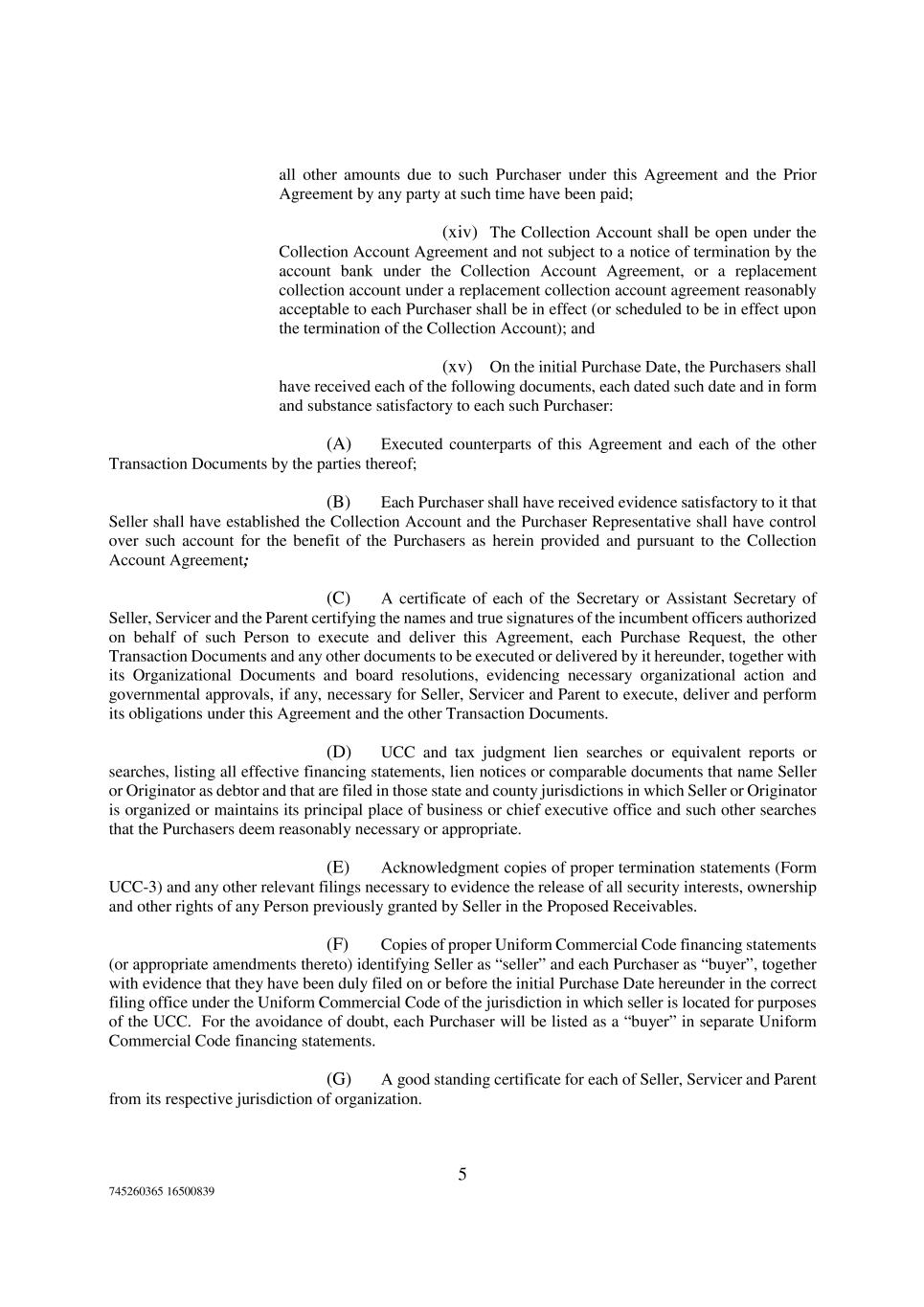 5 745260365 16500839 all other amounts due to such Purchaser under this Agreement and the Prior Agreement by any party at such time have been paid; (xiv) The Collection Account shall be open under the Collection Account Agreement and not subject to a notice of termination by the account bank under the Collection Account Agreement, or a replacement collection account under a replacement collection account agreement reasonably acceptable to each Purchaser shall be in effect (or scheduled to be in effect upon the termination of the Collection Account); and (xv) On the initial Purchase Date, the Purchasers shall have received each of the following documents, each dated such date and in form and substance satisfactory to each such Purchaser: (A) Executed counterparts of this Agreement and each of the other Transaction Documents by the parties thereof; (B) Each Purchaser shall have received evidence satisfactory to it that Seller shall have established the Collection Account and the Purchaser Representative shall have control over such account for the benefit of the Purchasers as herein provided and pursuant to the Collection Account Agreement; (C) A certificate of each of the Secretary or Assistant Secretary of Seller, Servicer and the Parent certifying the names and true signatures of the incumbent officers authorized on behalf of such Person to execute and deliver this Agreement, each Purchase Request, the other Transaction Documents and any other documents to be executed or delivered by it hereunder, together with its Organizational Documents and board resolutions, evidencing necessary organizational action and governmental approvals, if any, necessary for Seller, Servicer and Parent to execute, deliver and perform its obligations under this Agreement and the other Transaction Documents. (D) UCC and tax judgment lien searches or equivalent reports or searches, listing all effective financing statements, lien notices or comparable documents that name Seller or Originator as debtor and that are filed in those state and county jurisdictions in which Seller or Originator is organized or maintains its principal place of business or chief executive office and such other searches that the Purchasers deem reasonably necessary or appropriate. (E) Acknowledgment copies of proper termination statements (Form UCC-3) and any other relevant filings necessary to evidence the release of all security interests, ownership and other rights of any Person previously granted by Seller in the Proposed Receivables. (F) Copies of proper Uniform Commercial Code financing statements (or appropriate amendments thereto) identifying Seller as “seller” and each Purchaser as “buyer”, together with evidence that they have been duly filed on or before the initial Purchase Date hereunder in the correct filing office under the Uniform Commercial Code of the jurisdiction in which seller is located for purposes of the UCC. For the avoidance of doubt, each Purchaser will be listed as a “buyer” in separate Uniform Commercial Code financing statements. (G) A good standing certificate for each of Seller, Servicer and Parent from its respective jurisdiction of organization.
