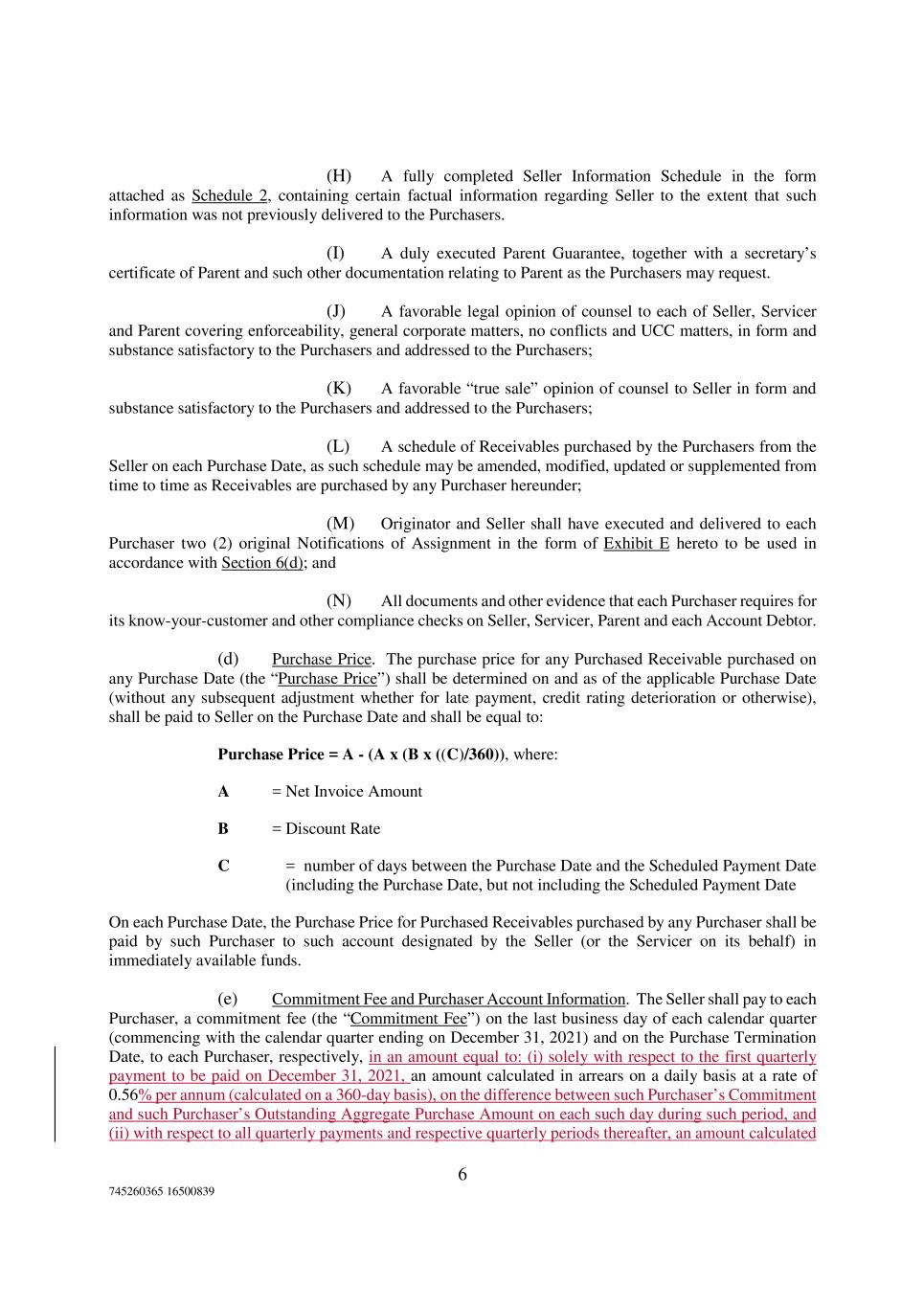 6 745260365 16500839 (H) A fully completed Seller Information Schedule in the form attached as Schedule 2, containing certain factual information regarding Seller to the extent that such information was not previously delivered to the Purchasers. (I) A duly executed Parent Guarantee, together with a secretary’s certificate of Parent and such other documentation relating to Parent as the Purchasers may request. (J) A favorable legal opinion of counsel to each of Seller, Servicer and Parent covering enforceability, general corporate matters, no conflicts and UCC matters, in form and substance satisfactory to the Purchasers and addressed to the Purchasers; (K) A favorable “true sale” opinion of counsel to Seller in form and substance satisfactory to the Purchasers and addressed to the Purchasers; (L) A schedule of Receivables purchased by the Purchasers from the Seller on each Purchase Date, as such schedule may be amended, modified, updated or supplemented from time to time as Receivables are purchased by any Purchaser hereunder; (M) Originator and Seller shall have executed and delivered to each Purchaser two (2) original Notifications of Assignment in the form of Exhibit E hereto to be used in accordance with Section 6(d); and (N) All documents and other evidence that each Purchaser requires for its know-your-customer and other compliance checks on Seller, Servicer, Parent and each Account Debtor. (d) Purchase Price. The purchase price for any Purchased Receivable purchased on any Purchase Date (the “Purchase Price”) shall be determined on and as of the applicable Purchase Date (without any subsequent adjustment whether for late payment, credit rating deterioration or otherwise), shall be paid to Seller on the Purchase Date and shall be equal to: Purchase Price = A - (A x (B x ((C)/360)), where: A = Net Invoice Amount B = Discount Rate C = number of days between the Purchase Date and the Scheduled Payment Date (including the Purchase Date, but not including the Scheduled Payment Date On each Purchase Date, the Purchase Price for Purchased Receivables purchased by any Purchaser shall be paid by such Purchaser to such account designated by the Seller (or the Servicer on its behalf) in immediately available funds. (e) Commitment Fee and Purchaser Account Information. The Seller shall pay to each Purchaser, a commitment fee (the “Commitment Fee”) on the last business day of each calendar quarter (commencing with the calendar quarter ending on December 31, 2021) and on the Purchase Termination Date, to each Purchaser, respectively, in an amount equal to: (i) solely with respect to the first quarterly payment to be paid on December 31, 2021, an amount calculated in arrears on a daily basis at a rate of 0.56% per annum (calculated on a 360-day basis), on the difference between such Purchaser’s Commitment and such Purchaser’s Outstanding Aggregate Purchase Amount on each such day during such period, and (ii) with respect to all quarterly payments and respective quarterly periods thereafter, an amount calculated