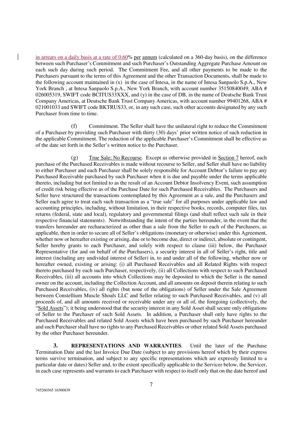 7 745260365 16500839 in arrears on a daily basis at a rate of 0.60% per annum (calculated on a 360-day basis), on the difference between such Purchaser’s Commitment and such Purchaser’s Outstanding Aggregate Purchase Amount on each such day during such period. The Commitment Fee, and all other payments to be made to the Purchasers pursuant to the terms of this Agreement and the other Transaction Documents, shall be made to the following account maintained in (x) in the case of Intesa, in the name of Intesa Sanpaolo S.p.A., New York Branch , at Intesa Sanpaolo S.p.A., New York Branch, with account number 35150840049, ABA # 026005319, SWIFT code BCITUS33XXX, and (y) in the case of DB, in the name of Deutsche Bank Trust Company Americas, at Deutsche Bank Trust Company Americas, with account number 99401268, ABA # 021001033 and SWIFT code BKTRUS33, or, in any such case, such other accounts designated by any such Purchaser from time to time. (f) Commitment. The Seller shall have the unilateral right to reduce the Commitment of a Purchaser by providing such Purchaser with thirty (30) days’ prior written notice of such reduction in the applicable Commitment. The reduction of the applicable Purchaser’s Commitment shall be effective as of the date set forth in the Seller’s written notice to the Purchaser. (g) True Sale; No Recourse. Except as otherwise provided in Section 7 hereof, each purchase of the Purchased Receivables is made without recourse to Seller, and Seller shall have no liability to either Purchaser and each Purchaser shall be solely responsible for Account Debtor’s failure to pay any Purchased Receivable purchased by such Purchaser when it is due and payable under the terms applicable thereto, including but not limited to as the result of an Account Debtor Insolvency Event, such assumption of credit risk being effective as of the Purchase Date for such Purchased Receivables. The Purchasers and Seller have structured the transactions contemplated by this Agreement as a sale, and the Purchasers and Seller each agree to treat each such transaction as a “true sale” for all purposes under applicable law and accounting principles, including, without limitation, in their respective books, records, computer files, tax returns (federal, state and local), regulatory and governmental filings (and shall reflect such sale in their respective financial statements). Notwithstanding the intent of the parties hereunder, in the event that the transfers hereunder are recharacterized as other than a sale from the Seller to each of the Purchasers, as applicable, then in order to secure all of Seller’s obligations (monetary or otherwise) under this Agreement, whether now or hereafter existing or arising, due or to become due, direct or indirect, absolute or contingent, Seller hereby grants to each Purchaser, and solely with respect to clause (iii) below, the Purchaser Representative (for and on behalf of the Purchasers), a security interest in all of Seller’s right, title and interest (including any undivided interest of Seller) in, to and under all of the following, whether now or hereafter owned, existing or arising: (i) all Purchased Receivables and all Related Rights with respect thereto purchased by each such Purchaser, respectively, (ii) all Collections with respect to such Purchased Receivables, (iii) all accounts into which Collections may be deposited to which the Seller is the named owner on the account, including the Collection Account, and all amounts on deposit therein relating to such Purchased Receivables, (iv) all rights (but none of the obligations) of Seller under the Sale Agreement between Constellium Muscle Shoals LLC and Seller relating to such Purchased Receivables, and (v) all proceeds of, and all amounts received or receivable under any or all of, the foregoing (collectively, the “Sold Assets”); it being understood that the security interest in any Sold Asset shall secure only obligations of Seller to the Purchaser of such Sold Assets. In addition, a Purchaser shall only have rights to the Purchased Receivables and related Sold Assets which have been purchased by such Purchaser hereunder and such Purchaser shall have no rights to any Purchased Receivables or other related Sold Assets purchased by the other Purchaser hereunder. 3. REPRESENTATIONS AND WARRANTIES. Until the later of the Purchase Termination Date and the last Invoice Due Date (subject to any provisions hereof which by their express terms survive termination, and subject to any specific representations which are expressly limited to a particular date or dates) Seller and, to the extent specifically applicable to the Servicer below, the Servicer, in each case represents and warrants to each Purchaser with respect to itself only that on the date hereof and