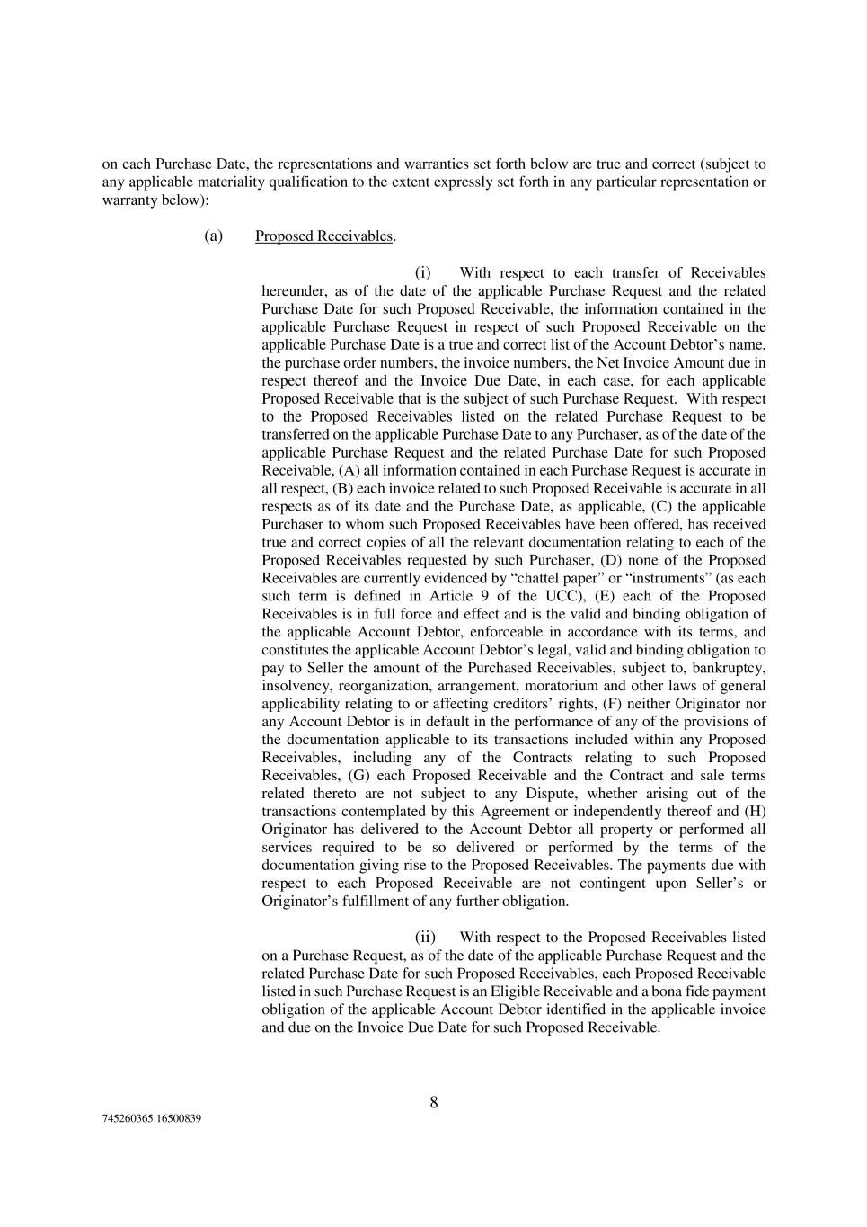 8 745260365 16500839 on each Purchase Date, the representations and warranties set forth below are true and correct (subject to any applicable materiality qualification to the extent expressly set forth in any particular representation or warranty below): (a) Proposed Receivables. (i) With respect to each transfer of Receivables hereunder, as of the date of the applicable Purchase Request and the related Purchase Date for such Proposed Receivable, the information contained in the applicable Purchase Request in respect of such Proposed Receivable on the applicable Purchase Date is a true and correct list of the Account Debtor’s name, the purchase order numbers, the invoice numbers, the Net Invoice Amount due in respect thereof and the Invoice Due Date, in each case, for each applicable Proposed Receivable that is the subject of such Purchase Request. With respect to the Proposed Receivables listed on the related Purchase Request to be transferred on the applicable Purchase Date to any Purchaser, as of the date of the applicable Purchase Request and the related Purchase Date for such Proposed Receivable, (A) all information contained in each Purchase Request is accurate in all respect, (B) each invoice related to such Proposed Receivable is accurate in all respects as of its date and the Purchase Date, as applicable, (C) the applicable Purchaser to whom such Proposed Receivables have been offered, has received true and correct copies of all the relevant documentation relating to each of the Proposed Receivables requested by such Purchaser, (D) none of the Proposed Receivables are currently evidenced by “chattel paper” or “instruments” (as each such term is defined in Article 9 of the UCC), (E) each of the Proposed Receivables is in full force and effect and is the valid and binding obligation of the applicable Account Debtor, enforceable in accordance with its terms, and constitutes the applicable Account Debtor’s legal, valid and binding obligation to pay to Seller the amount of the Purchased Receivables, subject to, bankruptcy, insolvency, reorganization, arrangement, moratorium and other laws of general applicability relating to or affecting creditors’ rights, (F) neither Originator nor any Account Debtor is in default in the performance of any of the provisions of the documentation applicable to its transactions included within any Proposed Receivables, including any of the Contracts relating to such Proposed Receivables, (G) each Proposed Receivable and the Contract and sale terms related thereto are not subject to any Dispute, whether arising out of the transactions contemplated by this Agreement or independently thereof and (H) Originator has delivered to the Account Debtor all property or performed all services required to be so delivered or performed by the terms of the documentation giving rise to the Proposed Receivables. The payments due with respect to each Proposed Receivable are not contingent upon Seller’s or Originator’s fulfillment of any further obligation. (ii) With respect to the Proposed Receivables listed on a Purchase Request, as of the date of the applicable Purchase Request and the related Purchase Date for such Proposed Receivables, each Proposed Receivable listed in such Purchase Request is an Eligible Receivable and a bona fide payment obligation of the applicable Account Debtor identified in the applicable invoice and due on the Invoice Due Date for such Proposed Receivable.