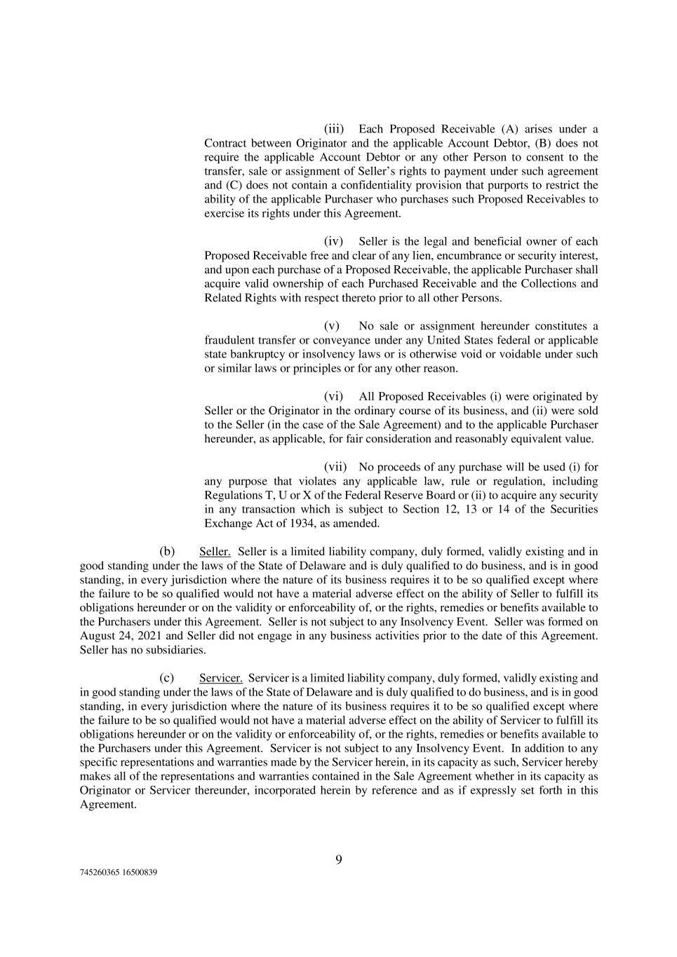 9 745260365 16500839 (iii) Each Proposed Receivable (A) arises under a Contract between Originator and the applicable Account Debtor, (B) does not require the applicable Account Debtor or any other Person to consent to the transfer, sale or assignment of Seller’s rights to payment under such agreement and (C) does not contain a confidentiality provision that purports to restrict the ability of the applicable Purchaser who purchases such Proposed Receivables to exercise its rights under this Agreement. (iv) Seller is the legal and beneficial owner of each Proposed Receivable free and clear of any lien, encumbrance or security interest, and upon each purchase of a Proposed Receivable, the applicable Purchaser shall acquire valid ownership of each Purchased Receivable and the Collections and Related Rights with respect thereto prior to all other Persons. (v) No sale or assignment hereunder constitutes a fraudulent transfer or conveyance under any United States federal or applicable state bankruptcy or insolvency laws or is otherwise void or voidable under such or similar laws or principles or for any other reason. (vi) All Proposed Receivables (i) were originated by Seller or the Originator in the ordinary course of its business, and (ii) were sold to the Seller (in the case of the Sale Agreement) and to the applicable Purchaser hereunder, as applicable, for fair consideration and reasonably equivalent value. (vii) No proceeds of any purchase will be used (i) for any purpose that violates any applicable law, rule or regulation, including Regulations T, U or X of the Federal Reserve Board or (ii) to acquire any security in any transaction which is subject to Section 12, 13 or 14 of the Securities Exchange Act of 1934, as amended. (b) Seller. Seller is a limited liability company, duly formed, validly existing and in good standing under the laws of the State of Delaware and is duly qualified to do business, and is in good standing, in every jurisdiction where the nature of its business requires it to be so qualified except where the failure to be so qualified would not have a material adverse effect on the ability of Seller to fulfill its obligations hereunder or on the validity or enforceability of, or the rights, remedies or benefits available to the Purchasers under this Agreement. Seller is not subject to any Insolvency Event. Seller was formed on August 24, 2021 and Seller did not engage in any business activities prior to the date of this Agreement. Seller has no subsidiaries. (c) Servicer. Servicer is a limited liability company, duly formed, validly existing and in good standing under the laws of the State of Delaware and is duly qualified to do business, and is in good standing, in every jurisdiction where the nature of its business requires it to be so qualified except where the failure to be so qualified would not have a material adverse effect on the ability of Servicer to fulfill its obligations hereunder or on the validity or enforceability of, or the rights, remedies or benefits available to the Purchasers under this Agreement. Servicer is not subject to any Insolvency Event. In addition to any specific representations and warranties made by the Servicer herein, in its capacity as such, Servicer hereby makes all of the representations and warranties contained in the Sale Agreement whether in its capacity as Originator or Servicer thereunder, incorporated herein by reference and as if expressly set forth in this Agreement.