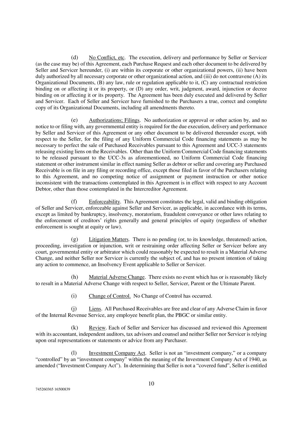 10 745260365 16500839 (d) No Conflict, etc. The execution, delivery and performance by Seller or Servicer (as the case may be) of this Agreement, each Purchase Request and each other document to be delivered by Seller and Servicer hereunder, (i) are within its corporate or other organizational powers, (ii) have been duly authorized by all necessary corporate or other organizational action, and (iii) do not contravene (A) its Organizational Documents, (B) any law, rule or regulation applicable to it, (C) any contractual restriction binding on or affecting it or its property, or (D) any order, writ, judgment, award, injunction or decree binding on or affecting it or its property. The Agreement has been duly executed and delivered by Seller and Servicer. Each of Seller and Servicer have furnished to the Purchasers a true, correct and complete copy of its Organizational Documents, including all amendments thereto. (e) Authorizations; Filings. No authorization or approval or other action by, and no notice to or filing with, any governmental entity is required for the due execution, delivery and performance by Seller and Servicer of this Agreement or any other document to be delivered thereunder except, with respect to the Seller, for the filing of any Uniform Commercial Code financing statements as may be necessary to perfect the sale of Purchased Receivables pursuant to this Agreement and UCC-3 statements releasing existing liens on the Receivables. Other than the Uniform Commercial Code financing statements to be released pursuant to the UCC-3s as aforementioned, no Uniform Commercial Code financing statement or other instrument similar in effect naming Seller as debtor or seller and covering any Purchased Receivable is on file in any filing or recording office, except those filed in favor of the Purchasers relating to this Agreement, and no competing notice of assignment or payment instruction or other notice inconsistent with the transactions contemplated in this Agreement is in effect with respect to any Account Debtor, other than those contemplated in the Intercreditor Agreement. (f) Enforceability. This Agreement constitutes the legal, valid and binding obligation of Seller and Servicer, enforceable against Seller and Servicer, as applicable, in accordance with its terms, except as limited by bankruptcy, insolvency, moratorium, fraudulent conveyance or other laws relating to the enforcement of creditors’ rights generally and general principles of equity (regardless of whether enforcement is sought at equity or law). (g) Litigation Matters. There is no pending (or, to its knowledge, threatened) action, proceeding, investigation or injunction, writ or restraining order affecting Seller or Servicer before any court, governmental entity or arbitrator which could reasonably be expected to result in a Material Adverse Change, and neither Seller nor Servicer is currently the subject of, and has no present intention of taking any action to commence, an Insolvency Event applicable to Seller or Servicer. (h) Material Adverse Change. There exists no event which has or is reasonably likely to result in a Material Adverse Change with respect to Seller, Servicer, Parent or the Ultimate Parent. (i) Change of Control. No Change of Control has occurred. (j) Liens. All Purchased Receivables are free and clear of any Adverse Claim in favor of the Internal Revenue Service, any employee benefit plan, the PBGC or similar entity. (k) Review. Each of Seller and Servicer has discussed and reviewed this Agreement with its accountant, independent auditors, tax advisors and counsel and neither Seller nor Servicer is relying upon oral representations or statements or advice from any Purchaser. (l) Investment Company Act. Seller is not an “investment company,” or a company “controlled” by an “investment company” within the meaning of the Investment Company Act of 1940, as amended (“Investment Company Act”). In determining that Seller is not a “covered fund”, Seller is entitled