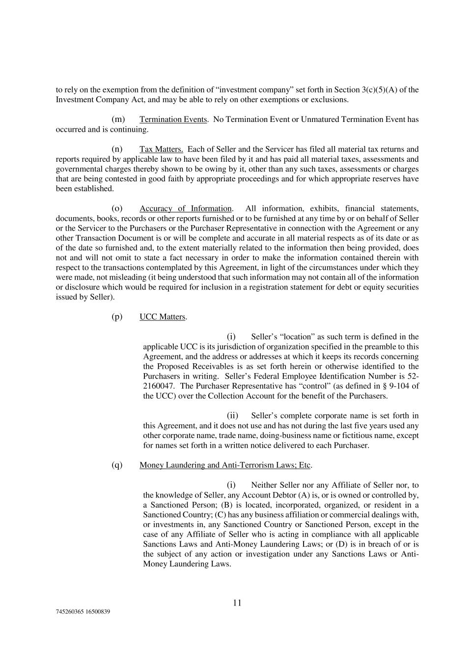 11 745260365 16500839 to rely on the exemption from the definition of “investment company” set forth in Section 3(c)(5)(A) of the Investment Company Act, and may be able to rely on other exemptions or exclusions. (m) Termination Events. No Termination Event or Unmatured Termination Event has occurred and is continuing. (n) Tax Matters. Each of Seller and the Servicer has filed all material tax returns and reports required by applicable law to have been filed by it and has paid all material taxes, assessments and governmental charges thereby shown to be owing by it, other than any such taxes, assessments or charges that are being contested in good faith by appropriate proceedings and for which appropriate reserves have been established. (o) Accuracy of Information. All information, exhibits, financial statements, documents, books, records or other reports furnished or to be furnished at any time by or on behalf of Seller or the Servicer to the Purchasers or the Purchaser Representative in connection with the Agreement or any other Transaction Document is or will be complete and accurate in all material respects as of its date or as of the date so furnished and, to the extent materially related to the information then being provided, does not and will not omit to state a fact necessary in order to make the information contained therein with respect to the transactions contemplated by this Agreement, in light of the circumstances under which they were made, not misleading (it being understood that such information may not contain all of the information or disclosure which would be required for inclusion in a registration statement for debt or equity securities issued by Seller). (p) UCC Matters. (i) Seller’s “location” as such term is defined in the applicable UCC is its jurisdiction of organization specified in the preamble to this Agreement, and the address or addresses at which it keeps its records concerning the Proposed Receivables is as set forth herein or otherwise identified to the Purchasers in writing. Seller’s Federal Employee Identification Number is 52- 2160047. The Purchaser Representative has “control” (as defined in § 9-104 of the UCC) over the Collection Account for the benefit of the Purchasers. (ii) Seller’s complete corporate name is set forth in this Agreement, and it does not use and has not during the last five years used any other corporate name, trade name, doing-business name or fictitious name, except for names set forth in a written notice delivered to each Purchaser. (q) Money Laundering and Anti-Terrorism Laws; Etc. (i) Neither Seller nor any Affiliate of Seller nor, to the knowledge of Seller, any Account Debtor (A) is, or is owned or controlled by, a Sanctioned Person; (B) is located, incorporated, organized, or resident in a Sanctioned Country; (C) has any business affiliation or commercial dealings with, or investments in, any Sanctioned Country or Sanctioned Person, except in the case of any Affiliate of Seller who is acting in compliance with all applicable Sanctions Laws and Anti-Money Laundering Laws; or (D) is in breach of or is the subject of any action or investigation under any Sanctions Laws or Anti- Money Laundering Laws.
