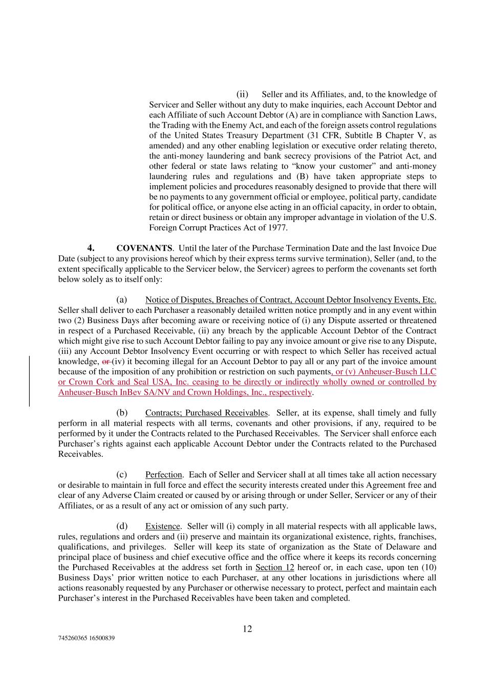 12 745260365 16500839 (ii) Seller and its Affiliates, and, to the knowledge of Servicer and Seller without any duty to make inquiries, each Account Debtor and each Affiliate of such Account Debtor (A) are in compliance with Sanction Laws, the Trading with the Enemy Act, and each of the foreign assets control regulations of the United States Treasury Department (31 CFR, Subtitle B Chapter V, as amended) and any other enabling legislation or executive order relating thereto, the anti-money laundering and bank secrecy provisions of the Patriot Act, and other federal or state laws relating to “know your customer” and anti-money laundering rules and regulations and (B) have taken appropriate steps to implement policies and procedures reasonably designed to provide that there will be no payments to any government official or employee, political party, candidate for political office, or anyone else acting in an official capacity, in order to obtain, retain or direct business or obtain any improper advantage in violation of the U.S. Foreign Corrupt Practices Act of 1977. 4. COVENANTS. Until the later of the Purchase Termination Date and the last Invoice Due Date (subject to any provisions hereof which by their express terms survive termination), Seller (and, to the extent specifically applicable to the Servicer below, the Servicer) agrees to perform the covenants set forth below solely as to itself only: (a) Notice of Disputes, Breaches of Contract, Account Debtor Insolvency Events, Etc. Seller shall deliver to each Purchaser a reasonably detailed written notice promptly and in any event within two (2) Business Days after becoming aware or receiving notice of (i) any Dispute asserted or threatened in respect of a Purchased Receivable, (ii) any breach by the applicable Account Debtor of the Contract which might give rise to such Account Debtor failing to pay any invoice amount or give rise to any Dispute, (iii) any Account Debtor Insolvency Event occurring or with respect to which Seller has received actual knowledge, or (iv) it becoming illegal for an Account Debtor to pay all or any part of the invoice amount because of the imposition of any prohibition or restriction on such payments, or (v) Anheuser-Busch LLC or Crown Cork and Seal USA, Inc. ceasing to be directly or indirectly wholly owned or controlled by Anheuser-Busch InBev SA/NV and Crown Holdings, Inc., respectively. (b) Contracts; Purchased Receivables. Seller, at its expense, shall timely and fully perform in all material respects with all terms, covenants and other provisions, if any, required to be performed by it under the Contracts related to the Purchased Receivables. The Servicer shall enforce each Purchaser’s rights against each applicable Account Debtor under the Contracts related to the Purchased Receivables. (c) Perfection. Each of Seller and Servicer shall at all times take all action necessary or desirable to maintain in full force and effect the security interests created under this Agreement free and clear of any Adverse Claim created or caused by or arising through or under Seller, Servicer or any of their Affiliates, or as a result of any act or omission of any such party. (d) Existence. Seller will (i) comply in all material respects with all applicable laws, rules, regulations and orders and (ii) preserve and maintain its organizational existence, rights, franchises, qualifications, and privileges. Seller will keep its state of organization as the State of Delaware and principal place of business and chief executive office and the office where it keeps its records concerning the Purchased Receivables at the address set forth in Section 12 hereof or, in each case, upon ten (10) Business Days’ prior written notice to each Purchaser, at any other locations in jurisdictions where all actions reasonably requested by any Purchaser or otherwise necessary to protect, perfect and maintain each Purchaser’s interest in the Purchased Receivables have been taken and completed.