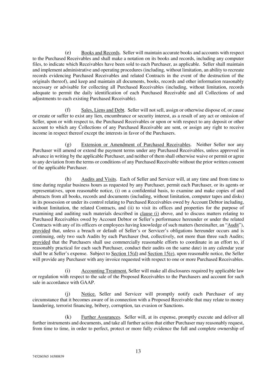 13 745260365 16500839 (e) Books and Records. Seller will maintain accurate books and accounts with respect to the Purchased Receivables and shall make a notation on its books and records, including any computer files, to indicate which Receivables have been sold to each Purchaser, as applicable. Seller shall maintain and implement administrative and operating procedures (including, without limitation, an ability to recreate records evidencing Purchased Receivables and related Contracts in the event of the destruction of the originals thereof), and keep and maintain all documents, books, records and other information reasonably necessary or advisable for collecting all Purchased Receivables (including, without limitation, records adequate to permit the daily identification of each Purchased Receivable and all Collections of and adjustments to each existing Purchased Receivable). (f) Sales, Liens and Debt. Seller will not sell, assign or otherwise dispose of, or cause or create or suffer to exist any lien, encumbrance or security interest, as a result of any act or omission of Seller, upon or with respect to, the Purchased Receivables or upon or with respect to any deposit or other account to which any Collections of any Purchased Receivable are sent, or assign any right to receive income in respect thereof except the interests in favor of the Purchasers. (g) Extension or Amendment of Purchased Receivables. Neither Seller nor any Purchaser will amend or extend the payment terms under any Purchased Receivables, unless approved in advance in writing by the applicable Purchaser, and neither of them shall otherwise waive or permit or agree to any deviation from the terms or conditions of any Purchased Receivable without the prior written consent of the applicable Purchaser. (h) Audits and Visits. Each of Seller and Servicer will, at any time and from time to time during regular business hours as requested by any Purchaser, permit each Purchaser, or its agents or representatives, upon reasonable notice, (i) on a confidential basis, to examine and make copies of and abstracts from all books, records and documents (including, without limitation, computer tapes and disks) in its possession or under its control relating to Purchased Receivables owed by Account Debtor including, without limitation, the related Contracts, and (ii) to visit its offices and properties for the purpose of examining and auditing such materials described in clause (i) above, and to discuss matters relating to Purchased Receivables owed by Account Debtor or Seller’s performance hereunder or under the related Contracts with any of its officers or employees having knowledge of such matters (hereinafter, an “Audit”), provided that, unless a breach or default of Seller’s or Servicer’s obligations hereunder occurs and is continuing, only two such Audits by each Purchaser (but, collectively, not more than three such Audits; provided that the Purchasers shall use commercially reasonable efforts to coordinate in an effort to, if reasonably practical for each such Purchaser, conduct their audits on the same date) in any calendar year shall be at Seller’s expense. Subject to Section 15(d) and Section 15(e), upon reasonable notice, the Seller will provide any Purchaser with any invoice requested with respect to one or more Purchased Receivables. (i) Accounting Treatment. Seller will make all disclosures required by applicable law or regulation with respect to the sale of the Proposed Receivables to the Purchasers and account for such sale in accordance with GAAP. (j) Notice. Seller and Servicer will promptly notify each Purchaser of any circumstance that it becomes aware of in connection with a Proposed Receivable that may relate to money laundering, terrorist financing, bribery, corruption, tax evasion or Sanctions. (k) Further Assurances. Seller will, at its expense, promptly execute and deliver all further instruments and documents, and take all further action that either Purchaser may reasonably request, from time to time, in order to perfect, protect or more fully evidence the full and complete ownership of