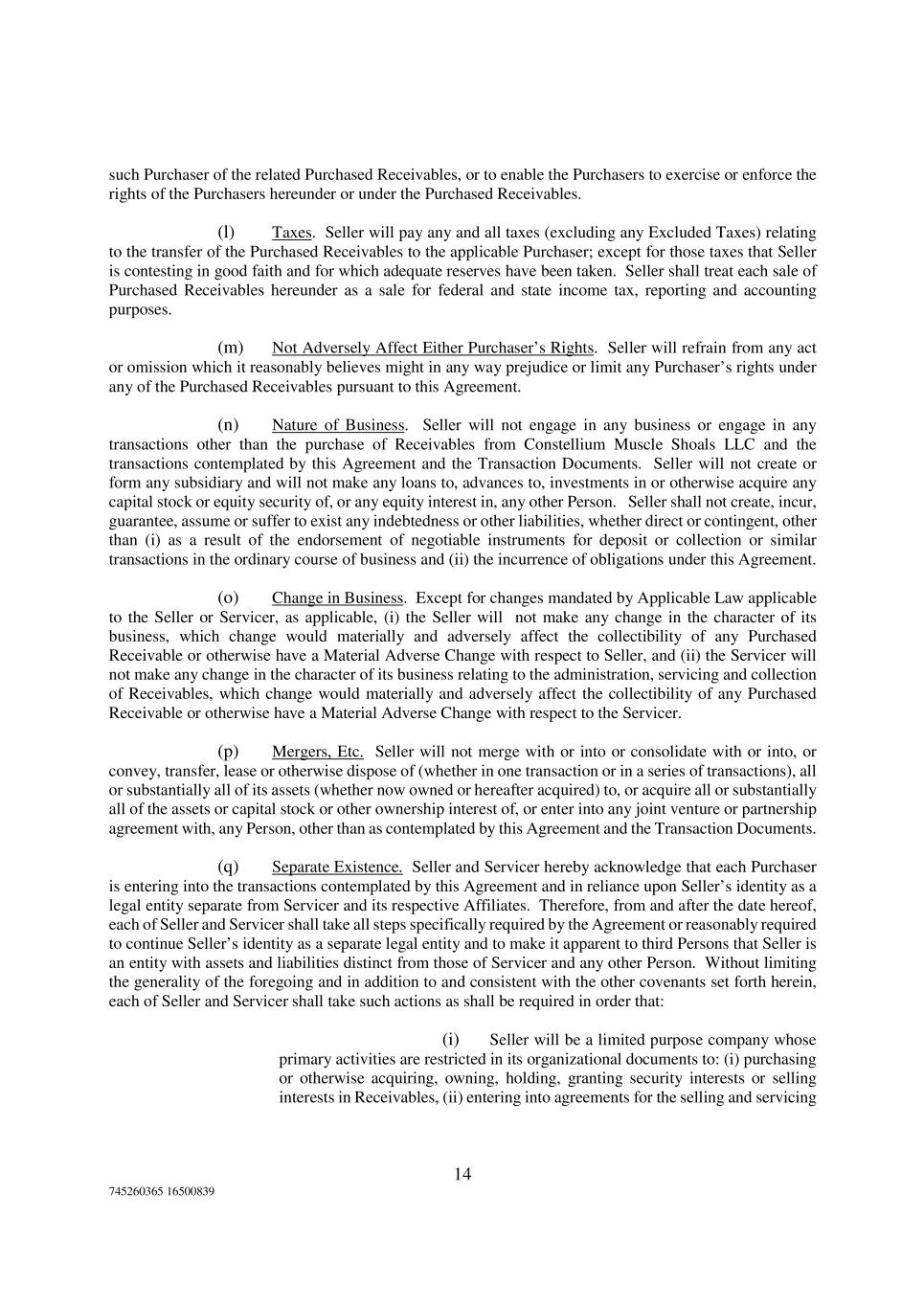 14 745260365 16500839 such Purchaser of the related Purchased Receivables, or to enable the Purchasers to exercise or enforce the rights of the Purchasers hereunder or under the Purchased Receivables. (l) Taxes. Seller will pay any and all taxes (excluding any Excluded Taxes) relating to the transfer of the Purchased Receivables to the applicable Purchaser; except for those taxes that Seller is contesting in good faith and for which adequate reserves have been taken. Seller shall treat each sale of Purchased Receivables hereunder as a sale for federal and state income tax, reporting and accounting purposes. (m) Not Adversely Affect Either Purchaser’s Rights. Seller will refrain from any act or omission which it reasonably believes might in any way prejudice or limit any Purchaser’s rights under any of the Purchased Receivables pursuant to this Agreement. (n) Nature of Business. Seller will not engage in any business or engage in any transactions other than the purchase of Receivables from Constellium Muscle Shoals LLC and the transactions contemplated by this Agreement and the Transaction Documents. Seller will not create or form any subsidiary and will not make any loans to, advances to, investments in or otherwise acquire any capital stock or equity security of, or any equity interest in, any other Person. Seller shall not create, incur, guarantee, assume or suffer to exist any indebtedness or other liabilities, whether direct or contingent, other than (i) as a result of the endorsement of negotiable instruments for deposit or collection or similar transactions in the ordinary course of business and (ii) the incurrence of obligations under this Agreement. (o) Change in Business. Except for changes mandated by Applicable Law applicable to the Seller or Servicer, as applicable, (i) the Seller will not make any change in the character of its business, which change would materially and adversely affect the collectibility of any Purchased Receivable or otherwise have a Material Adverse Change with respect to Seller, and (ii) the Servicer will not make any change in the character of its business relating to the administration, servicing and collection of Receivables, which change would materially and adversely affect the collectibility of any Purchased Receivable or otherwise have a Material Adverse Change with respect to the Servicer. (p) Mergers, Etc. Seller will not merge with or into or consolidate with or into, or convey, transfer, lease or otherwise dispose of (whether in one transaction or in a series of transactions), all or substantially all of its assets (whether now owned or hereafter acquired) to, or acquire all or substantially all of the assets or capital stock or other ownership interest of, or enter into any joint venture or partnership agreement with, any Person, other than as contemplated by this Agreement and the Transaction Documents. (q) Separate Existence. Seller and Servicer hereby acknowledge that each Purchaser is entering into the transactions contemplated by this Agreement and in reliance upon Seller’s identity as a legal entity separate from Servicer and its respective Affiliates. Therefore, from and after the date hereof, each of Seller and Servicer shall take all steps specifically required by the Agreement or reasonably required to continue Seller’s identity as a separate legal entity and to make it apparent to third Persons that Seller is an entity with assets and liabilities distinct from those of Servicer and any other Person. Without limiting the generality of the foregoing and in addition to and consistent with the other covenants set forth herein, each of Seller and Servicer shall take such actions as shall be required in order that: (i) Seller will be a limited purpose company whose primary activities are restricted in its organizational documents to: (i) purchasing or otherwise acquiring, owning, holding, granting security interests or selling interests in Receivables, (ii) entering into agreements for the selling and servicing