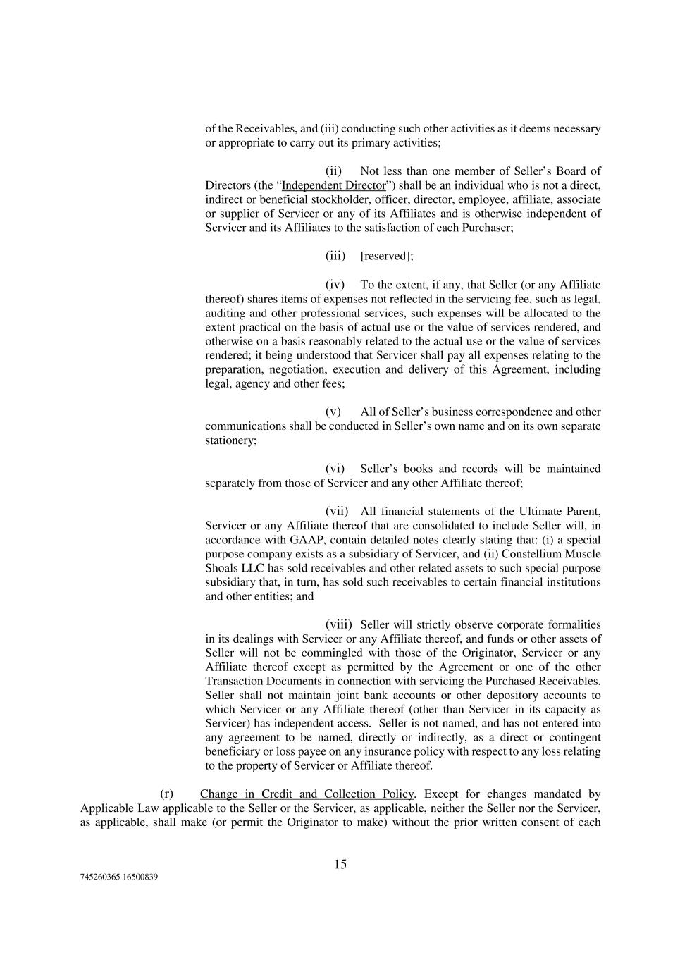 15 745260365 16500839 of the Receivables, and (iii) conducting such other activities as it deems necessary or appropriate to carry out its primary activities; (ii) Not less than one member of Seller’s Board of Directors (the “Independent Director”) shall be an individual who is not a direct, indirect or beneficial stockholder, officer, director, employee, affiliate, associate or supplier of Servicer or any of its Affiliates and is otherwise independent of Servicer and its Affiliates to the satisfaction of each Purchaser; (iii) [reserved]; (iv) To the extent, if any, that Seller (or any Affiliate thereof) shares items of expenses not reflected in the servicing fee, such as legal, auditing and other professional services, such expenses will be allocated to the extent practical on the basis of actual use or the value of services rendered, and otherwise on a basis reasonably related to the actual use or the value of services rendered; it being understood that Servicer shall pay all expenses relating to the preparation, negotiation, execution and delivery of this Agreement, including legal, agency and other fees; (v) All of Seller’s business correspondence and other communications shall be conducted in Seller’s own name and on its own separate stationery; (vi) Seller’s books and records will be maintained separately from those of Servicer and any other Affiliate thereof; (vii) All financial statements of the Ultimate Parent, Servicer or any Affiliate thereof that are consolidated to include Seller will, in accordance with GAAP, contain detailed notes clearly stating that: (i) a special purpose company exists as a subsidiary of Servicer, and (ii) Constellium Muscle Shoals LLC has sold receivables and other related assets to such special purpose subsidiary that, in turn, has sold such receivables to certain financial institutions and other entities; and (viii) Seller will strictly observe corporate formalities in its dealings with Servicer or any Affiliate thereof, and funds or other assets of Seller will not be commingled with those of the Originator, Servicer or any Affiliate thereof except as permitted by the Agreement or one of the other Transaction Documents in connection with servicing the Purchased Receivables. Seller shall not maintain joint bank accounts or other depository accounts to which Servicer or any Affiliate thereof (other than Servicer in its capacity as Servicer) has independent access. Seller is not named, and has not entered into any agreement to be named, directly or indirectly, as a direct or contingent beneficiary or loss payee on any insurance policy with respect to any loss relating to the property of Servicer or Affiliate thereof. (r) Change in Credit and Collection Policy. Except for changes mandated by Applicable Law applicable to the Seller or the Servicer, as applicable, neither the Seller nor the Servicer, as applicable, shall make (or permit the Originator to make) without the prior written consent of each