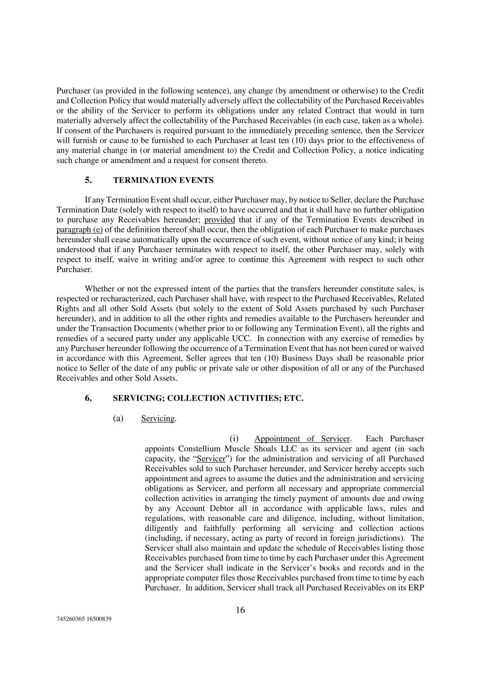 16 745260365 16500839 Purchaser (as provided in the following sentence), any change (by amendment or otherwise) to the Credit and Collection Policy that would materially adversely affect the collectability of the Purchased Receivables or the ability of the Servicer to perform its obligations under any related Contract that would in turn materially adversely affect the collectability of the Purchased Receivables (in each case, taken as a whole). If consent of the Purchasers is required pursuant to the immediately preceding sentence, then the Servicer will furnish or cause to be furnished to each Purchaser at least ten (10) days prior to the effectiveness of any material change in (or material amendment to) the Credit and Collection Policy, a notice indicating such change or amendment and a request for consent thereto. 5. TERMINATION EVENTS If any Termination Event shall occur, either Purchaser may, by notice to Seller, declare the Purchase Termination Date (solely with respect to itself) to have occurred and that it shall have no further obligation to purchase any Receivables hereunder; provided that if any of the Termination Events described in paragraph (e) of the definition thereof shall occur, then the obligation of each Purchaser to make purchases hereunder shall cease automatically upon the occurrence of such event, without notice of any kind; it being understood that if any Purchaser terminates with respect to itself, the other Purchaser may, solely with respect to itself, waive in writing and/or agree to continue this Agreement with respect to such other Purchaser. Whether or not the expressed intent of the parties that the transfers hereunder constitute sales, is respected or recharacterized, each Purchaser shall have, with respect to the Purchased Receivables, Related Rights and all other Sold Assets (but solely to the extent of Sold Assets purchased by such Purchaser hereunder), and in addition to all the other rights and remedies available to the Purchasers hereunder and under the Transaction Documents (whether prior to or following any Termination Event), all the rights and remedies of a secured party under any applicable UCC. In connection with any exercise of remedies by any Purchaser hereunder following the occurrence of a Termination Event that has not been cured or waived in accordance with this Agreement, Seller agrees that ten (10) Business Days shall be reasonable prior notice to Seller of the date of any public or private sale or other disposition of all or any of the Purchased Receivables and other Sold Assets. 6. SERVICING; COLLECTION ACTIVITIES; ETC. (a) Servicing. (i) Appointment of Servicer. Each Purchaser appoints Constellium Muscle Shoals LLC as its servicer and agent (in such capacity, the “Servicer”) for the administration and servicing of all Purchased Receivables sold to such Purchaser hereunder, and Servicer hereby accepts such appointment and agrees to assume the duties and the administration and servicing obligations as Servicer, and perform all necessary and appropriate commercial collection activities in arranging the timely payment of amounts due and owing by any Account Debtor all in accordance with applicable laws, rules and regulations, with reasonable care and diligence, including, without limitation, diligently and faithfully performing all servicing and collection actions (including, if necessary, acting as party of record in foreign jurisdictions). The Servicer shall also maintain and update the schedule of Receivables listing those Receivables purchased from time to time by each Purchaser under this Agreement and the Servicer shall indicate in the Servicer’s books and records and in the appropriate computer files those Receivables purchased from time to time by each Purchaser. In addition, Servicer shall track all Purchased Receivables on its ERP