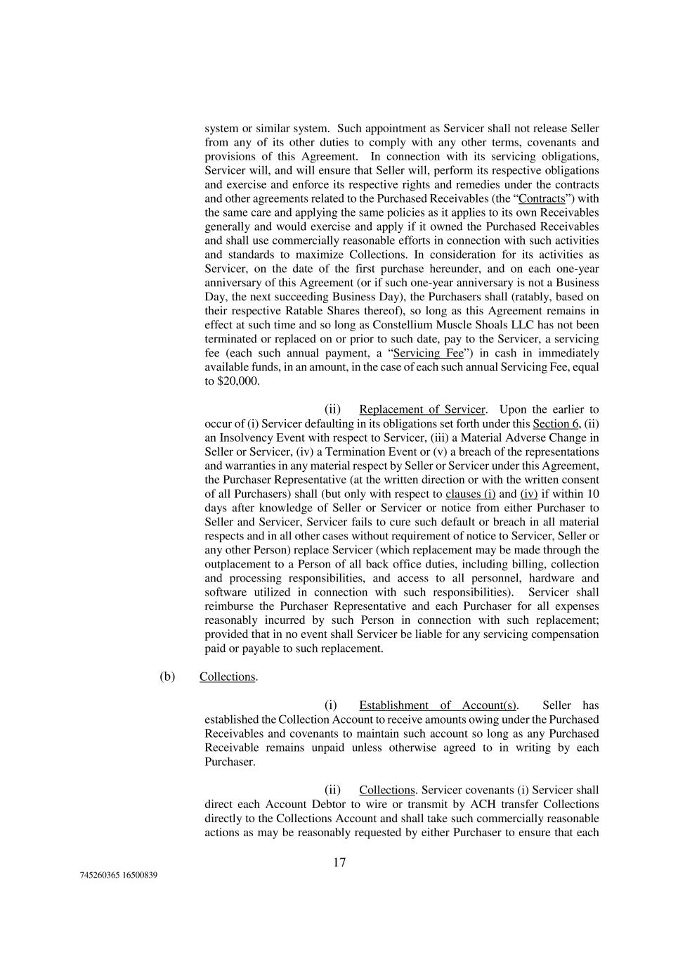 17 745260365 16500839 system or similar system. Such appointment as Servicer shall not release Seller from any of its other duties to comply with any other terms, covenants and provisions of this Agreement. In connection with its servicing obligations, Servicer will, and will ensure that Seller will, perform its respective obligations and exercise and enforce its respective rights and remedies under the contracts and other agreements related to the Purchased Receivables (the “Contracts”) with the same care and applying the same policies as it applies to its own Receivables generally and would exercise and apply if it owned the Purchased Receivables and shall use commercially reasonable efforts in connection with such activities and standards to maximize Collections. In consideration for its activities as Servicer, on the date of the first purchase hereunder, and on each one-year anniversary of this Agreement (or if such one-year anniversary is not a Business Day, the next succeeding Business Day), the Purchasers shall (ratably, based on their respective Ratable Shares thereof), so long as this Agreement remains in effect at such time and so long as Constellium Muscle Shoals LLC has not been terminated or replaced on or prior to such date, pay to the Servicer, a servicing fee (each such annual payment, a “Servicing Fee”) in cash in immediately available funds, in an amount, in the case of each such annual Servicing Fee, equal to $20,000. (ii) Replacement of Servicer. Upon the earlier to occur of (i) Servicer defaulting in its obligations set forth under this Section 6, (ii) an Insolvency Event with respect to Servicer, (iii) a Material Adverse Change in Seller or Servicer, (iv) a Termination Event or (v) a breach of the representations and warranties in any material respect by Seller or Servicer under this Agreement, the Purchaser Representative (at the written direction or with the written consent of all Purchasers) shall (but only with respect to clauses (i) and (iv) if within 10 days after knowledge of Seller or Servicer or notice from either Purchaser to Seller and Servicer, Servicer fails to cure such default or breach in all material respects and in all other cases without requirement of notice to Servicer, Seller or any other Person) replace Servicer (which replacement may be made through the outplacement to a Person of all back office duties, including billing, collection and processing responsibilities, and access to all personnel, hardware and software utilized in connection with such responsibilities). Servicer shall reimburse the Purchaser Representative and each Purchaser for all expenses reasonably incurred by such Person in connection with such replacement; provided that in no event shall Servicer be liable for any servicing compensation paid or payable to such replacement. (b) Collections. (i) Establishment of Account(s). Seller has established the Collection Account to receive amounts owing under the Purchased Receivables and covenants to maintain such account so long as any Purchased Receivable remains unpaid unless otherwise agreed to in writing by each Purchaser. (ii) Collections. Servicer covenants (i) Servicer shall direct each Account Debtor to wire or transmit by ACH transfer Collections directly to the Collections Account and shall take such commercially reasonable actions as may be reasonably requested by either Purchaser to ensure that each