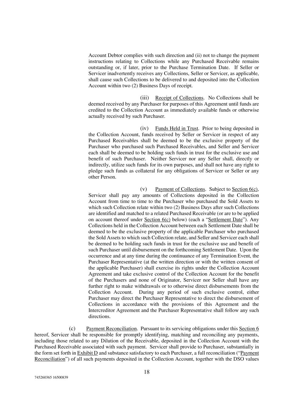 18 745260365 16500839 Account Debtor complies with such direction and (ii) not to change the payment instructions relating to Collections while any Purchased Receivable remains outstanding or, if later, prior to the Purchase Termination Date. If Seller or Servicer inadvertently receives any Collections, Seller or Servicer, as applicable, shall cause such Collections to be delivered to and deposited into the Collection Account within two (2) Business Days of receipt. (iii) Receipt of Collections. No Collections shall be deemed received by any Purchaser for purposes of this Agreement until funds are credited to the Collection Account as immediately available funds or otherwise actually received by such Purchaser. (iv) Funds Held in Trust. Prior to being deposited in the Collection Account, funds received by Seller or Servicer in respect of any Purchased Receivables shall be deemed to be the exclusive property of the Purchaser who purchased such Purchased Receivables, and Seller and Servicer each shall be deemed to be holding such funds in trust for the exclusive use and benefit of such Purchaser. Neither Servicer nor any Seller shall, directly or indirectly, utilize such funds for its own purposes, and shall not have any right to pledge such funds as collateral for any obligations of Servicer or Seller or any other Person. (v) Payment of Collections. Subject to Section 6(c), Servicer shall pay any amounts of Collections deposited in the Collection Account from time to time to the Purchaser who purchased the Sold Assets to which such Collection relate within two (2) Business Days after such Collections are identified and matched to a related Purchased Receivable (or are to be applied on account thereof under Section 6(c) below) (each a “Settlement Date”). Any Collections held in the Collection Account between each Settlement Date shall be deemed to be the exclusive property of the applicable Purchaser who purchased the Sold Assets to which such Collection relate, and Seller and Servicer each shall be deemed to be holding such funds in trust for the exclusive use and benefit of such Purchaser until disbursement on the forthcoming Settlement Date. Upon the occurrence and at any time during the continuance of any Termination Event, the Purchaser Representative (at the written direction or with the written consent of the applicable Purchaser) shall exercise its rights under the Collection Account Agreement and take exclusive control of the Collection Account for the benefit of the Purchasers and none of Originator, Servicer nor Seller shall have any further right to make withdrawals or to otherwise direct disbursements from the Collection Account. During any period of such exclusive control, either Purchaser may direct the Purchaser Representative to direct the disbursement of Collections in accordance with the provisions of this Agreement and the Intercreditor Agreement and the Purchaser Representative shall follow any such directions. (c) Payment Reconciliation. Pursuant to its servicing obligations under this Section 6 hereof, Servicer shall be responsible for promptly identifying, matching and reconciling any payments, including those related to any Dilution of the Receivable, deposited in the Collection Account with the Purchased Receivable associated with such payment. Servicer shall provide to Purchaser, substantially in the form set forth in Exhibit D and substance satisfactory to each Purchaser, a full reconciliation (“Payment Reconciliation”) of all such payments deposited in the Collection Account, together with the DSO values