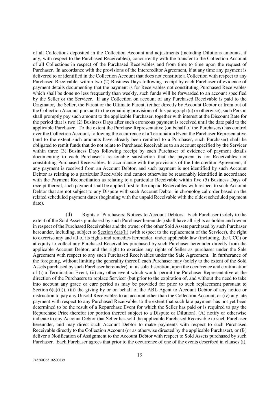19 745260365 16500839 of all Collections deposited in the Collection Account and adjustments (including Dilutions amounts, if any, with respect to the Purchased Receivables), concurrently with the transfer to the Collection Account of all Collections in respect of the Purchased Receivables and from time to time upon the request of Purchaser. In accordance with the provisions of the Intercreditor Agreement, if at any time any payment is delivered to or identified in the Collection Account that does not constitute a Collection with respect to any Purchased Receivable, within two (2) Business Days following receipt by each Purchaser of evidence of payment details documenting that the payment is for Receivables not constituting Purchased Receivables which shall be done no less frequently than weekly, such funds will be forwarded to an account specified by the Seller or the Servicer. If any Collection on account of any Purchased Receivable is paid to the Originator, the Seller, the Parent or the Ultimate Parent, (either directly by Account Debtor or from out of the Collection Account pursuant to the remaining provisions of this paragraph (c) or otherwise), such Person shall promptly pay such amount to the applicable Purchaser, together with interest at the Discount Rate for the period that is two (2) Business Days after such erroneous payment is received until the date paid to the applicable Purchaser. To the extent the Purchase Representative (on behalf of the Purchasers) has control over the Collection Account, following the occurrence of a Termination Event the Purchaser Representative (and to the extent such amounts have already been remitted to a Purchaser, such Purchaser) shall be obligated to remit funds that do not relate to Purchased Receivables to an account specified by the Servicer within three (3) Business Days following receipt by each Purchaser of evidence of payment details documenting to each Purchaser’s reasonable satisfaction that the payment is for Receivables not constituting Purchased Receivables. In accordance with the provisions of the Intercreditor Agreement, if any payment is received from an Account Debtor, and such payment is not identified by such Account Debtor as relating to a particular Receivable and cannot otherwise be reasonably identified in accordance with the Payment Reconciliation as relating to a particular Receivable within five (5) Business Days of receipt thereof, such payment shall be applied first to the unpaid Receivables with respect to such Account Debtor that are not subject to any Dispute with such Account Debtor in chronological order based on the related scheduled payment dates (beginning with the unpaid Receivable with the oldest scheduled payment date). (d) Rights of Purchasers; Notices to Account Debtors. Each Purchaser (solely to the extent of the Sold Assets purchased by such Purchaser hereunder) shall have all rights as holder and owner in respect of the Purchased Receivables and the owner of the other Sold Assets purchased by such Purchaser hereunder, including, subject to Section 6(a)(ii) (with respect to the replacement of the Servicer), the right to exercise any and all of its rights and remedies hereunder, under applicable law (including, the UCC) or at equity to collect any Purchased Receivables purchased by such Purchaser hereunder directly from the applicable Account Debtor, and the right to exercise any rights of Seller as purchaser under the Sale Agreement with respect to any such Purchased Receivables under the Sale Agreement. In furtherance of the foregoing, without limiting the generality thereof, each Purchaser may (solely to the extent of the Sold Assets purchased by such Purchaser hereunder), in its sole discretion, upon the occurrence and continuation of (i) a Termination Event, (ii) any other event which would permit the Purchaser Representative at the direction of the Purchasers to replace Servicer (but prior to the expiration of, and without the need to take into account any grace or cure period as may be provided for prior to such replacement pursuant to Section 6(a)(ii)), (iii) the giving by or on behalf of the ABL Agent to Account Debtor of any notice or instruction to pay any Unsold Receivables to an account other than the Collection Account, or (iv) any late payment with respect to any Purchased Receivable, to the extent that such late payment has not yet been determined to be the result of a Repurchase Event for which the Seller has paid or is required to pay the Repurchase Price therefor (or portion thereof subject to a Dispute or Dilution), (A) notify or otherwise indicate to any Account Debtor that Seller has sold the applicable Purchased Receivable to such Purchaser hereunder, and may direct such Account Debtor to make payments with respect to such Purchased Receivable directly to the Collection Account (or as otherwise directed by the applicable Purchaser), or (B) deliver a Notification of Assignment to the Account Debtor with respect to Sold Assets purchased by such Purchaser. Each Purchaser agrees that prior to the occurrence of one of the events described in clauses (i),