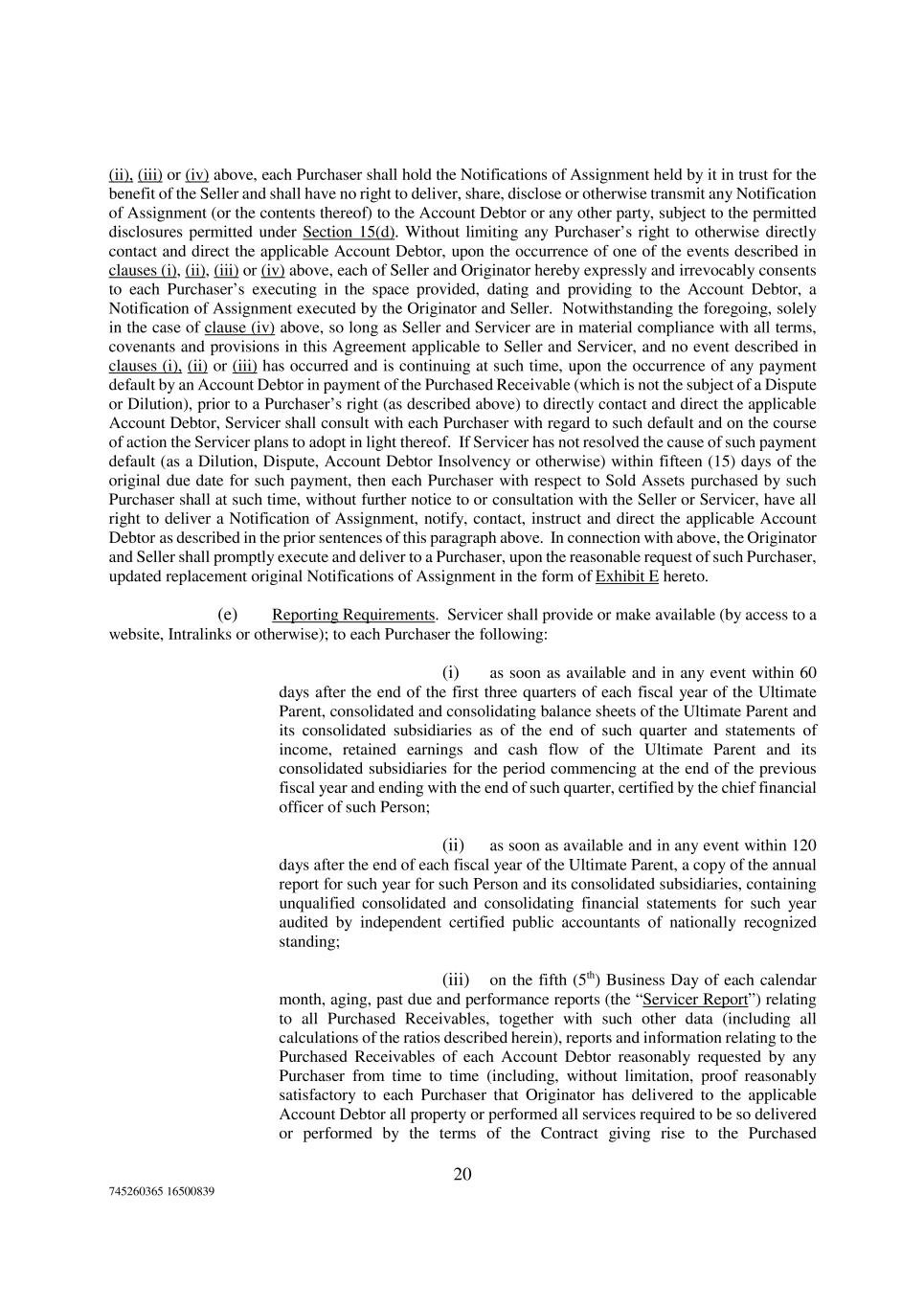 20 745260365 16500839 (ii), (iii) or (iv) above, each Purchaser shall hold the Notifications of Assignment held by it in trust for the benefit of the Seller and shall have no right to deliver, share, disclose or otherwise transmit any Notification of Assignment (or the contents thereof) to the Account Debtor or any other party, subject to the permitted disclosures permitted under Section 15(d). Without limiting any Purchaser’s right to otherwise directly contact and direct the applicable Account Debtor, upon the occurrence of one of the events described in clauses (i), (ii), (iii) or (iv) above, each of Seller and Originator hereby expressly and irrevocably consents to each Purchaser’s executing in the space provided, dating and providing to the Account Debtor, a Notification of Assignment executed by the Originator and Seller. Notwithstanding the foregoing, solely in the case of clause (iv) above, so long as Seller and Servicer are in material compliance with all terms, covenants and provisions in this Agreement applicable to Seller and Servicer, and no event described in clauses (i), (ii) or (iii) has occurred and is continuing at such time, upon the occurrence of any payment default by an Account Debtor in payment of the Purchased Receivable (which is not the subject of a Dispute or Dilution), prior to a Purchaser’s right (as described above) to directly contact and direct the applicable Account Debtor, Servicer shall consult with each Purchaser with regard to such default and on the course of action the Servicer plans to adopt in light thereof. If Servicer has not resolved the cause of such payment default (as a Dilution, Dispute, Account Debtor Insolvency or otherwise) within fifteen (15) days of the original due date for such payment, then each Purchaser with respect to Sold Assets purchased by such Purchaser shall at such time, without further notice to or consultation with the Seller or Servicer, have all right to deliver a Notification of Assignment, notify, contact, instruct and direct the applicable Account Debtor as described in the prior sentences of this paragraph above. In connection with above, the Originator and Seller shall promptly execute and deliver to a Purchaser, upon the reasonable request of such Purchaser, updated replacement original Notifications of Assignment in the form of Exhibit E hereto. (e) Reporting Requirements. Servicer shall provide or make available (by access to a website, Intralinks or otherwise); to each Purchaser the following: (i) as soon as available and in any event within 60 days after the end of the first three quarters of each fiscal year of the Ultimate Parent, consolidated and consolidating balance sheets of the Ultimate Parent and its consolidated subsidiaries as of the end of such quarter and statements of income, retained earnings and cash flow of the Ultimate Parent and its consolidated subsidiaries for the period commencing at the end of the previous fiscal year and ending with the end of such quarter, certified by the chief financial officer of such Person; (ii) as soon as available and in any event within 120 days after the end of each fiscal year of the Ultimate Parent, a copy of the annual report for such year for such Person and its consolidated subsidiaries, containing unqualified consolidated and consolidating financial statements for such year audited by independent certified public accountants of nationally recognized standing; (iii) on the fifth (5th) Business Day of each calendar month, aging, past due and performance reports (the “Servicer Report”) relating to all Purchased Receivables, together with such other data (including all calculations of the ratios described herein), reports and information relating to the Purchased Receivables of each Account Debtor reasonably requested by any Purchaser from time to time (including, without limitation, proof reasonably satisfactory to each Purchaser that Originator has delivered to the applicable Account Debtor all property or performed all services required to be so delivered or performed by the terms of the Contract giving rise to the Purchased