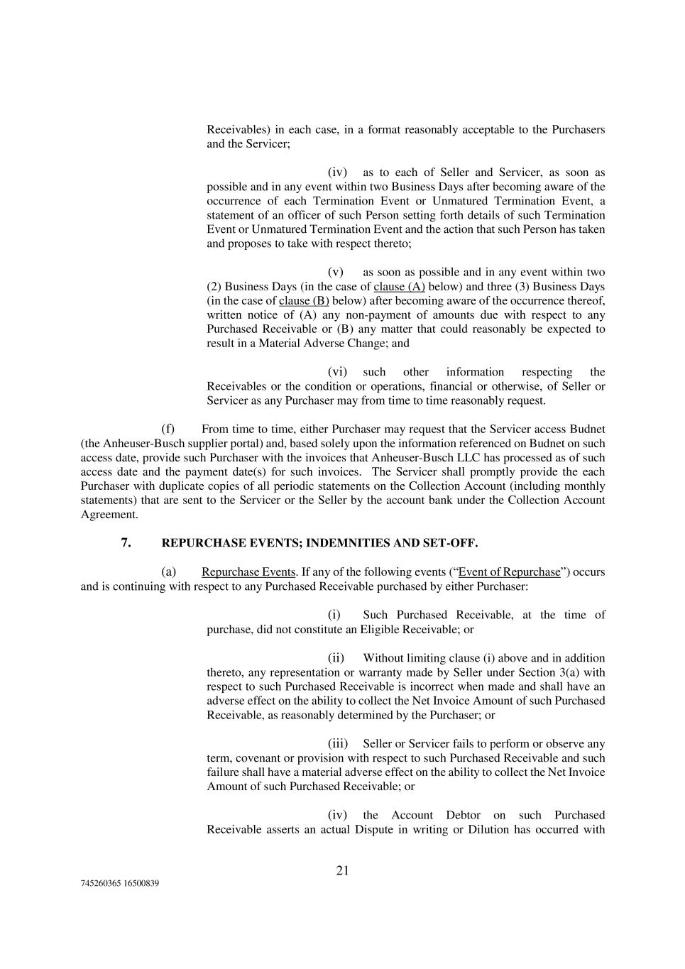 21 745260365 16500839 Receivables) in each case, in a format reasonably acceptable to the Purchasers and the Servicer; (iv) as to each of Seller and Servicer, as soon as possible and in any event within two Business Days after becoming aware of the occurrence of each Termination Event or Unmatured Termination Event, a statement of an officer of such Person setting forth details of such Termination Event or Unmatured Termination Event and the action that such Person has taken and proposes to take with respect thereto; (v) as soon as possible and in any event within two (2) Business Days (in the case of clause (A) below) and three (3) Business Days (in the case of clause (B) below) after becoming aware of the occurrence thereof, written notice of (A) any non-payment of amounts due with respect to any Purchased Receivable or (B) any matter that could reasonably be expected to result in a Material Adverse Change; and (vi) such other information respecting the Receivables or the condition or operations, financial or otherwise, of Seller or Servicer as any Purchaser may from time to time reasonably request. (f) From time to time, either Purchaser may request that the Servicer access Budnet (the Anheuser-Busch supplier portal) and, based solely upon the information referenced on Budnet on such access date, provide such Purchaser with the invoices that Anheuser-Busch LLC has processed as of such access date and the payment date(s) for such invoices. The Servicer shall promptly provide the each Purchaser with duplicate copies of all periodic statements on the Collection Account (including monthly statements) that are sent to the Servicer or the Seller by the account bank under the Collection Account Agreement. 7. REPURCHASE EVENTS; INDEMNITIES AND SET-OFF. (a) Repurchase Events. If any of the following events (“Event of Repurchase”) occurs and is continuing with respect to any Purchased Receivable purchased by either Purchaser: (i) Such Purchased Receivable, at the time of purchase, did not constitute an Eligible Receivable; or (ii) Without limiting clause (i) above and in addition thereto, any representation or warranty made by Seller under Section 3(a) with respect to such Purchased Receivable is incorrect when made and shall have an adverse effect on the ability to collect the Net Invoice Amount of such Purchased Receivable, as reasonably determined by the Purchaser; or (iii) Seller or Servicer fails to perform or observe any term, covenant or provision with respect to such Purchased Receivable and such failure shall have a material adverse effect on the ability to collect the Net Invoice Amount of such Purchased Receivable; or (iv) the Account Debtor on such Purchased Receivable asserts an actual Dispute in writing or Dilution has occurred with