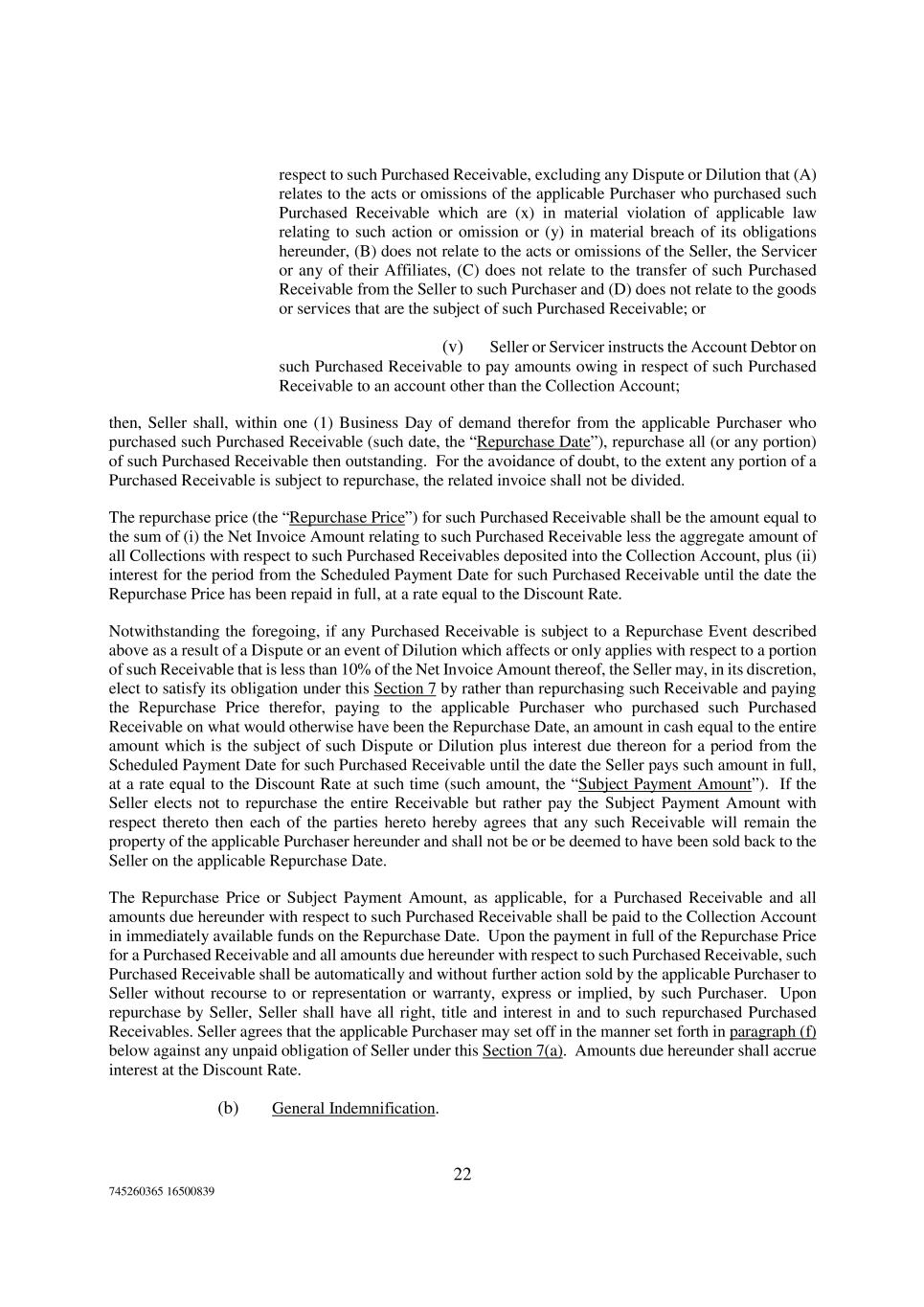 22 745260365 16500839 respect to such Purchased Receivable, excluding any Dispute or Dilution that (A) relates to the acts or omissions of the applicable Purchaser who purchased such Purchased Receivable which are (x) in material violation of applicable law relating to such action or omission or (y) in material breach of its obligations hereunder, (B) does not relate to the acts or omissions of the Seller, the Servicer or any of their Affiliates, (C) does not relate to the transfer of such Purchased Receivable from the Seller to such Purchaser and (D) does not relate to the goods or services that are the subject of such Purchased Receivable; or (v) Seller or Servicer instructs the Account Debtor on such Purchased Receivable to pay amounts owing in respect of such Purchased Receivable to an account other than the Collection Account; then, Seller shall, within one (1) Business Day of demand therefor from the applicable Purchaser who purchased such Purchased Receivable (such date, the “Repurchase Date”), repurchase all (or any portion) of such Purchased Receivable then outstanding. For the avoidance of doubt, to the extent any portion of a Purchased Receivable is subject to repurchase, the related invoice shall not be divided. The repurchase price (the “Repurchase Price”) for such Purchased Receivable shall be the amount equal to the sum of (i) the Net Invoice Amount relating to such Purchased Receivable less the aggregate amount of all Collections with respect to such Purchased Receivables deposited into the Collection Account, plus (ii) interest for the period from the Scheduled Payment Date for such Purchased Receivable until the date the Repurchase Price has been repaid in full, at a rate equal to the Discount Rate. Notwithstanding the foregoing, if any Purchased Receivable is subject to a Repurchase Event described above as a result of a Dispute or an event of Dilution which affects or only applies with respect to a portion of such Receivable that is less than 10% of the Net Invoice Amount thereof, the Seller may, in its discretion, elect to satisfy its obligation under this Section 7 by rather than repurchasing such Receivable and paying the Repurchase Price therefor, paying to the applicable Purchaser who purchased such Purchased Receivable on what would otherwise have been the Repurchase Date, an amount in cash equal to the entire amount which is the subject of such Dispute or Dilution plus interest due thereon for a period from the Scheduled Payment Date for such Purchased Receivable until the date the Seller pays such amount in full, at a rate equal to the Discount Rate at such time (such amount, the “Subject Payment Amount”). If the Seller elects not to repurchase the entire Receivable but rather pay the Subject Payment Amount with respect thereto then each of the parties hereto hereby agrees that any such Receivable will remain the property of the applicable Purchaser hereunder and shall not be or be deemed to have been sold back to the Seller on the applicable Repurchase Date. The Repurchase Price or Subject Payment Amount, as applicable, for a Purchased Receivable and all amounts due hereunder with respect to such Purchased Receivable shall be paid to the Collection Account in immediately available funds on the Repurchase Date. Upon the payment in full of the Repurchase Price for a Purchased Receivable and all amounts due hereunder with respect to such Purchased Receivable, such Purchased Receivable shall be automatically and without further action sold by the applicable Purchaser to Seller without recourse to or representation or warranty, express or implied, by such Purchaser. Upon repurchase by Seller, Seller shall have all right, title and interest in and to such repurchased Purchased Receivables. Seller agrees that the applicable Purchaser may set off in the manner set forth in paragraph (f) below against any unpaid obligation of Seller under this Section 7(a). Amounts due hereunder shall accrue interest at the Discount Rate. (b) General Indemnification.