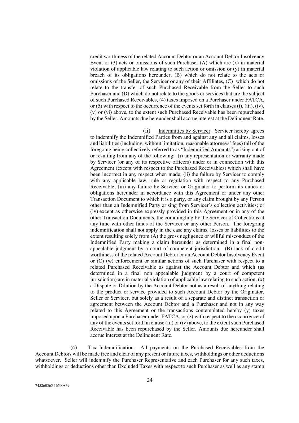 24 745260365 16500839 credit worthiness of the related Account Debtor or an Account Debtor Insolvency Event or (3) acts or omissions of such Purchaser (A) which are (x) in material violation of applicable law relating to such action or omission or (y) in material breach of its obligations hereunder, (B) which do not relate to the acts or omissions of the Seller, the Servicer or any of their Affiliates, (C) which do not relate to the transfer of such Purchased Receivable from the Seller to such Purchaser and (D) which do not relate to the goods or services that are the subject of such Purchased Receivables, (4) taxes imposed on a Purchaser under FATCA, or (5) with respect to the occurrence of the events set forth in clauses (i), (iii), (iv), (v) or (vi) above, to the extent such Purchased Receivable has been repurchased by the Seller. Amounts due hereunder shall accrue interest at the Delinquent Rate. (ii) Indemnities by Servicer. Servicer hereby agrees to indemnify the Indemnified Parties from and against any and all claims, losses and liabilities (including, without limitation, reasonable attorneys’ fees) (all of the foregoing being collectively referred to as “Indemnified Amounts”) arising out of or resulting from any of the following: (i) any representation or warranty made by Servicer (or any of its respective officers) under or in connection with this Agreement (except with respect to the Purchased Receivables) which shall have been incorrect in any respect when made; (ii) the failure by Servicer to comply with any applicable law, rule or regulation with respect to any Purchased Receivable; (iii) any failure by Servicer or Originator to perform its duties or obligations hereunder in accordance with this Agreement or under any other Transaction Document to which it is a party, or any claim brought by any Person other than an Indemnified Party arising from Servicer’s collection activities; or (iv) except as otherwise expressly provided in this Agreement or in any of the other Transaction Documents, the commingling by the Servicer of Collections at any time with other funds of the Servicer or any other Person. The foregoing indemnification shall not apply in the case any claims, losses or liabilities to the extent resulting solely from (A) the gross negligence or willful misconduct of the Indemnified Party making a claim hereunder as determined in a final non- appealable judgment by a court of competent jurisdiction, (B) lack of credit worthiness of the related Account Debtor or an Account Debtor Insolvency Event or (C) (w) enforcement or similar actions of such Purchaser with respect to a related Purchased Receivable as against the Account Debtor and which (as determined in a final non appealable judgment by a court of competent jurisdiction) are in material violation of applicable law relating to such action, (x) a Dispute or Dilution by the Account Debtor not as a result of anything relating to the product or service provided to such Account Debtor by the Originator, Seller or Servicer, but solely as a result of a separate and distinct transaction or agreement between the Account Debtor and a Purchaser and not in any way related to this Agreement or the transactions contemplated hereby (y) taxes imposed upon a Purchaser under FATCA, or (z) with respect to the occurrence of any of the events set forth in clause (iii) or (iv) above, to the extent such Purchased Receivable has been repurchased by the Seller. Amounts due hereunder shall accrue interest at the Delinquent Rate. (c) Tax Indemnification. All payments on the Purchased Receivables from the Account Debtors will be made free and clear of any present or future taxes, withholdings or other deductions whatsoever. Seller will indemnify the Purchaser Representative and each Purchaser for any such taxes, withholdings or deductions other than Excluded Taxes with respect to such Purchaser as well as any stamp