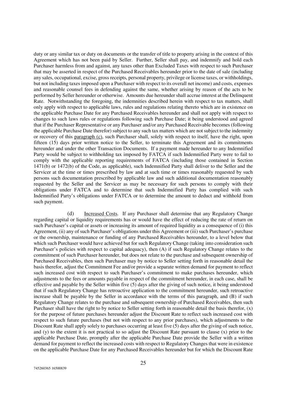 25 745260365 16500839 duty or any similar tax or duty on documents or the transfer of title to property arising in the context of this Agreement which has not been paid by Seller. Further, Seller shall pay, and indemnify and hold each Purchaser harmless from and against, any taxes other than Excluded Taxes with respect to such Purchaser that may be asserted in respect of the Purchased Receivables hereunder prior to the date of sale (including any sales, occupational, excise, gross receipts, personal property, privilege or license taxes, or withholdings, but not including taxes imposed upon a Purchaser with respect to its overall net income) and costs, expenses and reasonable counsel fees in defending against the same, whether arising by reason of the acts to be performed by Seller hereunder or otherwise. Amounts due hereunder shall accrue interest at the Delinquent Rate. Notwithstanding the foregoing, the indemnities described herein with respect to tax matters, shall only apply with respect to applicable laws, rules and regulations relating thereto which are in existence on the applicable Purchase Date for any Purchased Receivables hereunder and shall not apply with respect to changes to such laws rules or regulations following such Purchase Date; it being understood and agreed that if the Purchaser Representative or any Purchaser and/or any Purchased Receivable becomes (following the applicable Purchase Date therefor) subject to any such tax matters which are not subject to the indemnity or recovery of this paragraph (c), such Purchaser shall, solely with respect to itself, have the right, upon fifteen (15) days prior written notice to the Seller, to terminate this Agreement and its commitments hereunder and under the other Transaction Documents. If a payment made hereunder to any Indemnified Party would be subject to withholding tax imposed by FATCA if such Indemnified Party were to fail to comply with the applicable reporting requirements of FATCA (including those contained in Section 1471(b) or 1472(b) of the Code, as applicable), such Indemnified Party shall deliver to the Seller and the Servicer at the time or times prescribed by law and at such time or times reasonably requested by such persons such documentation prescribed by applicable law and such additional documentation reasonably requested by the Seller and the Servicer as may be necessary for such persons to comply with their obligations under FATCA and to determine that such Indemnified Party has complied with such Indemnified Party’s obligations under FATCA or to determine the amount to deduct and withhold from such payment. (d) Increased Costs. If any Purchaser shall determine that any Regulatory Change regarding capital or liquidity requirements has or would have the effect of reducing the rate of return on such Purchaser’s capital or assets or increasing its amount of required liquidity as a consequence of (i) this Agreement, (ii) any of such Purchaser’s obligations under this Agreement or (iii) such Purchaser’s purchase or the ownership, maintenance or funding of any Purchased Receivables hereunder, to a level below that which such Purchaser would have achieved but for such Regulatory Change (taking into consideration such Purchaser’s policies with respect to capital adequacy), then (A) if such Regulatory Change relates to the commitment of such Purchaser hereunder, but does not relate to the purchase and subsequent ownership of Purchased Receivables, then such Purchaser may by notice to Seller setting forth in reasonable detail the basis therefor, adjust the Commitment Fee and/or provide a separate written demand for payment to reflect such increased cost with respect to such Purchaser’s commitment to make purchases hereunder, which adjustments to the fees or amounts payable in respect of the commitment hereunder, in each case, shall be effective and payable by the Seller within five (5) days after the giving of such notice, it being understood that if such Regulatory Change has retroactive application to the commitment hereunder, such retroactive increase shall be payable by the Seller in accordance with the terms of this paragraph, and (B) if such Regulatory Change relates to the purchase and subsequent ownership of Purchased Receivables, then such Purchaser shall have the right to by notice to Seller setting forth in reasonable detail the basis therefor, (x) for the purpose of future purchases hereunder adjust the Discount Rate to reflect such increased cost with respect to such future purchases (but not with respect to any prior purchases), which adjustments to the Discount Rate shall apply solely to purchases occurring at least five (5) days after the giving of such notice, and (y) to the extent it is not practical to so adjust the Discount Rate pursuant to clause (x) prior to the applicable Purchase Date, promptly after the applicable Purchase Date provide the Seller with a written demand for payment to reflect the increased costs with respect to Regulatory Changes that were in existence on the applicable Purchase Date for any Purchased Receivables hereunder but for which the Discount Rate