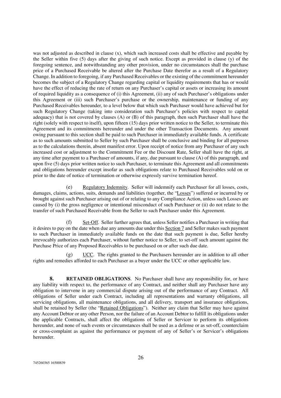 26 745260365 16500839 was not adjusted as described in clause (x), which such increased costs shall be effective and payable by the Seller within five (5) days after the giving of such notice. Except as provided in clause (y) of the foregoing sentence, and notwithstanding any other provision, under no circumstances shall the purchase price of a Purchased Receivable be altered after the Purchase Date therefor as a result of a Regulatory Change. In addition to foregoing, if any Purchased Receivables or the existing of the commitment hereunder becomes the subject of a Regulatory Change regarding capital or liquidity requirements that has or would have the effect of reducing the rate of return on any Purchaser’s capital or assets or increasing its amount of required liquidity as a consequence of (i) this Agreement, (ii) any of such Purchaser’s obligations under this Agreement or (iii) such Purchaser’s purchase or the ownership, maintenance or funding of any Purchased Receivables hereunder, to a level below that which such Purchaser would have achieved but for such Regulatory Change (taking into consideration such Purchaser’s policies with respect to capital adequacy) that is not covered by clauses (A) or (B) of this paragraph, then such Purchaser shall have the right (solely with respect to itself), upon fifteen (15) days prior written notice to the Seller, to terminate this Agreement and its commitments hereunder and under the other Transaction Documents. Any amount owing pursuant to this section shall be paid to such Purchaser in immediately available funds. A certificate as to such amounts submitted to Seller by such Purchaser shall be conclusive and binding for all purposes as to the calculations therein, absent manifest error. Upon receipt of notice from any Purchaser of any such increased cost or adjustment to the Commitment Fee or the Discount Rate, Seller shall have the right, at any time after payment to a Purchaser of amounts, if any, due pursuant to clause (A) of this paragraph, and upon five (5) days prior written notice to such Purchaser, to terminate this Agreement and all commitments and obligations hereunder except insofar as such obligations relate to Purchased Receivables sold on or prior to the date of notice of termination or otherwise expressly survive termination hereof. (e) Regulatory Indemnity. Seller will indemnify each Purchaser for all losses, costs, damages, claims, actions, suits, demands and liabilities (together, the “Losses”) suffered or incurred by or brought against such Purchaser arising out of or relating to any Compliance Action, unless such Losses are caused by (i) the gross negligence or intentional misconduct of such Purchaser or (ii) do not relate to the transfer of such Purchased Receivable from the Seller to such Purchaser under this Agreement. (f) Set-Off. Seller further agrees that, unless Seller notifies a Purchaser in writing that it desires to pay on the date when due any amounts due under this Section 7 and Seller makes such payment to such Purchaser in immediately available funds on the date that such payment is due, Seller hereby irrevocably authorizes each Purchaser, without further notice to Seller, to set-off such amount against the Purchase Price of any Proposed Receivables to be purchased on or after such due date. (g) UCC. The rights granted to the Purchasers hereunder are in addition to all other rights and remedies afforded to each Purchaser as a buyer under the UCC or other applicable law. 8. RETAINED OBLIGATIONS. No Purchaser shall have any responsibility for, or have any liability with respect to, the performance of any Contract, and neither shall any Purchaser have any obligation to intervene in any commercial dispute arising out of the performance of any Contract. All obligations of Seller under each Contract, including all representations and warranty obligations, all servicing obligations, all maintenance obligations, and all delivery, transport and insurance obligations, shall be retained by Seller (the “Retained Obligations”). Neither any claim that Seller may have against any Account Debtor or any other Person, nor the failure of an Account Debtor to fulfill its obligations under the applicable Contracts, shall affect the obligations of Seller or Servicer to perform its obligations hereunder, and none of such events or circumstances shall be used as a defense or as set-off, counterclaim or cross-complaint as against the performance or payment of any of Seller’s or Servicer’s obligations hereunder.