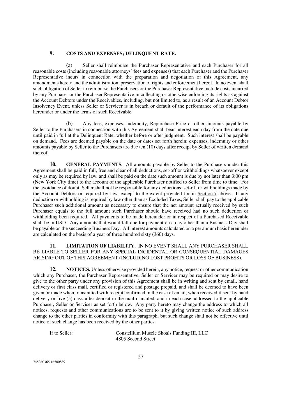 27 745260365 16500839 9. COSTS AND EXPENSES; DELINQUENT RATE. (a) Seller shall reimburse the Purchaser Representative and each Purchaser for all reasonable costs (including reasonable attorneys’ fees and expenses) that each Purchaser and the Purchaser Representative incurs in connection with the preparation and negotiation of this Agreement, any amendments hereto and the administration, preservation of rights and enforcement hereof. In no event shall such obligation of Seller to reimburse the Purchasers or the Purchaser Representative include costs incurred by any Purchaser or the Purchaser Representative in collecting or otherwise enforcing its rights as against the Account Debtors under the Receivables, including, but not limited to, as a result of an Account Debtor Insolvency Event, unless Seller or Servicer is in breach or default of the performance of its obligations hereunder or under the terms of such Receivable. (b) Any fees, expenses, indemnity, Repurchase Price or other amounts payable by Seller to the Purchasers in connection with this Agreement shall bear interest each day from the date due until paid in full at the Delinquent Rate, whether before or after judgment. Such interest shall be payable on demand. Fees are deemed payable on the date or dates set forth herein; expenses, indemnity or other amounts payable by Seller to the Purchasers are due ten (10) days after receipt by Seller of written demand thereof. 10. GENERAL PAYMENTS. All amounts payable by Seller to the Purchasers under this Agreement shall be paid in full, free and clear of all deductions, set-off or withholdings whatsoever except only as may be required by law, and shall be paid on the date such amount is due by not later than 3:00 pm (New York City time) to the account of the applicable Purchaser notified to Seller from time to time. For the avoidance of doubt, Seller shall not be responsible for any deductions, set-off or withholdings made by the Account Debtors or required by law, except to the extent provided for in Section 7 above. If any deduction or withholding is required by law other than as Excluded Taxes, Seller shall pay to the applicable Purchaser such additional amount as necessary to ensure that the net amount actually received by such Purchaser equals to the full amount such Purchaser should have received had no such deduction or withholding been required. All payments to be made hereunder or in respect of a Purchased Receivable shall be in USD. Any amounts that would fall due for payment on a day other than a Business Day shall be payable on the succeeding Business Day. All interest amounts calculated on a per annum basis hereunder are calculated on the basis of a year of three hundred sixty (360) days. 11. LIMITATION OF LIABILITY. IN NO EVENT SHALL ANY PURCHASER SHALL BE LIABLE TO SELLER FOR ANY SPECIAL INCIDENTAL OR CONSEQUENTIAL DAMAGES ARISING OUT OF THIS AGREEMENT (INCLUDING LOST PROFITS OR LOSS OF BUSINESS). 12. NOTICES. Unless otherwise provided herein, any notice, request or other communication which any Purchaser, the Purchaser Representative, Seller or Servicer may be required or may desire to give to the other party under any provision of this Agreement shall be in writing and sent by email, hand delivery or first class mail, certified or registered and postage prepaid, and shall be deemed to have been given or made when transmitted with receipt confirmed in the case of email, when received if sent by hand delivery or five (5) days after deposit in the mail if mailed, and in each case addressed to the applicable Purchaser, Seller or Servicer as set forth below. Any party hereto may change the address to which all notices, requests and other communications are to be sent to it by giving written notice of such address change to the other parties in conformity with this paragraph, but such change shall not be effective until notice of such change has been received by the other parties. If to Seller: Constellium Muscle Shoals Funding III, LLC 4805 Second Street