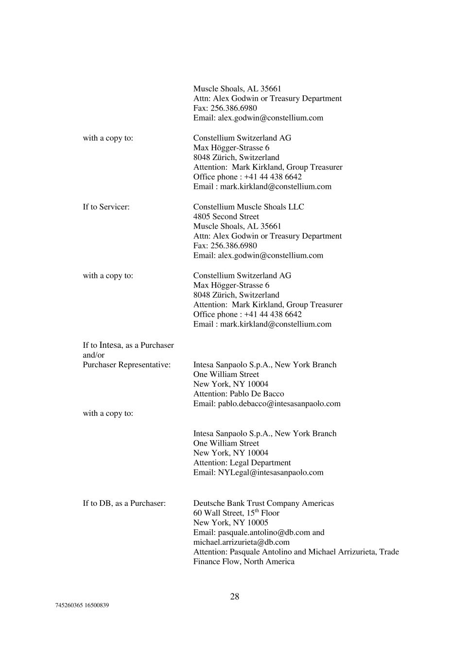 28 745260365 16500839 Muscle Shoals, AL 35661 Attn: Alex Godwin or Treasury Department Fax: 256.386.6980 Email: alex.godwin@constellium.com with a copy to: Constellium Switzerland AG Max Högger-Strasse 6 8048 Zürich, Switzerland Attention: Mark Kirkland, Group Treasurer Office phone : +41 44 438 6642 Email : mark.kirkland@constellium.com If to Servicer: Constellium Muscle Shoals LLC 4805 Second Street Muscle Shoals, AL 35661 Attn: Alex Godwin or Treasury Department Fax: 256.386.6980 Email: alex.godwin@constellium.com with a copy to: Constellium Switzerland AG Max Högger-Strasse 6 8048 Zürich, Switzerland Attention: Mark Kirkland, Group Treasurer Office phone : +41 44 438 6642 Email : mark.kirkland@constellium.com If to Intesa, as a Purchaser and/or Purchaser Representative: Intesa Sanpaolo S.p.A., New York Branch One William Street New York, NY 10004 Attention: Pablo De Bacco Email: pablo.debacco@intesasanpaolo.com with a copy to: Intesa Sanpaolo S.p.A., New York Branch One William Street New York, NY 10004 Attention: Legal Department Email: NYLegal@intesasanpaolo.com If to DB, as a Purchaser: Deutsche Bank Trust Company Americas 60 Wall Street, 15th Floor New York, NY 10005 Email: pasquale.antolino@db.com and michael.arrizurieta@db.com Attention: Pasquale Antolino and Michael Arrizurieta, Trade Finance Flow, North America
