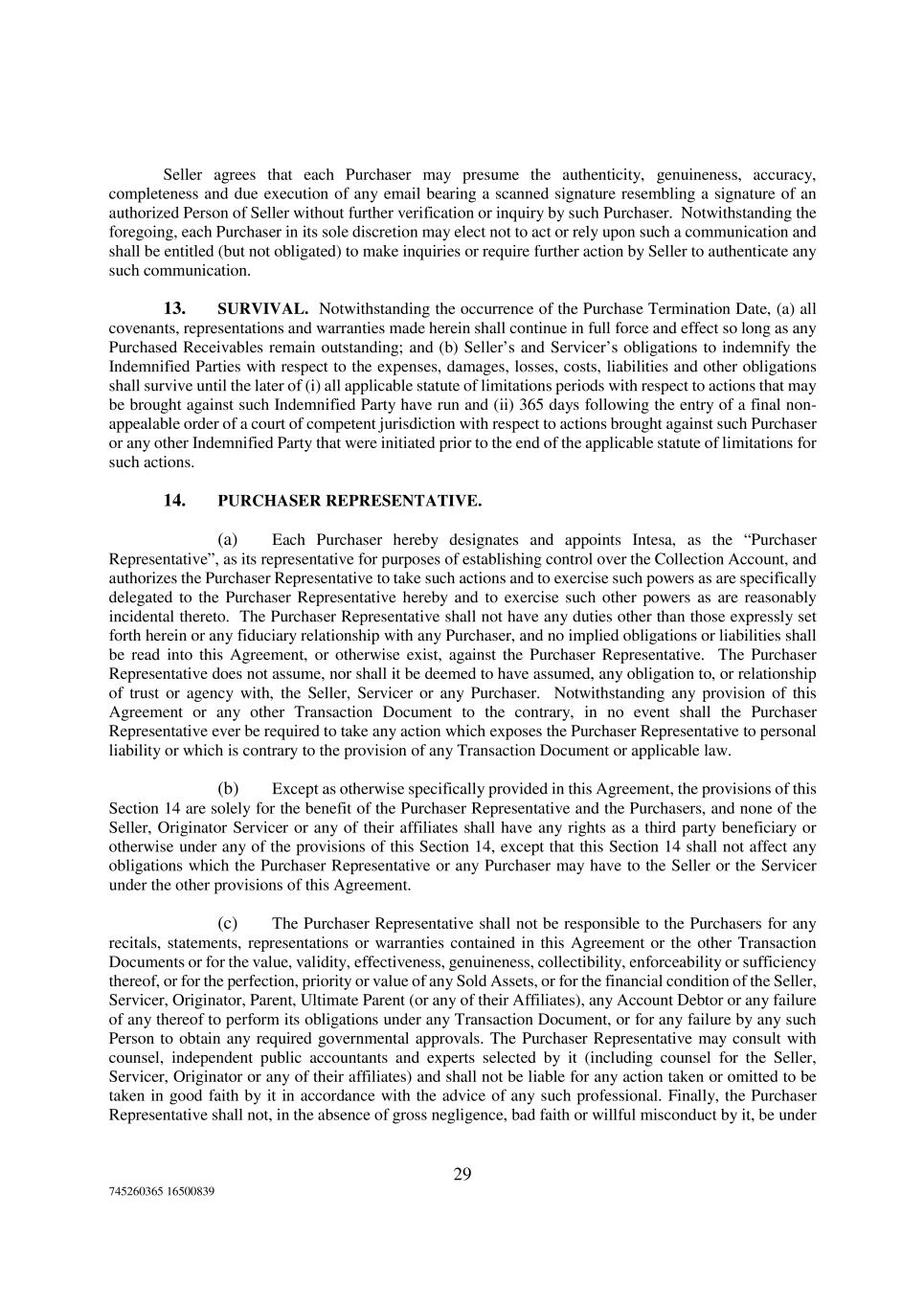 29 745260365 16500839 Seller agrees that each Purchaser may presume the authenticity, genuineness, accuracy, completeness and due execution of any email bearing a scanned signature resembling a signature of an authorized Person of Seller without further verification or inquiry by such Purchaser. Notwithstanding the foregoing, each Purchaser in its sole discretion may elect not to act or rely upon such a communication and shall be entitled (but not obligated) to make inquiries or require further action by Seller to authenticate any such communication. 13. SURVIVAL. Notwithstanding the occurrence of the Purchase Termination Date, (a) all covenants, representations and warranties made herein shall continue in full force and effect so long as any Purchased Receivables remain outstanding; and (b) Seller’s and Servicer’s obligations to indemnify the Indemnified Parties with respect to the expenses, damages, losses, costs, liabilities and other obligations shall survive until the later of (i) all applicable statute of limitations periods with respect to actions that may be brought against such Indemnified Party have run and (ii) 365 days following the entry of a final non- appealable order of a court of competent jurisdiction with respect to actions brought against such Purchaser or any other Indemnified Party that were initiated prior to the end of the applicable statute of limitations for such actions. 14. PURCHASER REPRESENTATIVE. (a) Each Purchaser hereby designates and appoints Intesa, as the “Purchaser Representative”, as its representative for purposes of establishing control over the Collection Account, and authorizes the Purchaser Representative to take such actions and to exercise such powers as are specifically delegated to the Purchaser Representative hereby and to exercise such other powers as are reasonably incidental thereto. The Purchaser Representative shall not have any duties other than those expressly set forth herein or any fiduciary relationship with any Purchaser, and no implied obligations or liabilities shall be read into this Agreement, or otherwise exist, against the Purchaser Representative. The Purchaser Representative does not assume, nor shall it be deemed to have assumed, any obligation to, or relationship of trust or agency with, the Seller, Servicer or any Purchaser. Notwithstanding any provision of this Agreement or any other Transaction Document to the contrary, in no event shall the Purchaser Representative ever be required to take any action which exposes the Purchaser Representative to personal liability or which is contrary to the provision of any Transaction Document or applicable law. (b) Except as otherwise specifically provided in this Agreement, the provisions of this Section 14 are solely for the benefit of the Purchaser Representative and the Purchasers, and none of the Seller, Originator Servicer or any of their affiliates shall have any rights as a third party beneficiary or otherwise under any of the provisions of this Section 14, except that this Section 14 shall not affect any obligations which the Purchaser Representative or any Purchaser may have to the Seller or the Servicer under the other provisions of this Agreement. (c) The Purchaser Representative shall not be responsible to the Purchasers for any recitals, statements, representations or warranties contained in this Agreement or the other Transaction Documents or for the value, validity, effectiveness, genuineness, collectibility, enforceability or sufficiency thereof, or for the perfection, priority or value of any Sold Assets, or for the financial condition of the Seller, Servicer, Originator, Parent, Ultimate Parent (or any of their Affiliates), any Account Debtor or any failure of any thereof to perform its obligations under any Transaction Document, or for any failure by any such Person to obtain any required governmental approvals. The Purchaser Representative may consult with counsel, independent public accountants and experts selected by it (including counsel for the Seller, Servicer, Originator or any of their affiliates) and shall not be liable for any action taken or omitted to be taken in good faith by it in accordance with the advice of any such professional. Finally, the Purchaser Representative shall not, in the absence of gross negligence, bad faith or willful misconduct by it, be under
