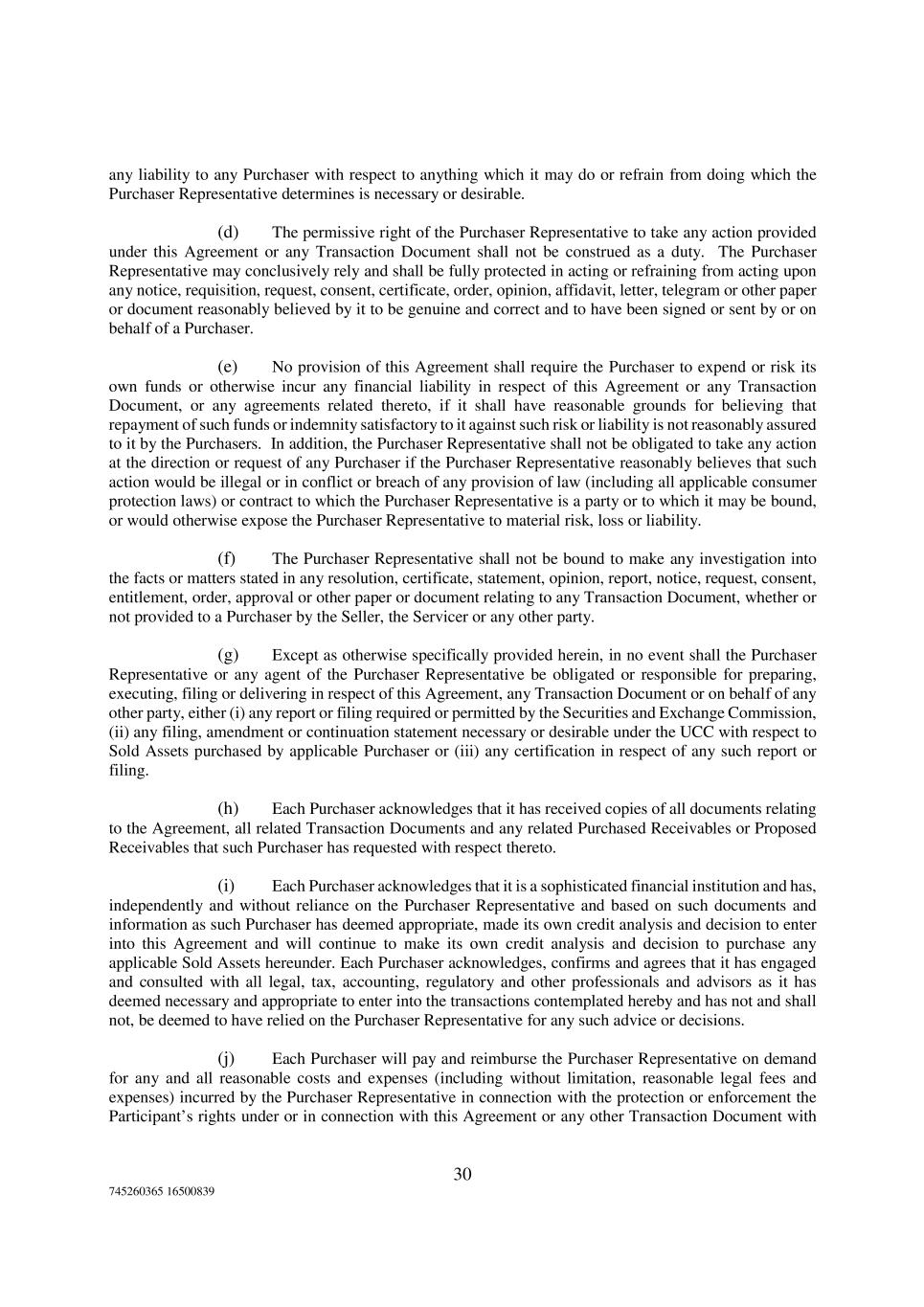 30 745260365 16500839 any liability to any Purchaser with respect to anything which it may do or refrain from doing which the Purchaser Representative determines is necessary or desirable. (d) The permissive right of the Purchaser Representative to take any action provided under this Agreement or any Transaction Document shall not be construed as a duty. The Purchaser Representative may conclusively rely and shall be fully protected in acting or refraining from acting upon any notice, requisition, request, consent, certificate, order, opinion, affidavit, letter, telegram or other paper or document reasonably believed by it to be genuine and correct and to have been signed or sent by or on behalf of a Purchaser. (e) No provision of this Agreement shall require the Purchaser to expend or risk its own funds or otherwise incur any financial liability in respect of this Agreement or any Transaction Document, or any agreements related thereto, if it shall have reasonable grounds for believing that repayment of such funds or indemnity satisfactory to it against such risk or liability is not reasonably assured to it by the Purchasers. In addition, the Purchaser Representative shall not be obligated to take any action at the direction or request of any Purchaser if the Purchaser Representative reasonably believes that such action would be illegal or in conflict or breach of any provision of law (including all applicable consumer protection laws) or contract to which the Purchaser Representative is a party or to which it may be bound, or would otherwise expose the Purchaser Representative to material risk, loss or liability. (f) The Purchaser Representative shall not be bound to make any investigation into the facts or matters stated in any resolution, certificate, statement, opinion, report, notice, request, consent, entitlement, order, approval or other paper or document relating to any Transaction Document, whether or not provided to a Purchaser by the Seller, the Servicer or any other party. (g) Except as otherwise specifically provided herein, in no event shall the Purchaser Representative or any agent of the Purchaser Representative be obligated or responsible for preparing, executing, filing or delivering in respect of this Agreement, any Transaction Document or on behalf of any other party, either (i) any report or filing required or permitted by the Securities and Exchange Commission, (ii) any filing, amendment or continuation statement necessary or desirable under the UCC with respect to Sold Assets purchased by applicable Purchaser or (iii) any certification in respect of any such report or filing. (h) Each Purchaser acknowledges that it has received copies of all documents relating to the Agreement, all related Transaction Documents and any related Purchased Receivables or Proposed Receivables that such Purchaser has requested with respect thereto. (i) Each Purchaser acknowledges that it is a sophisticated financial institution and has, independently and without reliance on the Purchaser Representative and based on such documents and information as such Purchaser has deemed appropriate, made its own credit analysis and decision to enter into this Agreement and will continue to make its own credit analysis and decision to purchase any applicable Sold Assets hereunder. Each Purchaser acknowledges, confirms and agrees that it has engaged and consulted with all legal, tax, accounting, regulatory and other professionals and advisors as it has deemed necessary and appropriate to enter into the transactions contemplated hereby and has not and shall not, be deemed to have relied on the Purchaser Representative for any such advice or decisions. (j) Each Purchaser will pay and reimburse the Purchaser Representative on demand for any and all reasonable costs and expenses (including without limitation, reasonable legal fees and expenses) incurred by the Purchaser Representative in connection with the protection or enforcement the Participant’s rights under or in connection with this Agreement or any other Transaction Document with