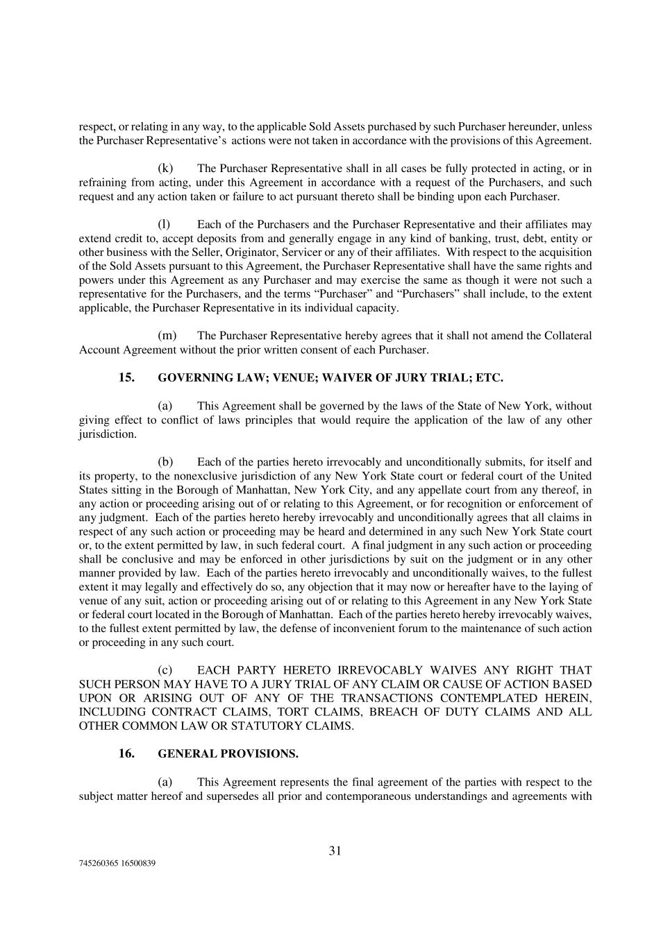 31 745260365 16500839 respect, or relating in any way, to the applicable Sold Assets purchased by such Purchaser hereunder, unless the Purchaser Representative’s actions were not taken in accordance with the provisions of this Agreement. (k) The Purchaser Representative shall in all cases be fully protected in acting, or in refraining from acting, under this Agreement in accordance with a request of the Purchasers, and such request and any action taken or failure to act pursuant thereto shall be binding upon each Purchaser. (l) Each of the Purchasers and the Purchaser Representative and their affiliates may extend credit to, accept deposits from and generally engage in any kind of banking, trust, debt, entity or other business with the Seller, Originator, Servicer or any of their affiliates. With respect to the acquisition of the Sold Assets pursuant to this Agreement, the Purchaser Representative shall have the same rights and powers under this Agreement as any Purchaser and may exercise the same as though it were not such a representative for the Purchasers, and the terms “Purchaser” and “Purchasers” shall include, to the extent applicable, the Purchaser Representative in its individual capacity. (m) The Purchaser Representative hereby agrees that it shall not amend the Collateral Account Agreement without the prior written consent of each Purchaser. 15. GOVERNING LAW; VENUE; WAIVER OF JURY TRIAL; ETC. (a) This Agreement shall be governed by the laws of the State of New York, without giving effect to conflict of laws principles that would require the application of the law of any other jurisdiction. (b) Each of the parties hereto irrevocably and unconditionally submits, for itself and its property, to the nonexclusive jurisdiction of any New York State court or federal court of the United States sitting in the Borough of Manhattan, New York City, and any appellate court from any thereof, in any action or proceeding arising out of or relating to this Agreement, or for recognition or enforcement of any judgment. Each of the parties hereto hereby irrevocably and unconditionally agrees that all claims in respect of any such action or proceeding may be heard and determined in any such New York State court or, to the extent permitted by law, in such federal court. A final judgment in any such action or proceeding shall be conclusive and may be enforced in other jurisdictions by suit on the judgment or in any other manner provided by law. Each of the parties hereto irrevocably and unconditionally waives, to the fullest extent it may legally and effectively do so, any objection that it may now or hereafter have to the laying of venue of any suit, action or proceeding arising out of or relating to this Agreement in any New York State or federal court located in the Borough of Manhattan. Each of the parties hereto hereby irrevocably waives, to the fullest extent permitted by law, the defense of inconvenient forum to the maintenance of such action or proceeding in any such court. (c) EACH PARTY HERETO IRREVOCABLY WAIVES ANY RIGHT THAT SUCH PERSON MAY HAVE TO A JURY TRIAL OF ANY CLAIM OR CAUSE OF ACTION BASED UPON OR ARISING OUT OF ANY OF THE TRANSACTIONS CONTEMPLATED HEREIN, INCLUDING CONTRACT CLAIMS, TORT CLAIMS, BREACH OF DUTY CLAIMS AND ALL OTHER COMMON LAW OR STATUTORY CLAIMS. 16. GENERAL PROVISIONS. (a) This Agreement represents the final agreement of the parties with respect to the subject matter hereof and supersedes all prior and contemporaneous understandings and agreements with