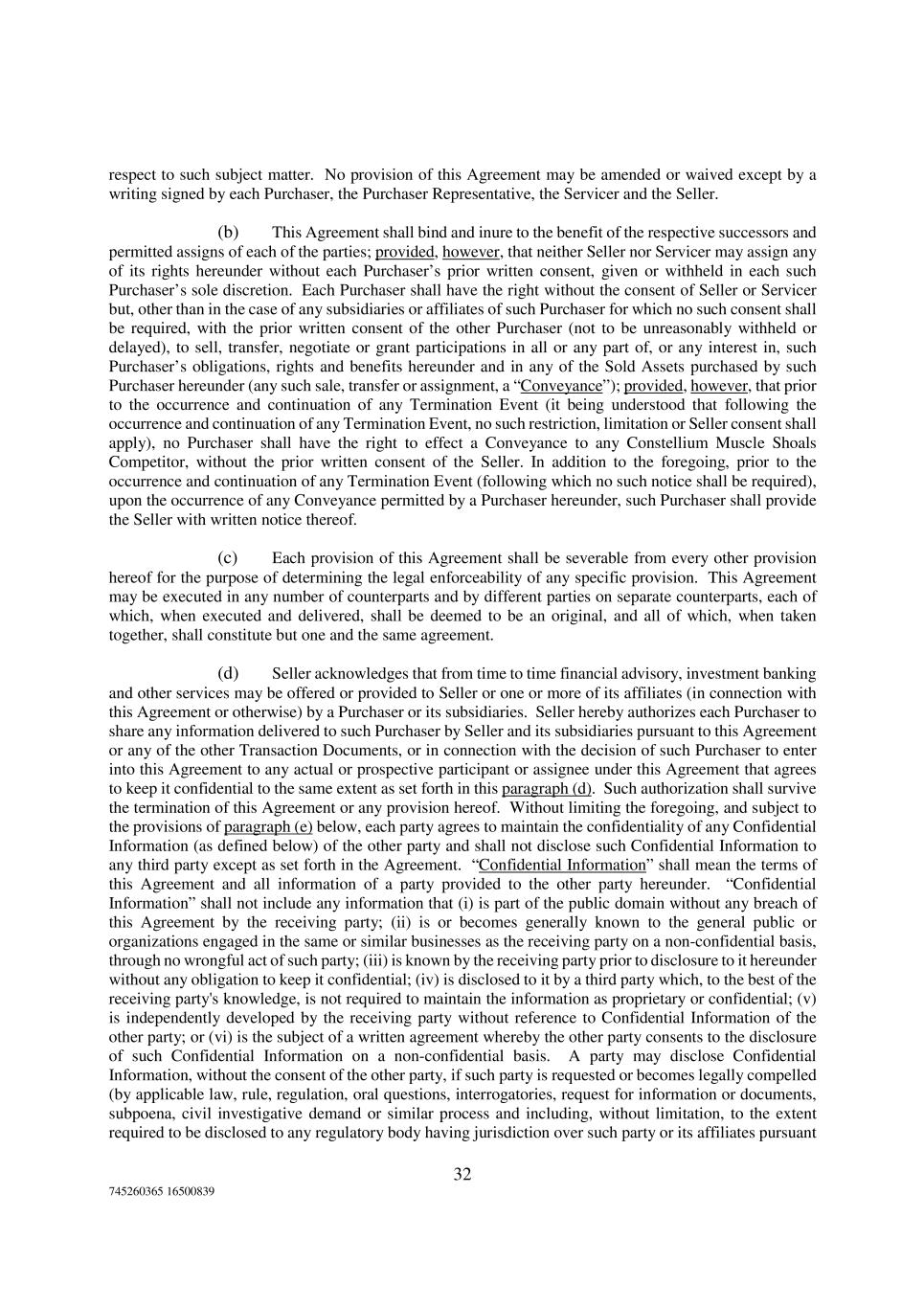 32 745260365 16500839 respect to such subject matter. No provision of this Agreement may be amended or waived except by a writing signed by each Purchaser, the Purchaser Representative, the Servicer and the Seller. (b) This Agreement shall bind and inure to the benefit of the respective successors and permitted assigns of each of the parties; provided, however, that neither Seller nor Servicer may assign any of its rights hereunder without each Purchaser’s prior written consent, given or withheld in each such Purchaser’s sole discretion. Each Purchaser shall have the right without the consent of Seller or Servicer but, other than in the case of any subsidiaries or affiliates of such Purchaser for which no such consent shall be required, with the prior written consent of the other Purchaser (not to be unreasonably withheld or delayed), to sell, transfer, negotiate or grant participations in all or any part of, or any interest in, such Purchaser’s obligations, rights and benefits hereunder and in any of the Sold Assets purchased by such Purchaser hereunder (any such sale, transfer or assignment, a “Conveyance”); provided, however, that prior to the occurrence and continuation of any Termination Event (it being understood that following the occurrence and continuation of any Termination Event, no such restriction, limitation or Seller consent shall apply), no Purchaser shall have the right to effect a Conveyance to any Constellium Muscle Shoals Competitor, without the prior written consent of the Seller. In addition to the foregoing, prior to the occurrence and continuation of any Termination Event (following which no such notice shall be required), upon the occurrence of any Conveyance permitted by a Purchaser hereunder, such Purchaser shall provide the Seller with written notice thereof. (c) Each provision of this Agreement shall be severable from every other provision hereof for the purpose of determining the legal enforceability of any specific provision. This Agreement may be executed in any number of counterparts and by different parties on separate counterparts, each of which, when executed and delivered, shall be deemed to be an original, and all of which, when taken together, shall constitute but one and the same agreement. (d) Seller acknowledges that from time to time financial advisory, investment banking and other services may be offered or provided to Seller or one or more of its affiliates (in connection with this Agreement or otherwise) by a Purchaser or its subsidiaries. Seller hereby authorizes each Purchaser to share any information delivered to such Purchaser by Seller and its subsidiaries pursuant to this Agreement or any of the other Transaction Documents, or in connection with the decision of such Purchaser to enter into this Agreement to any actual or prospective participant or assignee under this Agreement that agrees to keep it confidential to the same extent as set forth in this paragraph (d). Such authorization shall survive the termination of this Agreement or any provision hereof. Without limiting the foregoing, and subject to the provisions of paragraph (e) below, each party agrees to maintain the confidentiality of any Confidential Information (as defined below) of the other party and shall not disclose such Confidential Information to any third party except as set forth in the Agreement. “Confidential Information” shall mean the terms of this Agreement and all information of a party provided to the other party hereunder. “Confidential Information” shall not include any information that (i) is part of the public domain without any breach of this Agreement by the receiving party; (ii) is or becomes generally known to the general public or organizations engaged in the same or similar businesses as the receiving party on a non-confidential basis, through no wrongful act of such party; (iii) is known by the receiving party prior to disclosure to it hereunder without any obligation to keep it confidential; (iv) is disclosed to it by a third party which, to the best of the receiving party's knowledge, is not required to maintain the information as proprietary or confidential; (v) is independently developed by the receiving party without reference to Confidential Information of the other party; or (vi) is the subject of a written agreement whereby the other party consents to the disclosure of such Confidential Information on a non-confidential basis. A party may disclose Confidential Information, without the consent of the other party, if such party is requested or becomes legally compelled (by applicable law, rule, regulation, oral questions, interrogatories, request for information or documents, subpoena, civil investigative demand or similar process and including, without limitation, to the extent required to be disclosed to any regulatory body having jurisdiction over such party or its affiliates pursuant