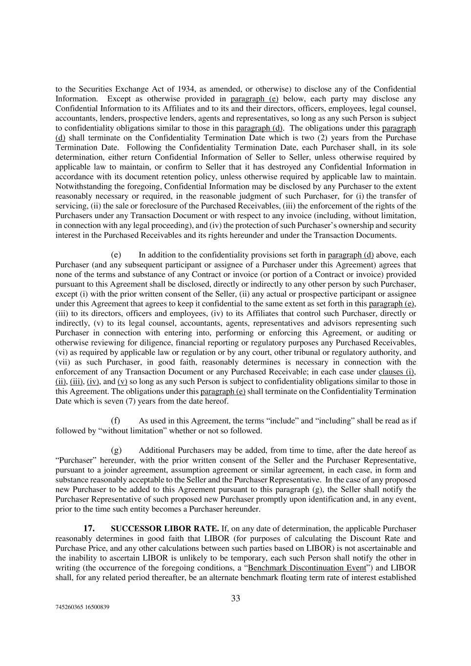33 745260365 16500839 to the Securities Exchange Act of 1934, as amended, or otherwise) to disclose any of the Confidential Information. Except as otherwise provided in paragraph (e) below, each party may disclose any Confidential Information to its Affiliates and to its and their directors, officers, employees, legal counsel, accountants, lenders, prospective lenders, agents and representatives, so long as any such Person is subject to confidentiality obligations similar to those in this paragraph (d). The obligations under this paragraph (d) shall terminate on the Confidentiality Termination Date which is two (2) years from the Purchase Termination Date. Following the Confidentiality Termination Date, each Purchaser shall, in its sole determination, either return Confidential Information of Seller to Seller, unless otherwise required by applicable law to maintain, or confirm to Seller that it has destroyed any Confidential Information in accordance with its document retention policy, unless otherwise required by applicable law to maintain. Notwithstanding the foregoing, Confidential Information may be disclosed by any Purchaser to the extent reasonably necessary or required, in the reasonable judgment of such Purchaser, for (i) the transfer of servicing, (ii) the sale or foreclosure of the Purchased Receivables, (iii) the enforcement of the rights of the Purchasers under any Transaction Document or with respect to any invoice (including, without limitation, in connection with any legal proceeding), and (iv) the protection of such Purchaser’s ownership and security interest in the Purchased Receivables and its rights hereunder and under the Transaction Documents. (e) In addition to the confidentiality provisions set forth in paragraph (d) above, each Purchaser (and any subsequent participant or assignee of a Purchaser under this Agreement) agrees that none of the terms and substance of any Contract or invoice (or portion of a Contract or invoice) provided pursuant to this Agreement shall be disclosed, directly or indirectly to any other person by such Purchaser, except (i) with the prior written consent of the Seller, (ii) any actual or prospective participant or assignee under this Agreement that agrees to keep it confidential to the same extent as set forth in this paragraph (e), (iii) to its directors, officers and employees, (iv) to its Affiliates that control such Purchaser, directly or indirectly, (v) to its legal counsel, accountants, agents, representatives and advisors representing such Purchaser in connection with entering into, performing or enforcing this Agreement, or auditing or otherwise reviewing for diligence, financial reporting or regulatory purposes any Purchased Receivables, (vi) as required by applicable law or regulation or by any court, other tribunal or regulatory authority, and (vii) as such Purchaser, in good faith, reasonably determines is necessary in connection with the enforcement of any Transaction Document or any Purchased Receivable; in each case under clauses (i), (ii), (iii), (iv), and (v) so long as any such Person is subject to confidentiality obligations similar to those in this Agreement. The obligations under this paragraph (e) shall terminate on the Confidentiality Termination Date which is seven (7) years from the date hereof. (f) As used in this Agreement, the terms “include” and “including” shall be read as if followed by “without limitation” whether or not so followed. (g) Additional Purchasers may be added, from time to time, after the date hereof as “Purchaser” hereunder, with the prior written consent of the Seller and the Purchaser Representative, pursuant to a joinder agreement, assumption agreement or similar agreement, in each case, in form and substance reasonably acceptable to the Seller and the Purchaser Representative. In the case of any proposed new Purchaser to be added to this Agreement pursuant to this paragraph (g), the Seller shall notify the Purchaser Representative of such proposed new Purchaser promptly upon identification and, in any event, prior to the time such entity becomes a Purchaser hereunder. 17. SUCCESSOR LIBOR RATE. If, on any date of determination, the applicable Purchaser reasonably determines in good faith that LIBOR (for purposes of calculating the Discount Rate and Purchase Price, and any other calculations between such parties based on LIBOR) is not ascertainable and the inability to ascertain LIBOR is unlikely to be temporary, each such Person shall notify the other in writing (the occurrence of the foregoing conditions, a “Benchmark Discontinuation Event”) and LIBOR shall, for any related period thereafter, be an alternate benchmark floating term rate of interest established