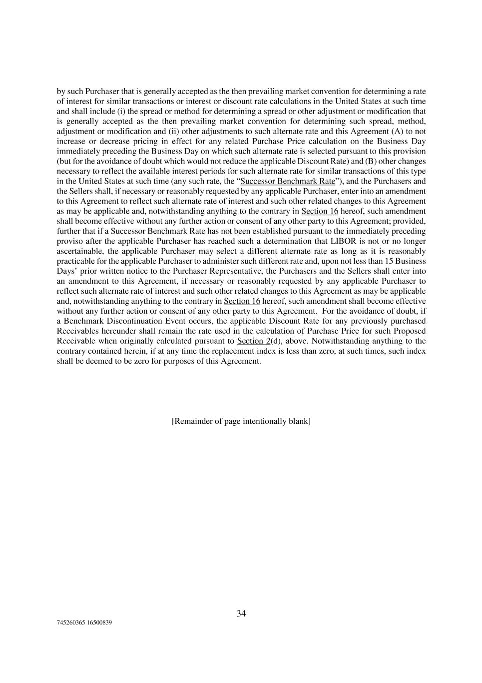 34 745260365 16500839 by such Purchaser that is generally accepted as the then prevailing market convention for determining a rate of interest for similar transactions or interest or discount rate calculations in the United States at such time and shall include (i) the spread or method for determining a spread or other adjustment or modification that is generally accepted as the then prevailing market convention for determining such spread, method, adjustment or modification and (ii) other adjustments to such alternate rate and this Agreement (A) to not increase or decrease pricing in effect for any related Purchase Price calculation on the Business Day immediately preceding the Business Day on which such alternate rate is selected pursuant to this provision (but for the avoidance of doubt which would not reduce the applicable Discount Rate) and (B) other changes necessary to reflect the available interest periods for such alternate rate for similar transactions of this type in the United States at such time (any such rate, the “Successor Benchmark Rate”), and the Purchasers and the Sellers shall, if necessary or reasonably requested by any applicable Purchaser, enter into an amendment to this Agreement to reflect such alternate rate of interest and such other related changes to this Agreement as may be applicable and, notwithstanding anything to the contrary in Section 16 hereof, such amendment shall become effective without any further action or consent of any other party to this Agreement; provided, further that if a Successor Benchmark Rate has not been established pursuant to the immediately preceding proviso after the applicable Purchaser has reached such a determination that LIBOR is not or no longer ascertainable, the applicable Purchaser may select a different alternate rate as long as it is reasonably practicable for the applicable Purchaser to administer such different rate and, upon not less than 15 Business Days’ prior written notice to the Purchaser Representative, the Purchasers and the Sellers shall enter into an amendment to this Agreement, if necessary or reasonably requested by any applicable Purchaser to reflect such alternate rate of interest and such other related changes to this Agreement as may be applicable and, notwithstanding anything to the contrary in Section 16 hereof, such amendment shall become effective without any further action or consent of any other party to this Agreement. For the avoidance of doubt, if a Benchmark Discontinuation Event occurs, the applicable Discount Rate for any previously purchased Receivables hereunder shall remain the rate used in the calculation of Purchase Price for such Proposed Receivable when originally calculated pursuant to Section 2(d), above. Notwithstanding anything to the contrary contained herein, if at any time the replacement index is less than zero, at such times, such index shall be deemed to be zero for purposes of this Agreement. [Remainder of page intentionally blank]