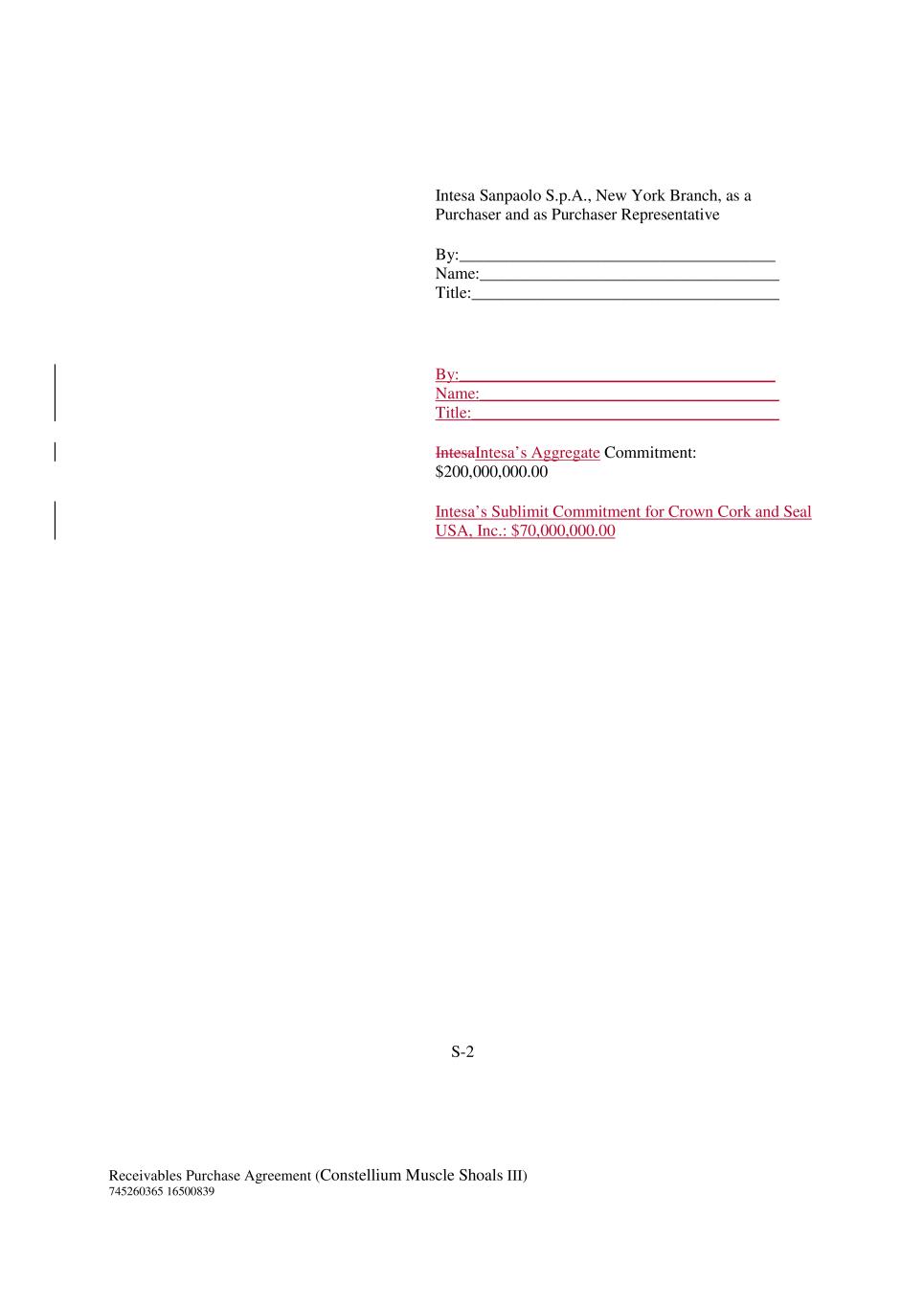S-2 Receivables Purchase Agreement (Constellium Muscle Shoals III) 745260365 16500839 Intesa Sanpaolo S.p.A., New York Branch, as a Purchaser and as Purchaser Representative By:______________________________________ Name:____________________________________ Title:_____________________________________ By:______________________________________ Name:____________________________________ Title:_____________________________________ IntesaIntesa’s Aggregate Commitment: $200,000,000.00 Intesa’s Sublimit Commitment for Crown Cork and Seal USA, Inc.: $70,000,000.00