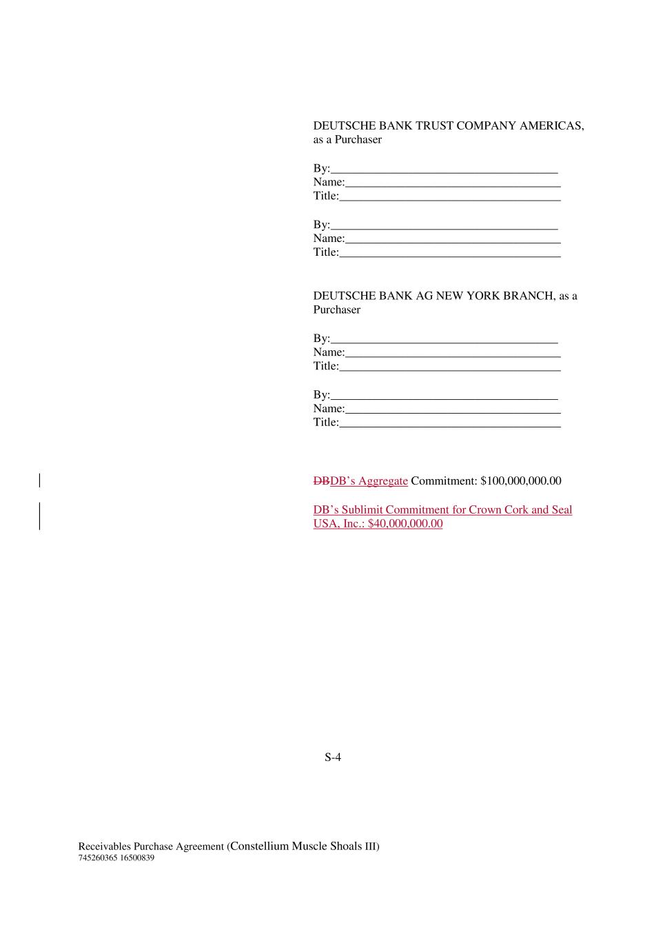 S-4 Receivables Purchase Agreement (Constellium Muscle Shoals III) 745260365 16500839 DEUTSCHE BANK TRUST COMPANY AMERICAS, as a Purchaser By:______________________________________ Name:____________________________________ Title:_____________________________________ By:______________________________________ Name:____________________________________ Title:_____________________________________ DEUTSCHE BANK AG NEW YORK BRANCH, as a Purchaser By:______________________________________ Name:____________________________________ Title:_____________________________________ By:______________________________________ Name:____________________________________ Title:_____________________________________ DBDB’s Aggregate Commitment: $100,000,000.00 DB’s Sublimit Commitment for Crown Cork and Seal USA, Inc.: $40,000,000.00