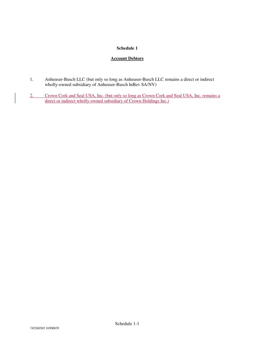 Schedule 1-1 745260365 16500839 Schedule 1 Account Debtors 1. Anheuser-Busch LLC (but only so long as Anheuser-Busch LLC remains a direct or indirect wholly-owned subsidiary of Anheuser-Busch InBev SA/NV) 2. Crown Cork and Seal USA, Inc. (but only so long as Crown Cork and Seal USA, Inc. remains a direct or indirect wholly-owned subsidiary of Crown Holdings Inc.)
