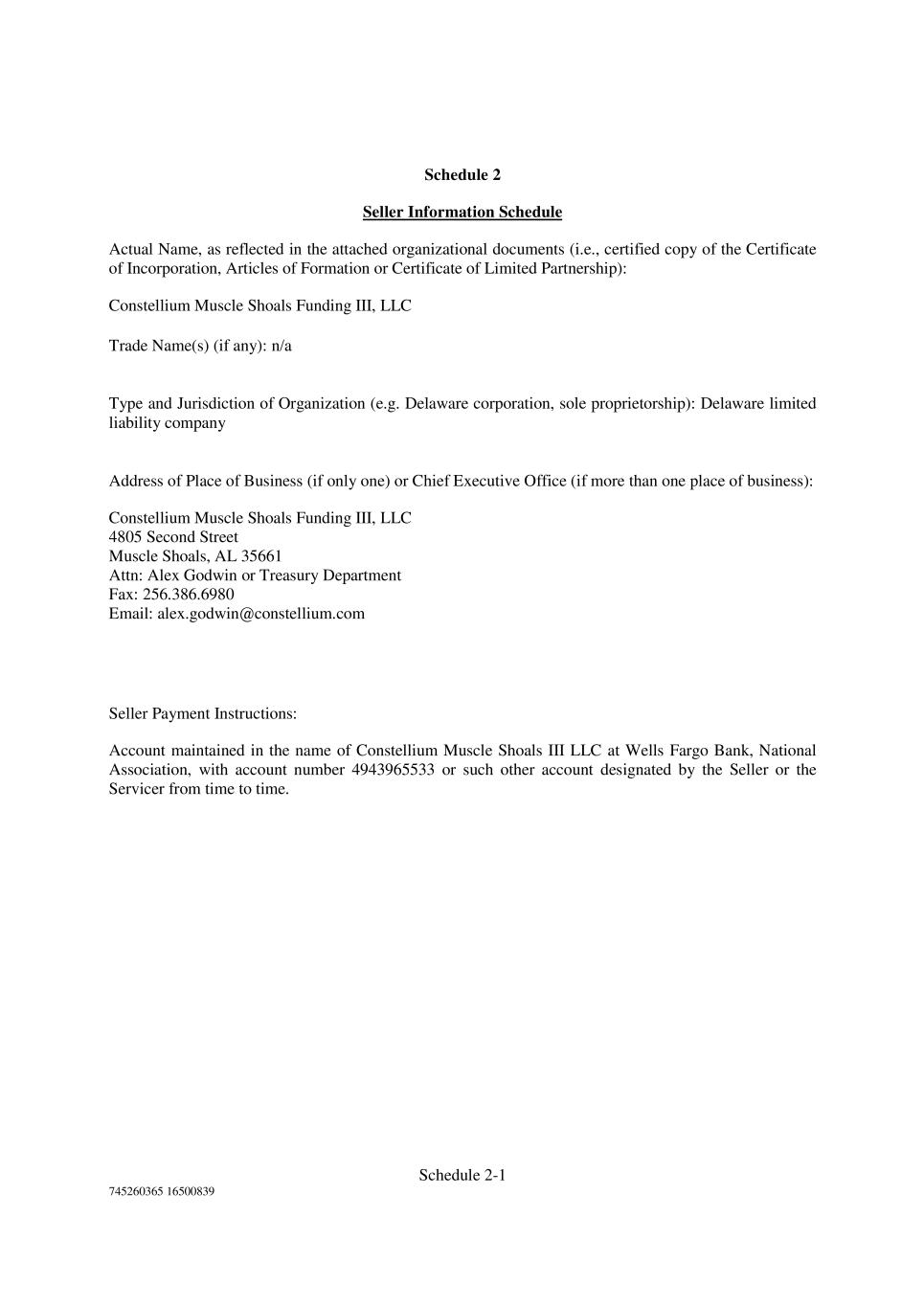 Schedule 2-1 745260365 16500839 Schedule 2 Seller Information Schedule Actual Name, as reflected in the attached organizational documents (i.e., certified copy of the Certificate of Incorporation, Articles of Formation or Certificate of Limited Partnership): Constellium Muscle Shoals Funding III, LLC Trade Name(s) (if any): n/a Type and Jurisdiction of Organization (e.g. Delaware corporation, sole proprietorship): Delaware limited liability company Address of Place of Business (if only one) or Chief Executive Office (if more than one place of business): Constellium Muscle Shoals Funding III, LLC 4805 Second Street Muscle Shoals, AL 35661 Attn: Alex Godwin or Treasury Department Fax: 256.386.6980 Email: alex.godwin@constellium.com Seller Payment Instructions: Account maintained in the name of Constellium Muscle Shoals III LLC at Wells Fargo Bank, National Association, with account number 4943965533 or such other account designated by the Seller or the Servicer from time to time.