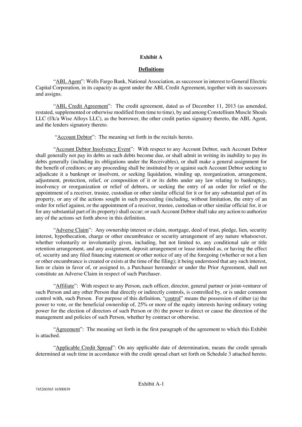 Exhibit A-1 745260365 16500839 Exhibit A Definitions “ABL Agent”: Wells Fargo Bank, National Association, as successor in interest to General Electric Capital Corporation, in its capacity as agent under the ABL Credit Agreement, together with its successors and assigns. “ABL Credit Agreement”: The credit agreement, dated as of December 11, 2013 (as amended, restated, supplemented or otherwise modified from time to time), by and among Constellium Muscle Shoals LLC (f/k/a Wise Alloys LLC), as the borrower, the other credit parties signatory thereto, the ABL Agent, and the lenders signatory thereto. “Account Debtor”: The meaning set forth in the recitals hereto. “Account Debtor Insolvency Event”: With respect to any Account Debtor, such Account Debtor shall generally not pay its debts as such debts become due, or shall admit in writing its inability to pay its debts generally (including its obligations under the Receivables), or shall make a general assignment for the benefit of creditors; or any proceeding shall be instituted by or against such Account Debtor seeking to adjudicate it a bankrupt or insolvent, or seeking liquidation, winding up, reorganization, arrangement, adjustment, protection, relief, or composition of it or its debts under any law relating to bankruptcy, insolvency or reorganization or relief of debtors, or seeking the entry of an order for relief or the appointment of a receiver, trustee, custodian or other similar official for it or for any substantial part of its property, or any of the actions sought in such proceeding (including, without limitation, the entry of an order for relief against, or the appointment of a receiver, trustee, custodian or other similar official for, it or for any substantial part of its property) shall occur; or such Account Debtor shall take any action to authorize any of the actions set forth above in this definition. “Adverse Claim”: Any ownership interest or claim, mortgage, deed of trust, pledge, lien, security interest, hypothecation, charge or other encumbrance or security arrangement of any nature whatsoever, whether voluntarily or involuntarily given, including, but not limited to, any conditional sale or title retention arrangement, and any assignment, deposit arrangement or lease intended as, or having the effect of, security and any filed financing statement or other notice of any of the foregoing (whether or not a lien or other encumbrance is created or exists at the time of the filing); it being understood that any such interest, lien or claim in favor of, or assigned to, a Purchaser hereunder or under the Prior Agreement, shall not constitute an Adverse Claim in respect of such Purchaser. “Affiliate”: With respect to any Person, each officer, director, general partner or joint-venturer of such Person and any other Person that directly or indirectly controls, is controlled by, or is under common control with, such Person. For purpose of this definition, “control” means the possession of either (a) the power to vote, or the beneficial ownership of, 25% or more of the equity interests having ordinary voting power for the election of directors of such Person or (b) the power to direct or cause the direction of the management and policies of such Person, whether by contract or otherwise. “Agreement”: The meaning set forth in the first paragraph of the agreement to which this Exhibit is attached. “Applicable Credit Spread”: On any applicable date of determination, means the credit spreads determined at such time in accordance with the credit spread chart set forth on Schedule 3 attached hereto.