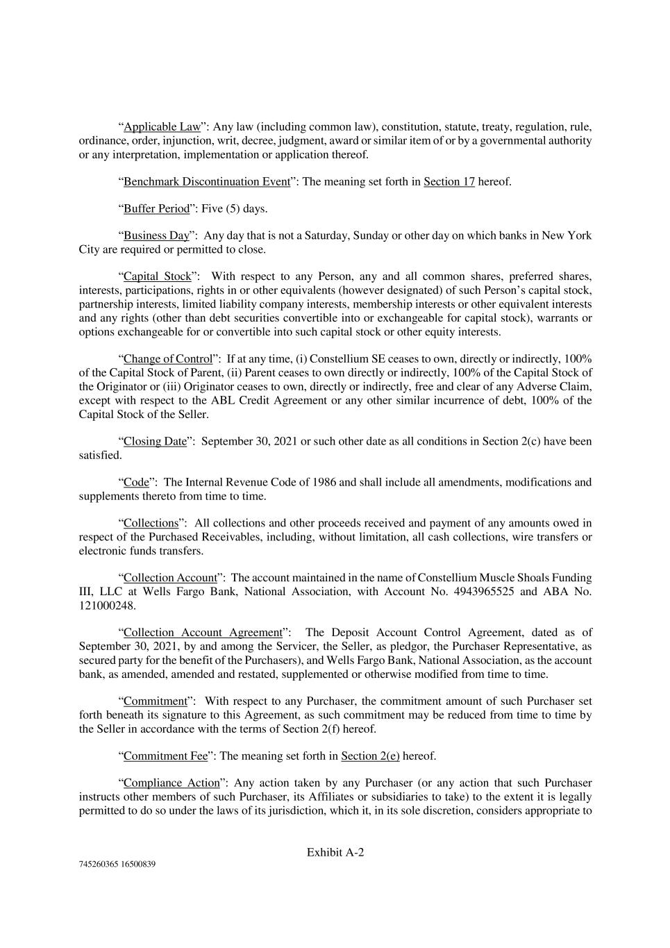 Exhibit A-2 745260365 16500839 “Applicable Law”: Any law (including common law), constitution, statute, treaty, regulation, rule, ordinance, order, injunction, writ, decree, judgment, award or similar item of or by a governmental authority or any interpretation, implementation or application thereof. “Benchmark Discontinuation Event”: The meaning set forth in Section 17 hereof. “Buffer Period”: Five (5) days. “Business Day”: Any day that is not a Saturday, Sunday or other day on which banks in New York City are required or permitted to close. “Capital Stock”: With respect to any Person, any and all common shares, preferred shares, interests, participations, rights in or other equivalents (however designated) of such Person’s capital stock, partnership interests, limited liability company interests, membership interests or other equivalent interests and any rights (other than debt securities convertible into or exchangeable for capital stock), warrants or options exchangeable for or convertible into such capital stock or other equity interests. “Change of Control”: If at any time, (i) Constellium SE ceases to own, directly or indirectly, 100% of the Capital Stock of Parent, (ii) Parent ceases to own directly or indirectly, 100% of the Capital Stock of the Originator or (iii) Originator ceases to own, directly or indirectly, free and clear of any Adverse Claim, except with respect to the ABL Credit Agreement or any other similar incurrence of debt, 100% of the Capital Stock of the Seller. “Closing Date”: September 30, 2021 or such other date as all conditions in Section 2(c) have been satisfied. “Code”: The Internal Revenue Code of 1986 and shall include all amendments, modifications and supplements thereto from time to time. “Collections”: All collections and other proceeds received and payment of any amounts owed in respect of the Purchased Receivables, including, without limitation, all cash collections, wire transfers or electronic funds transfers. “Collection Account”: The account maintained in the name of Constellium Muscle Shoals Funding III, LLC at Wells Fargo Bank, National Association, with Account No. 4943965525 and ABA No. 121000248. “Collection Account Agreement”: The Deposit Account Control Agreement, dated as of September 30, 2021, by and among the Servicer, the Seller, as pledgor, the Purchaser Representative, as secured party for the benefit of the Purchasers), and Wells Fargo Bank, National Association, as the account bank, as amended, amended and restated, supplemented or otherwise modified from time to time. “Commitment”: With respect to any Purchaser, the commitment amount of such Purchaser set forth beneath its signature to this Agreement, as such commitment may be reduced from time to time by the Seller in accordance with the terms of Section 2(f) hereof. “Commitment Fee”: The meaning set forth in Section 2(e) hereof. “Compliance Action”: Any action taken by any Purchaser (or any action that such Purchaser instructs other members of such Purchaser, its Affiliates or subsidiaries to take) to the extent it is legally permitted to do so under the laws of its jurisdiction, which it, in its sole discretion, considers appropriate to