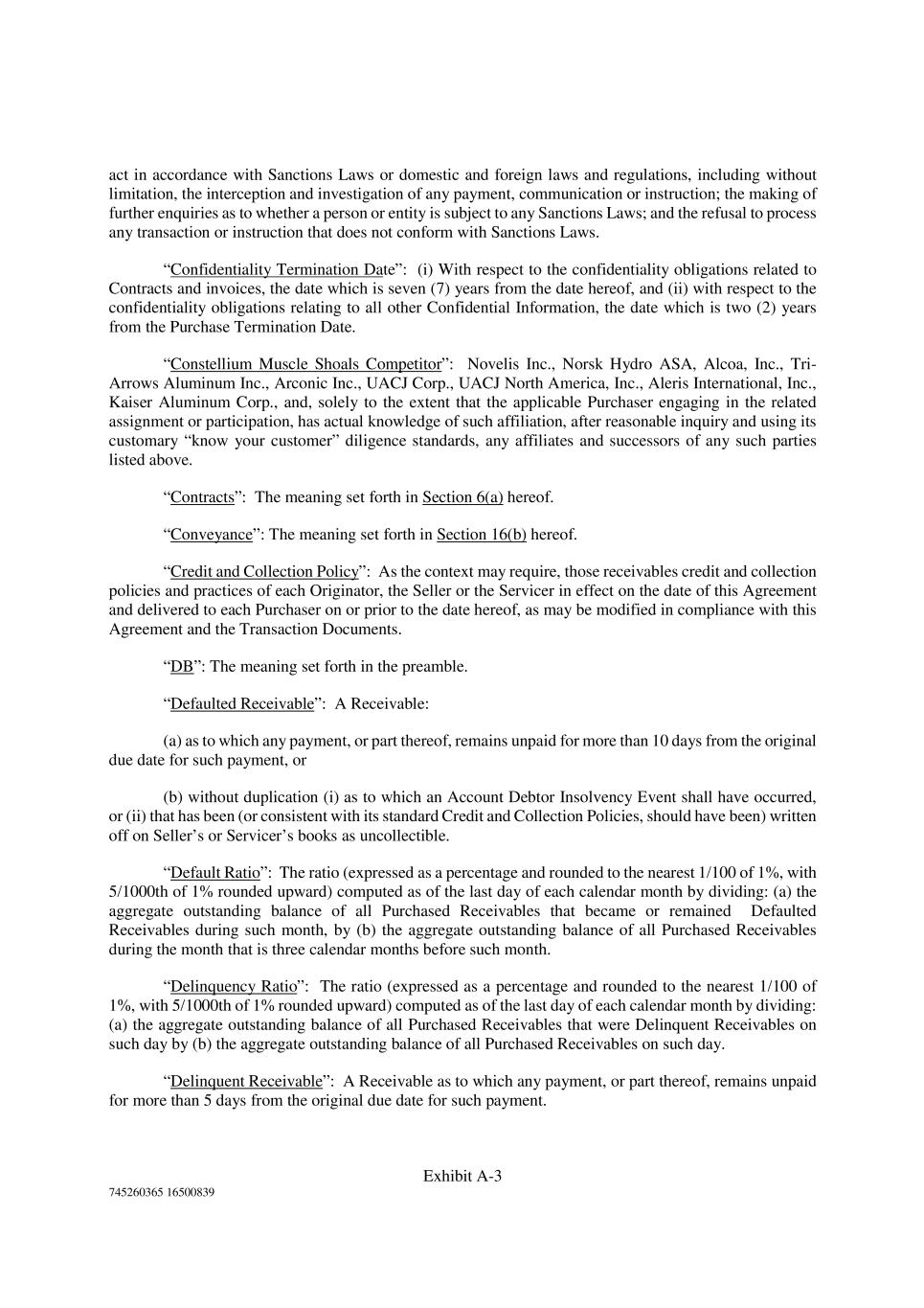 Exhibit A-3 745260365 16500839 act in accordance with Sanctions Laws or domestic and foreign laws and regulations, including without limitation, the interception and investigation of any payment, communication or instruction; the making of further enquiries as to whether a person or entity is subject to any Sanctions Laws; and the refusal to process any transaction or instruction that does not conform with Sanctions Laws. “Confidentiality Termination Date”: (i) With respect to the confidentiality obligations related to Contracts and invoices, the date which is seven (7) years from the date hereof, and (ii) with respect to the confidentiality obligations relating to all other Confidential Information, the date which is two (2) years from the Purchase Termination Date. “Constellium Muscle Shoals Competitor”: Novelis Inc., Norsk Hydro ASA, Alcoa, Inc., Tri- Arrows Aluminum Inc., Arconic Inc., UACJ Corp., UACJ North America, Inc., Aleris International, Inc., Kaiser Aluminum Corp., and, solely to the extent that the applicable Purchaser engaging in the related assignment or participation, has actual knowledge of such affiliation, after reasonable inquiry and using its customary “know your customer” diligence standards, any affiliates and successors of any such parties listed above. “Contracts”: The meaning set forth in Section 6(a) hereof. “Conveyance”: The meaning set forth in Section 16(b) hereof. “Credit and Collection Policy”: As the context may require, those receivables credit and collection policies and practices of each Originator, the Seller or the Servicer in effect on the date of this Agreement and delivered to each Purchaser on or prior to the date hereof, as may be modified in compliance with this Agreement and the Transaction Documents. “DB”: The meaning set forth in the preamble. “Defaulted Receivable”: A Receivable: (a) as to which any payment, or part thereof, remains unpaid for more than 10 days from the original due date for such payment, or (b) without duplication (i) as to which an Account Debtor Insolvency Event shall have occurred, or (ii) that has been (or consistent with its standard Credit and Collection Policies, should have been) written off on Seller’s or Servicer’s books as uncollectible. “Default Ratio”: The ratio (expressed as a percentage and rounded to the nearest 1/100 of 1%, with 5/1000th of 1% rounded upward) computed as of the last day of each calendar month by dividing: (a) the aggregate outstanding balance of all Purchased Receivables that became or remained Defaulted Receivables during such month, by (b) the aggregate outstanding balance of all Purchased Receivables during the month that is three calendar months before such month. “Delinquency Ratio”: The ratio (expressed as a percentage and rounded to the nearest 1/100 of 1%, with 5/1000th of 1% rounded upward) computed as of the last day of each calendar month by dividing: (a) the aggregate outstanding balance of all Purchased Receivables that were Delinquent Receivables on such day by (b) the aggregate outstanding balance of all Purchased Receivables on such day. “Delinquent Receivable”: A Receivable as to which any payment, or part thereof, remains unpaid for more than 5 days from the original due date for such payment.
