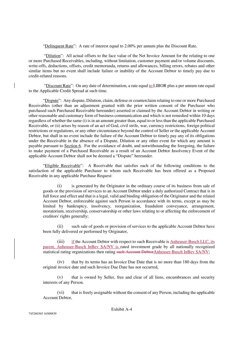 Exhibit A-4 745260365 16500839 “Delinquent Rate”: A rate of interest equal to 2.00% per annum plus the Discount Rate. “Dilution”: All actual offsets to the face value of the Net Invoice Amount for the relating to one or more Purchased Receivables, including, without limitation, customer payment and/or volume discounts, write-offs, deductions, offsets, credit memoranda, returns and allowances, billing errors, rebates and other similar items but no event shall include failure or inability of the Account Debtor to timely pay due to credit-related reasons. “Discount Rate”: On any date of determination, a rate equal to LIBOR plus a per annum rate equal to the Applicable Credit Spread at such time. “Dispute”: Any dispute, Dilution, claim, defense or counterclaim relating to one or more Purchased Receivables (other than an adjustment granted with the prior written consent of the Purchaser who purchased such Purchased Receivable hereunder) asserted or claimed by the Account Debtor in writing or other reasonable and customary form of business communication and which is not remedied within 10 days regardless of whether the same (i) is in an amount greater than, equal to or less than the applicable Purchased Receivable, or (ii) arises by reason of an act of God, civil strife, war, currency restrictions, foreign political restrictions or regulations, or any other circumstance beyond the control of Seller or the applicable Account Debtor, but shall in no event include the failure of the Account Debtor to timely pay any of its obligations under the Receivable in the absence of a Dispute, Dilution or any other event for which any amount is payable pursuant to Section 6. For the avoidance of doubt, and notwithstanding the foregoing, the failure to make payment of a Purchased Receivable as a result of an Account Debtor Insolvency Event of the applicable Account Debtor shall not be deemed a “Dispute” hereunder. “Eligible Receivable”: A Receivable that satisfies each of the following conditions to the satisfaction of the applicable Purchaser to whom such Receivable has been offered as a Proposed Receivable in any applicable Purchase Request: (i) is generated by the Originator in the ordinary course of its business from sale of goods or the provision of services to an Account Debtor under a duly authorized Contract that is in full force and effect and that is a legal, valid and binding obligation of the Originator and the related Account Debtor, enforceable against such Person in accordance with its terms, except as may be limited by bankruptcy, insolvency, reorganization, fraudulent conveyance, arrangement, moratorium, receivership, conservatorship or other laws relating to or affecting the enforcement of creditors' rights generally; (ii) such sale of goods or provision of services to the applicable Account Debtor have been fully delivered or performed by Originator, (iii) if the Account Debtor with respect to such Receivable is Anheuser-Busch LLC, its parent, Anheuser-Busch InBev SA/NV is rated investment grade by all nationally recognized statistical rating organizations then rating such Account DebtorAnheuser-Busch InBev SA/NV; (iv) that by its terms has an Invoice Due Date that is no more than 180 days from the original invoice date and such Invoice Due Date has not occurred, (v) that is owned by Seller, free and clear of all liens, encumbrances and security interests of any Person. (vi) that is freely assignable without the consent of any Person, including the applicable Account Debtor,