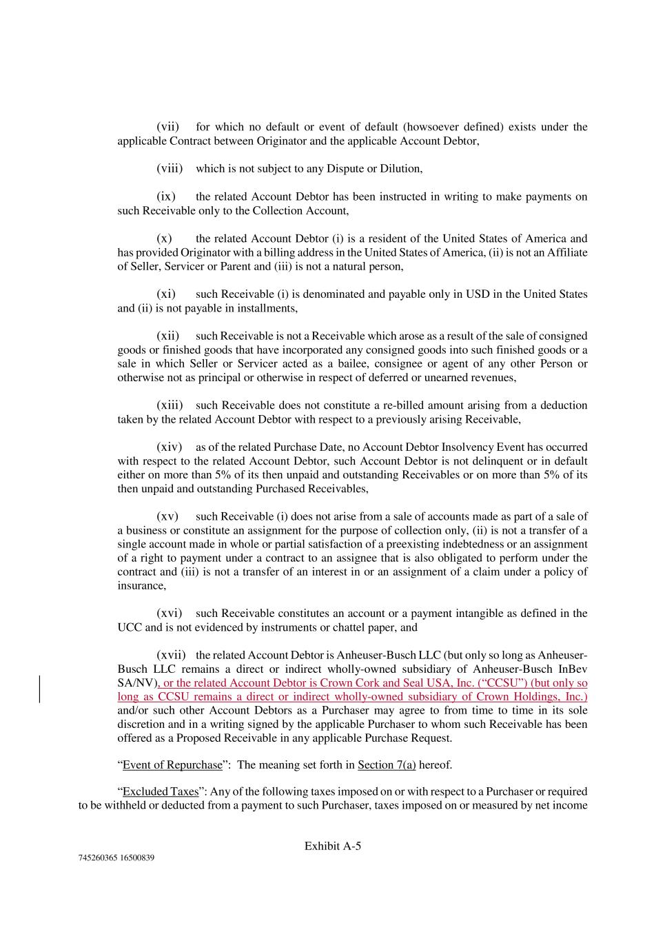 Exhibit A-5 745260365 16500839 (vii) for which no default or event of default (howsoever defined) exists under the applicable Contract between Originator and the applicable Account Debtor, (viii) which is not subject to any Dispute or Dilution, (ix) the related Account Debtor has been instructed in writing to make payments on such Receivable only to the Collection Account, (x) the related Account Debtor (i) is a resident of the United States of America and has provided Originator with a billing address in the United States of America, (ii) is not an Affiliate of Seller, Servicer or Parent and (iii) is not a natural person, (xi) such Receivable (i) is denominated and payable only in USD in the United States and (ii) is not payable in installments, (xii) such Receivable is not a Receivable which arose as a result of the sale of consigned goods or finished goods that have incorporated any consigned goods into such finished goods or a sale in which Seller or Servicer acted as a bailee, consignee or agent of any other Person or otherwise not as principal or otherwise in respect of deferred or unearned revenues, (xiii) such Receivable does not constitute a re-billed amount arising from a deduction taken by the related Account Debtor with respect to a previously arising Receivable, (xiv) as of the related Purchase Date, no Account Debtor Insolvency Event has occurred with respect to the related Account Debtor, such Account Debtor is not delinquent or in default either on more than 5% of its then unpaid and outstanding Receivables or on more than 5% of its then unpaid and outstanding Purchased Receivables, (xv) such Receivable (i) does not arise from a sale of accounts made as part of a sale of a business or constitute an assignment for the purpose of collection only, (ii) is not a transfer of a single account made in whole or partial satisfaction of a preexisting indebtedness or an assignment of a right to payment under a contract to an assignee that is also obligated to perform under the contract and (iii) is not a transfer of an interest in or an assignment of a claim under a policy of insurance, (xvi) such Receivable constitutes an account or a payment intangible as defined in the UCC and is not evidenced by instruments or chattel paper, and (xvii) the related Account Debtor is Anheuser-Busch LLC (but only so long as Anheuser- Busch LLC remains a direct or indirect wholly-owned subsidiary of Anheuser-Busch InBev SA/NV), or the related Account Debtor is Crown Cork and Seal USA, Inc. (“CCSU”) (but only so long as CCSU remains a direct or indirect wholly-owned subsidiary of Crown Holdings, Inc.) and/or such other Account Debtors as a Purchaser may agree to from time to time in its sole discretion and in a writing signed by the applicable Purchaser to whom such Receivable has been offered as a Proposed Receivable in any applicable Purchase Request. “Event of Repurchase”: The meaning set forth in Section 7(a) hereof. “Excluded Taxes”: Any of the following taxes imposed on or with respect to a Purchaser or required to be withheld or deducted from a payment to such Purchaser, taxes imposed on or measured by net income